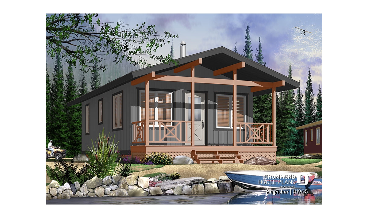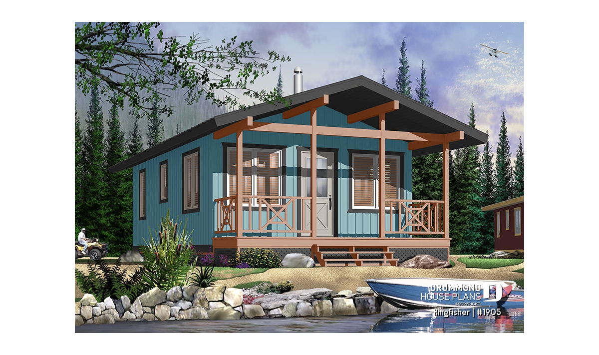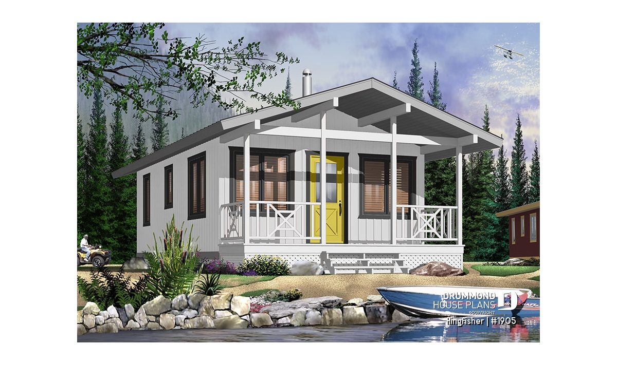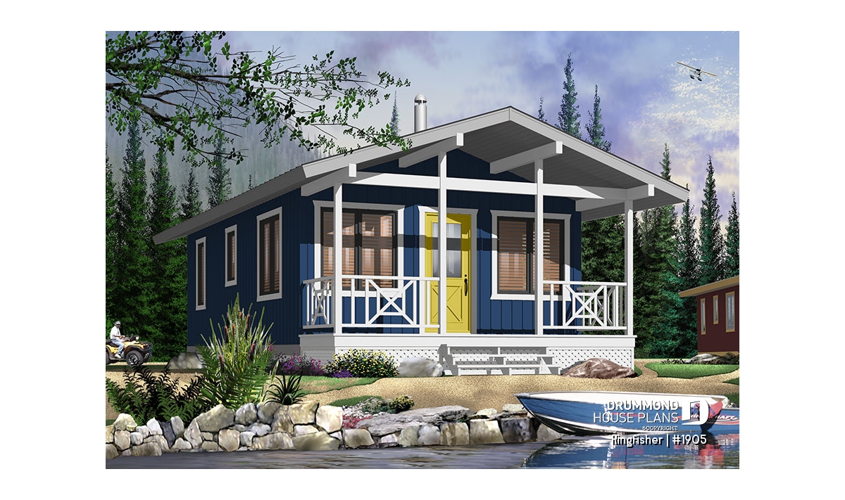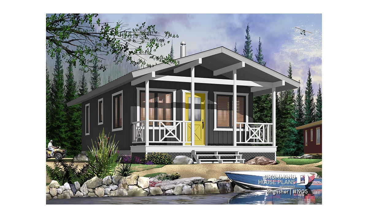 Maximizing interior space is important with compact getaways and this model, includes two bedrooms and a shower room (optional in the 3-season house plan option) on the back and can accommodate up to eight people if arranged creatively.