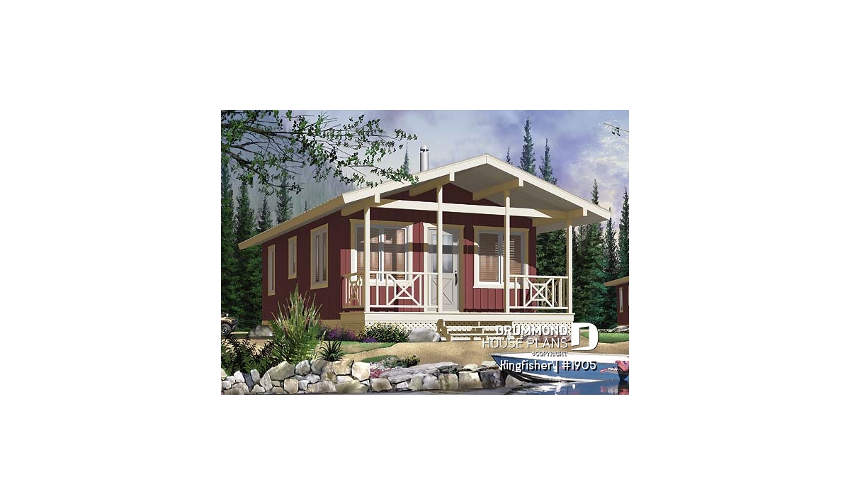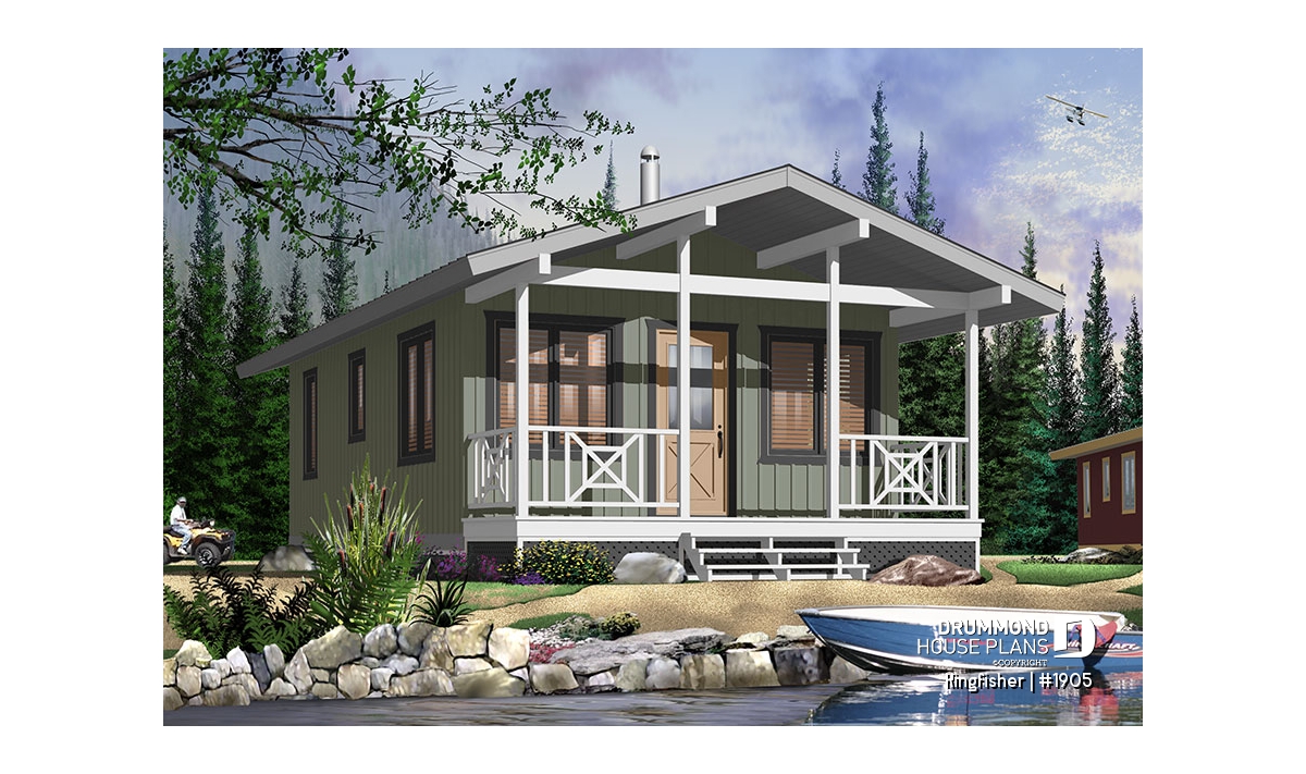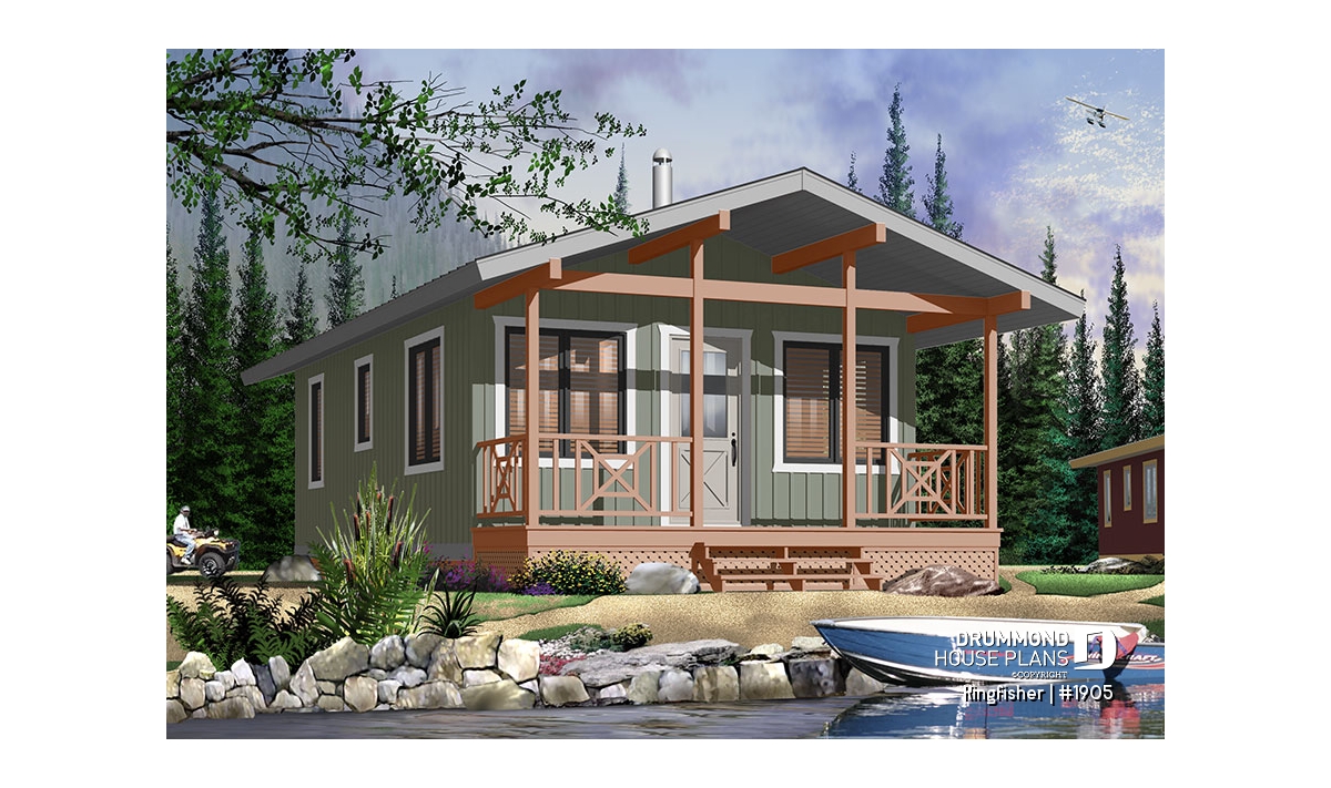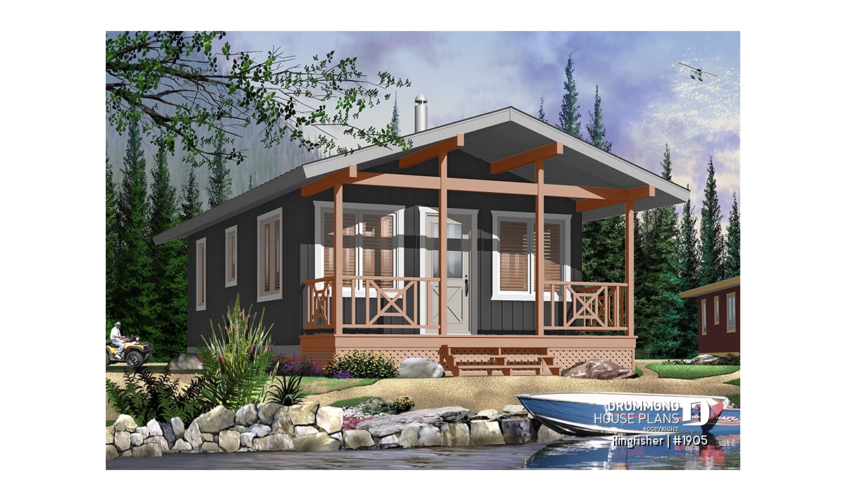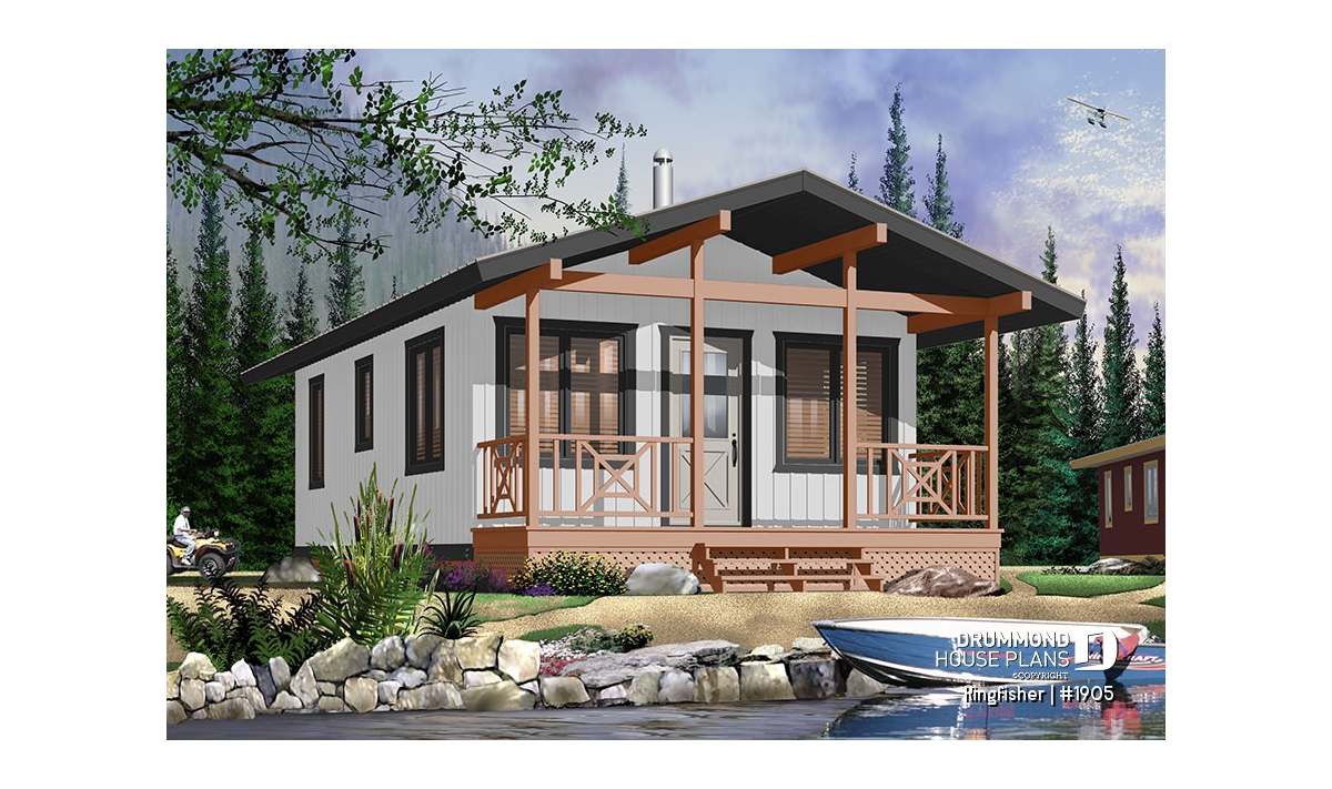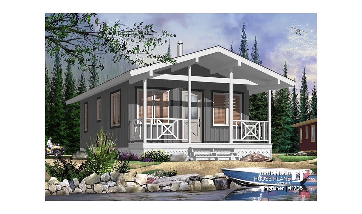 Maximizing interior space is important with compact getaways and this model, includes two bedrooms and a shower room (optional in the 3-season house plan option) on the back and can accommodate up to eight people if arranged creatively.