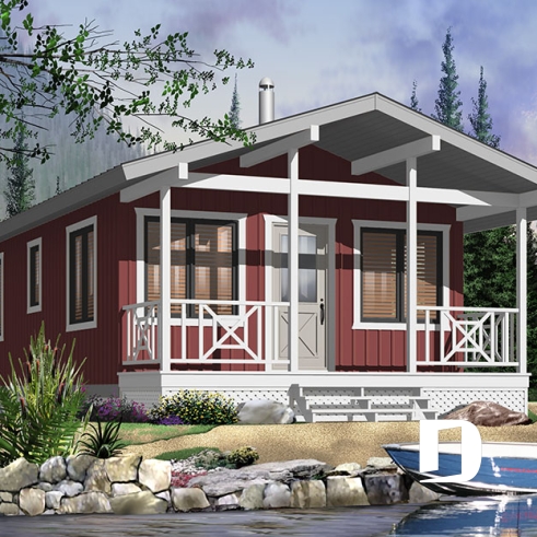 Small country cabin plan with 2 bedrooms, open kitchen family room, shower room, covered porch