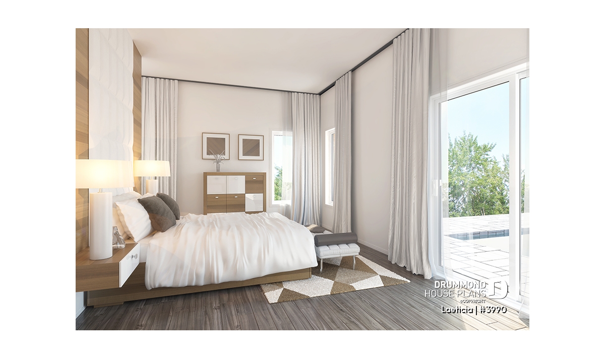 Master bedroom with access to the pool, large walk-in closet behing bed and access to full bathroom