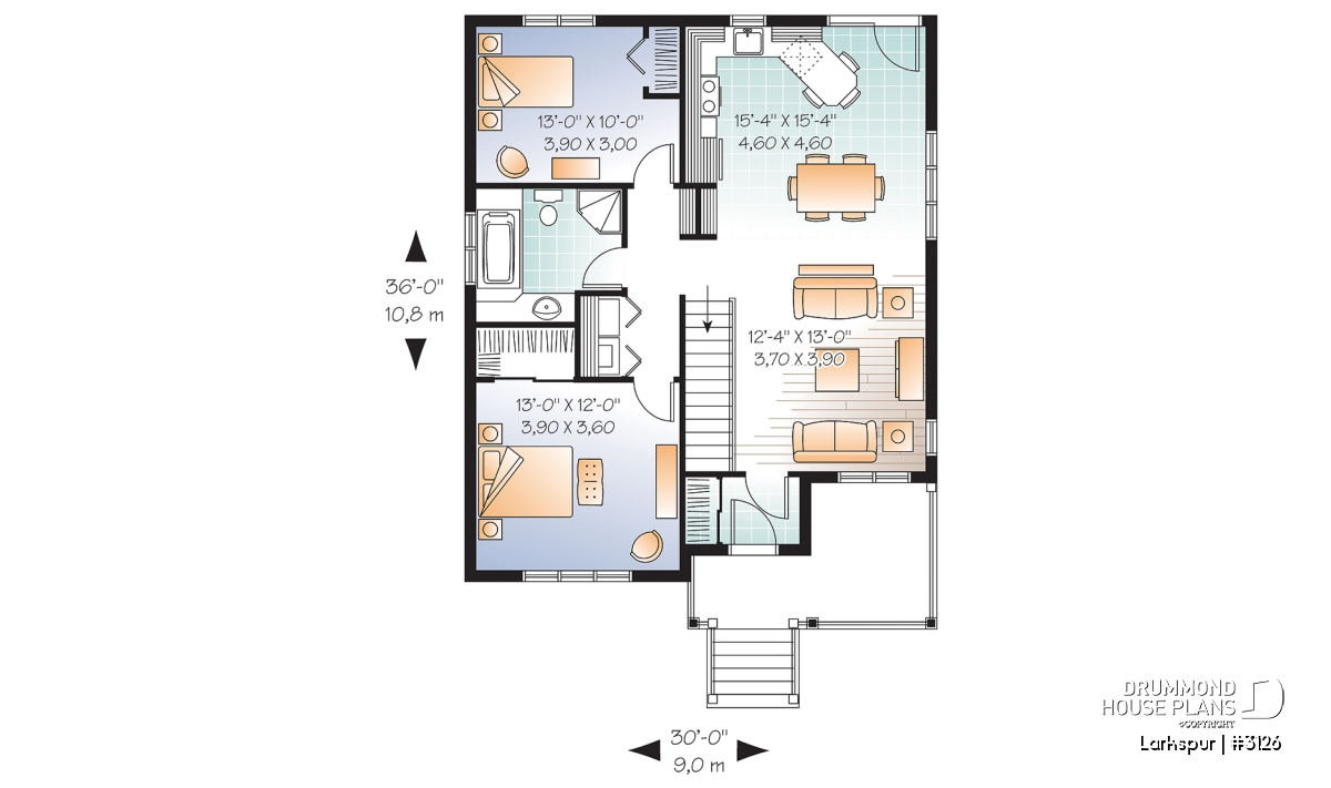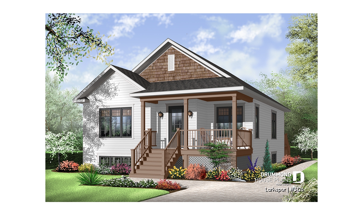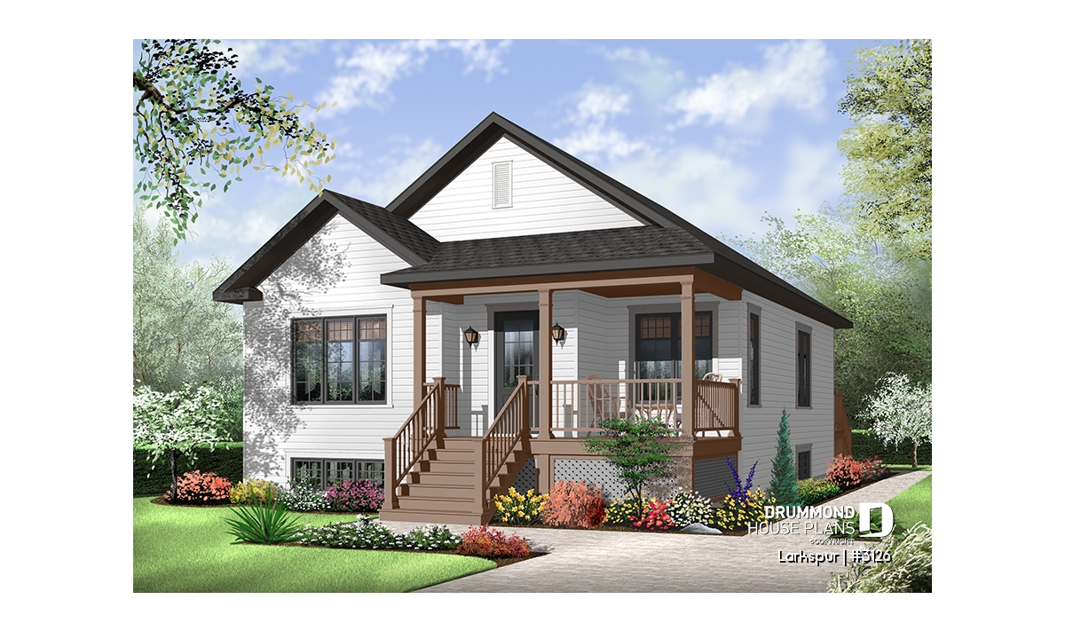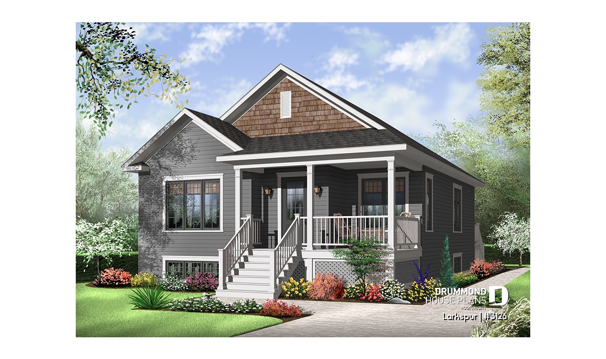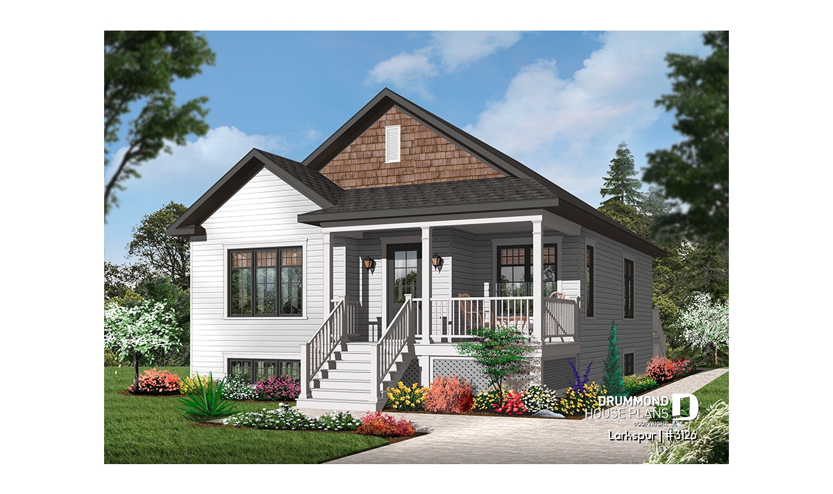 Economical and ecological - following the trend of efficient, affordable homes Drummond is pleased to offer this attractive model. A deep gable façade gives an undeniable visual impact. Read or visit on the charming L-shaped porch or merely enjoy the shelter from the elements as you enter with packages.