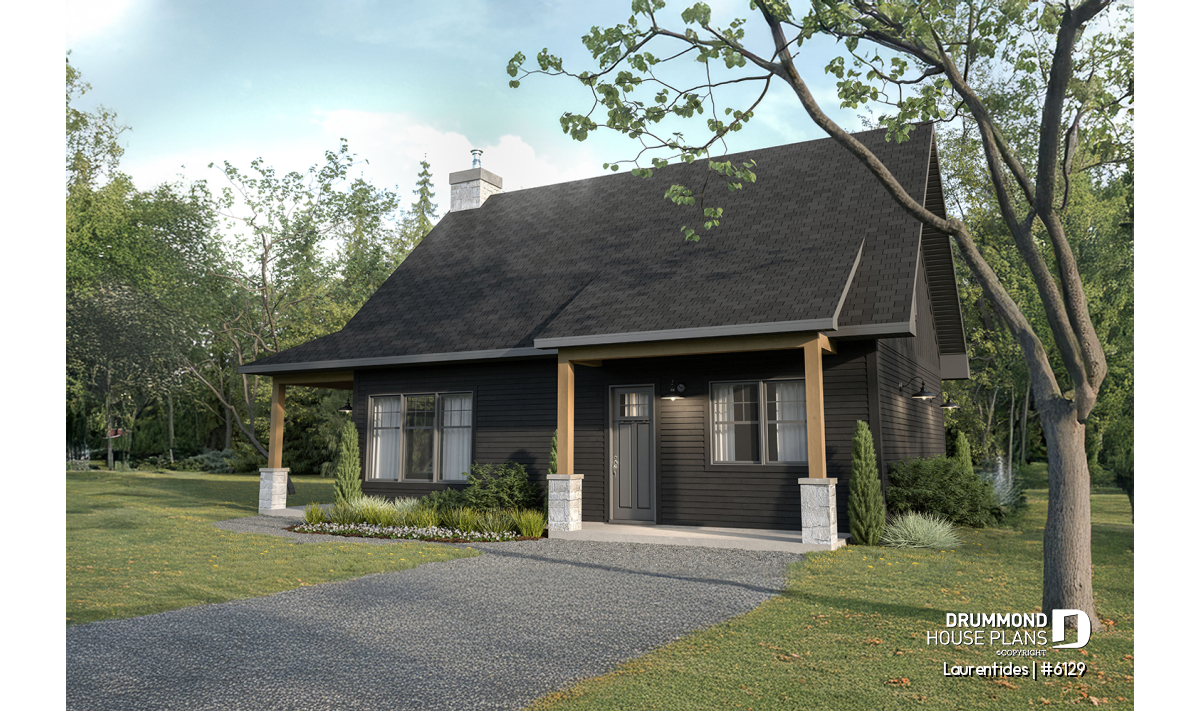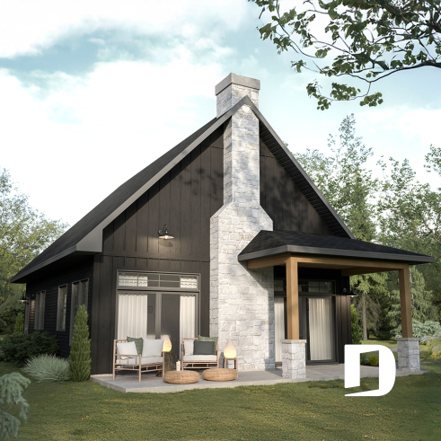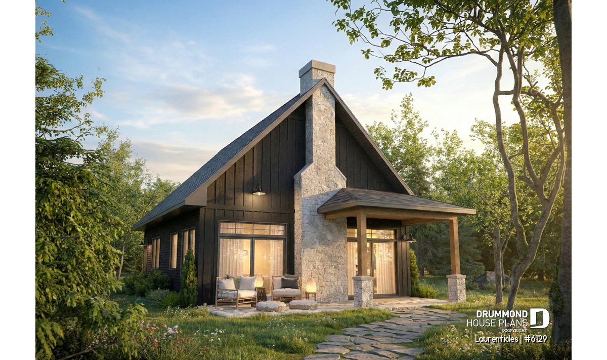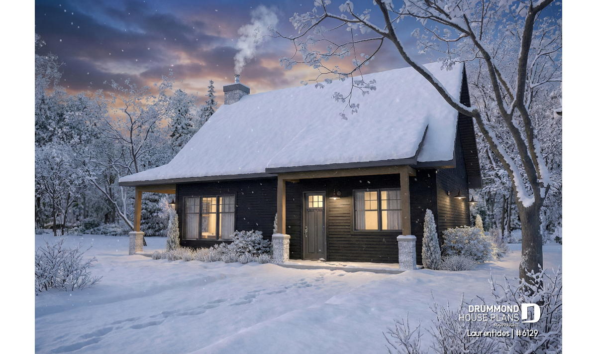 The Laurentides (#6129) model is a warm and inviting rustic chalet-style house plan that immediately stands out with its striking dark exterior and authentic character. Designed to blend beautifully into a natural setting, this model is equally suited as a ski chalet or a countryside retreat, offering a cozy and welcoming atmosphere in every season.
