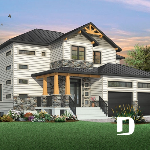 The stark modern design contrasts with wood pillars and accents, stone and a steel roof to give this model a uniquely modern/rustic feel.