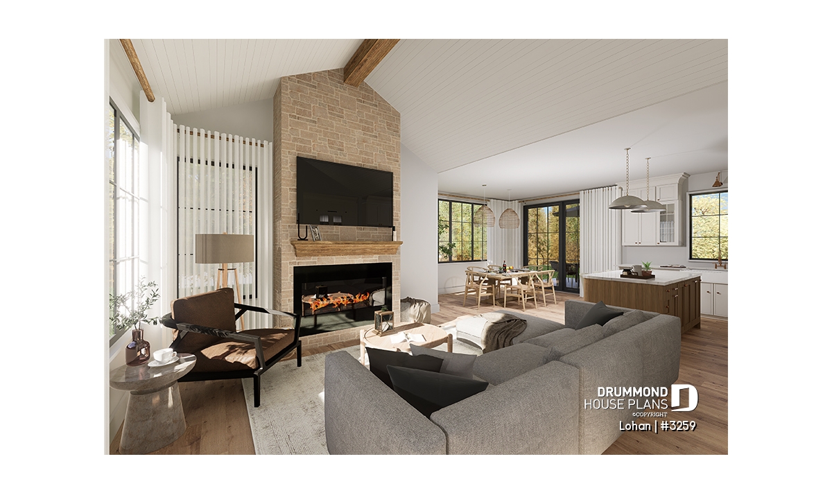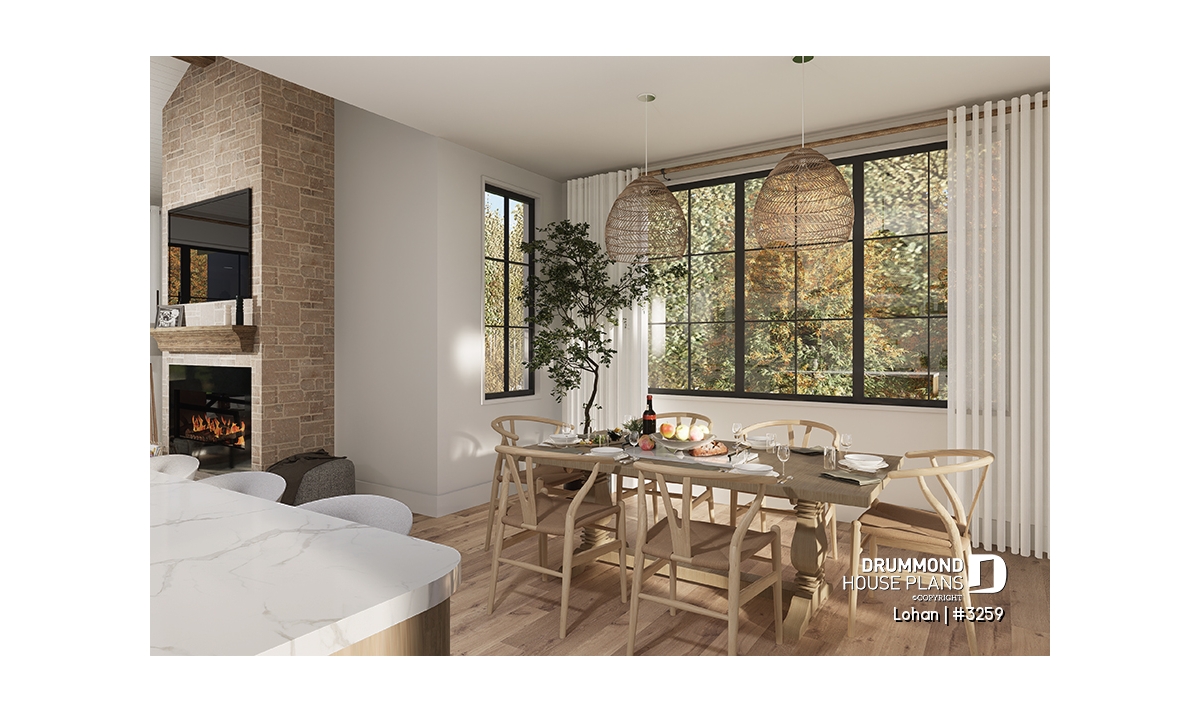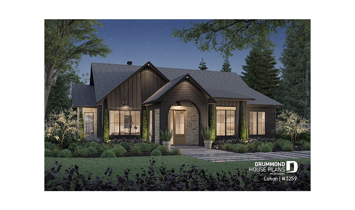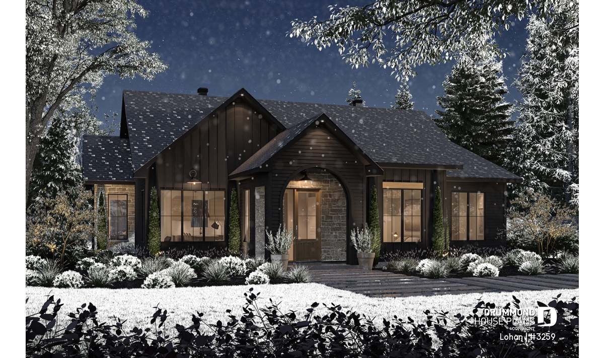 The warmth found in this plan is in part because of the choice of dark materials and the stone on the facade.