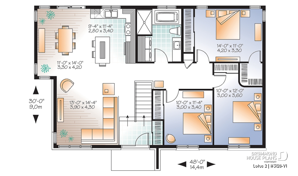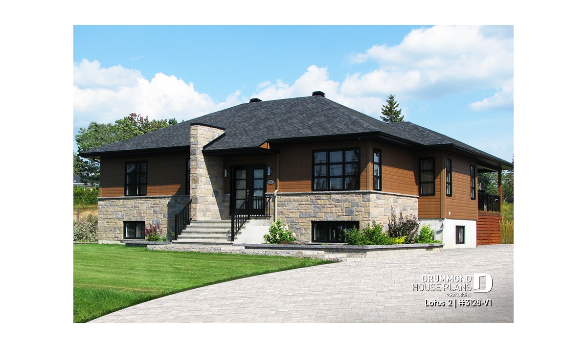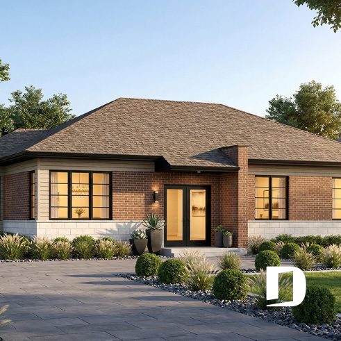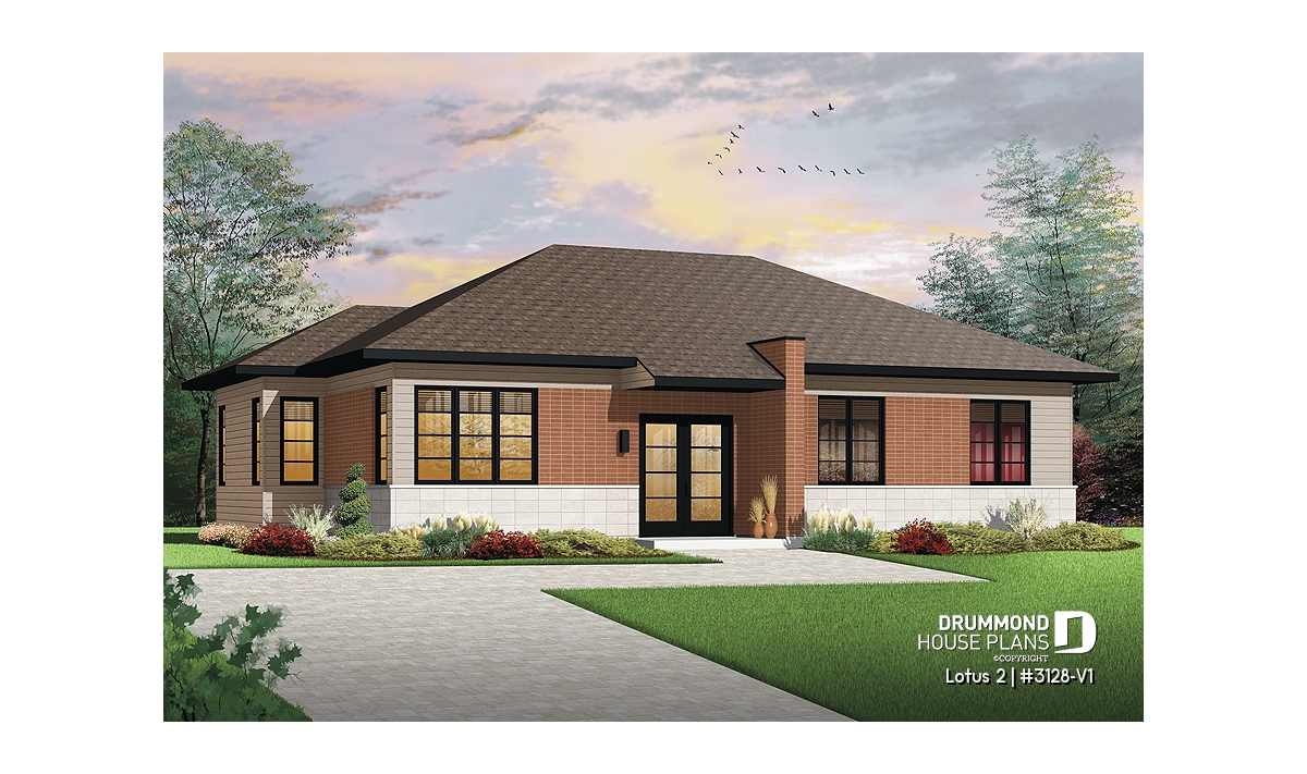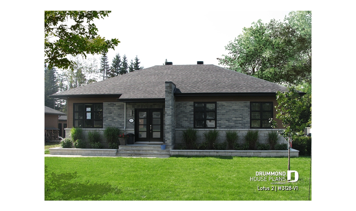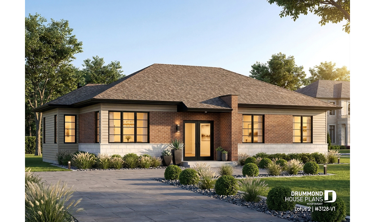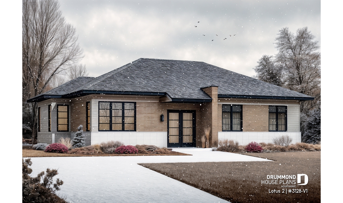The simple lines of this three-bedroom bungalow are elevated in style by the use of contemporary windows and exterior finishes. Even though under 1400 square feet, there are no missing amenities!