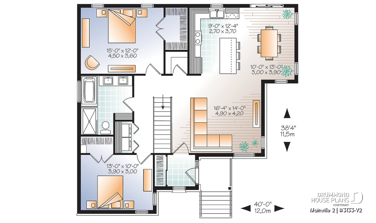 Other wonderful features of this design include a central kitchen island, a laundry area on the main floor and a walk-in closet in both master bedroom and the secondary bedroom as well as a full bathroom with separate 3’ x 5’ shower.