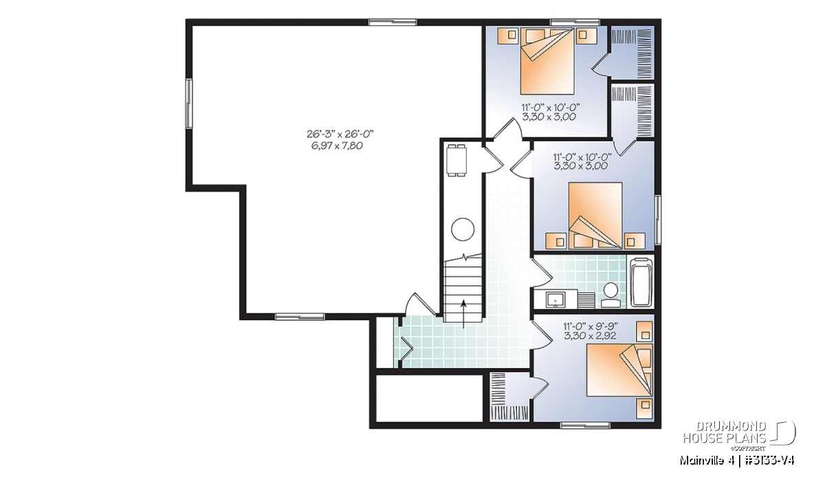 The ‘high profile’ design permits ample fenestration for the three almost 11’ x 10’ bedrooms, each with its own walk-in closet. A complete bathroom and a large space that can be finished as a game or multi-media room enhance the livability of this well thought out floor plan that is perfectly adaptable to today’s blended families