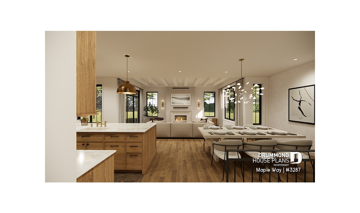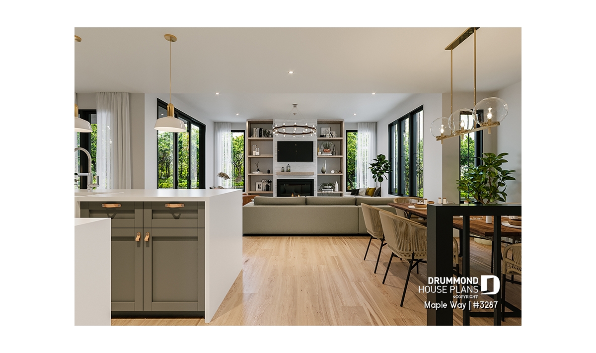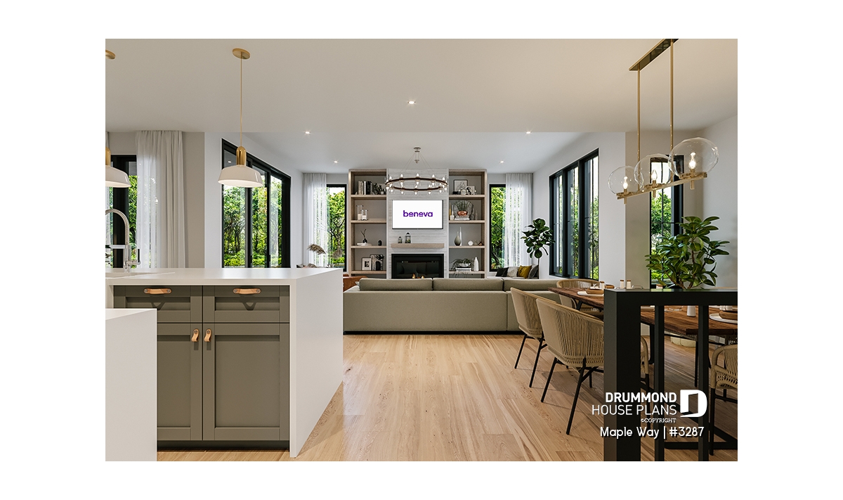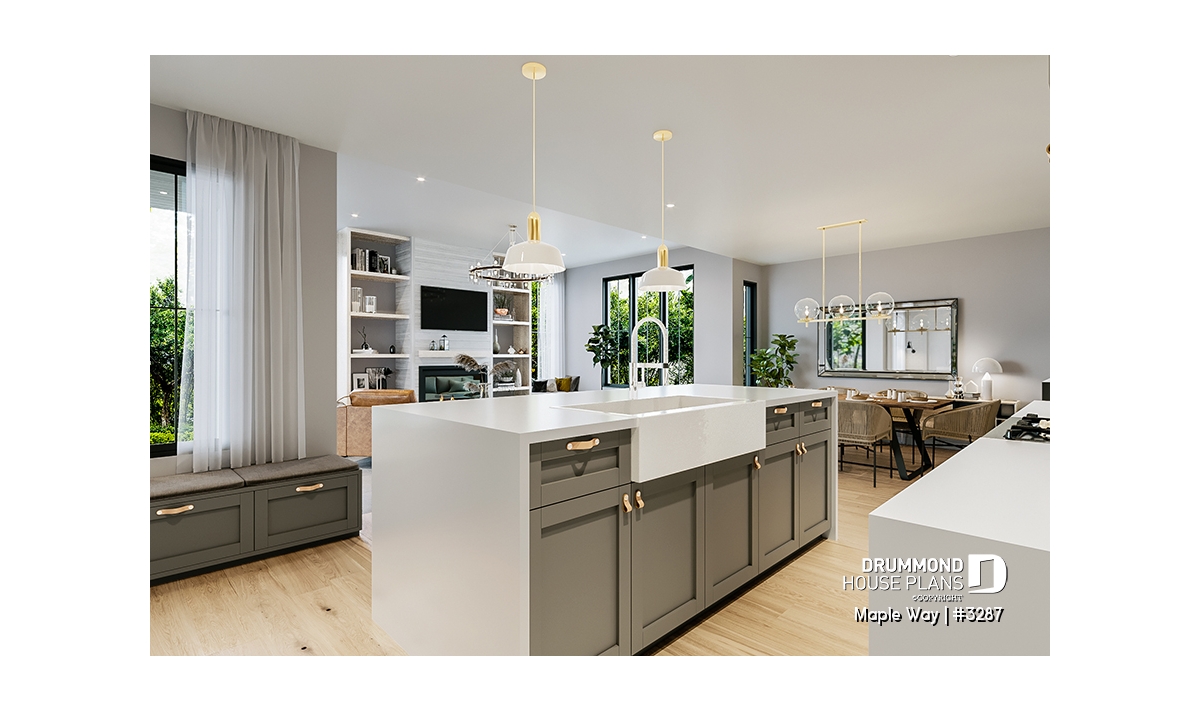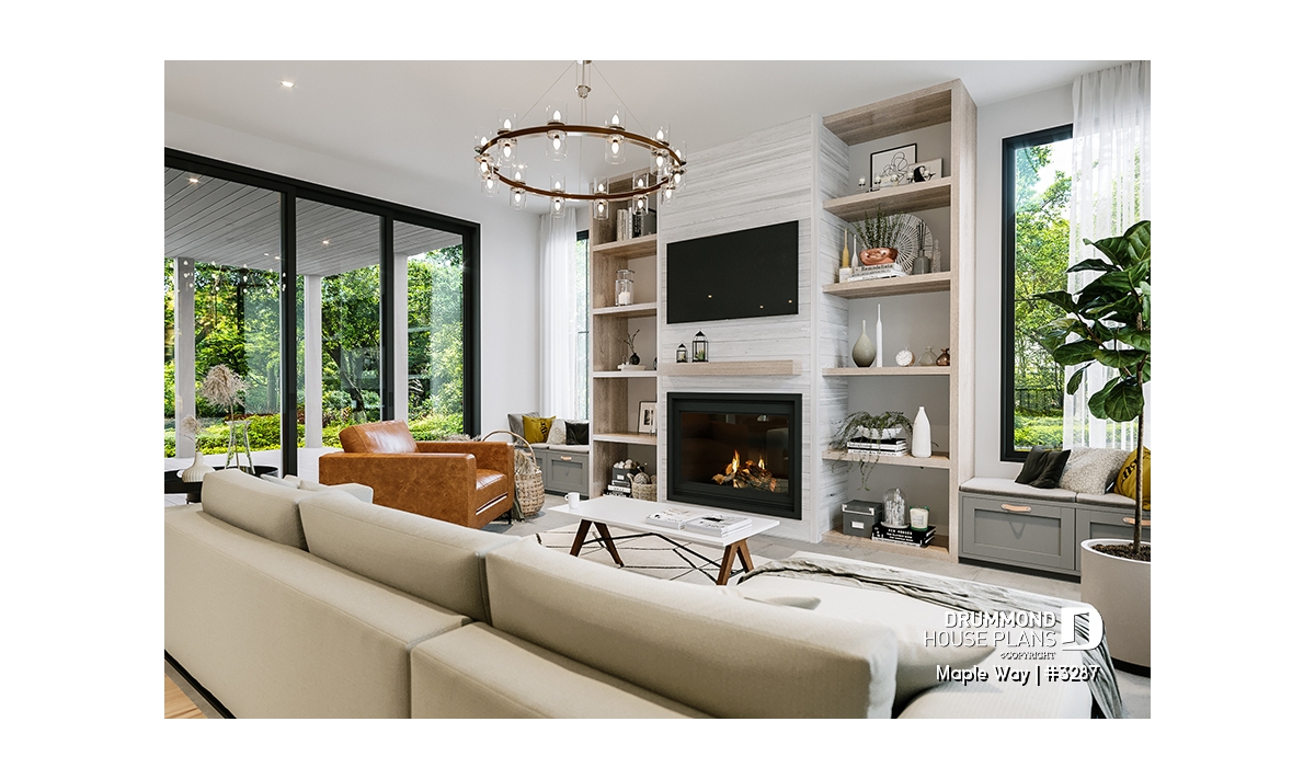 At the heart of the home, the bright, open kitchen features a large pantry and a cozy window bench, perfect for admiring the view or relaxing with a coffee. The living room, with its 10-foot ceiling and central gas fireplace, offers a warm and elegant ambiance. Built-in benches and shelving on each side of the fireplace add harmony, character, and charm.