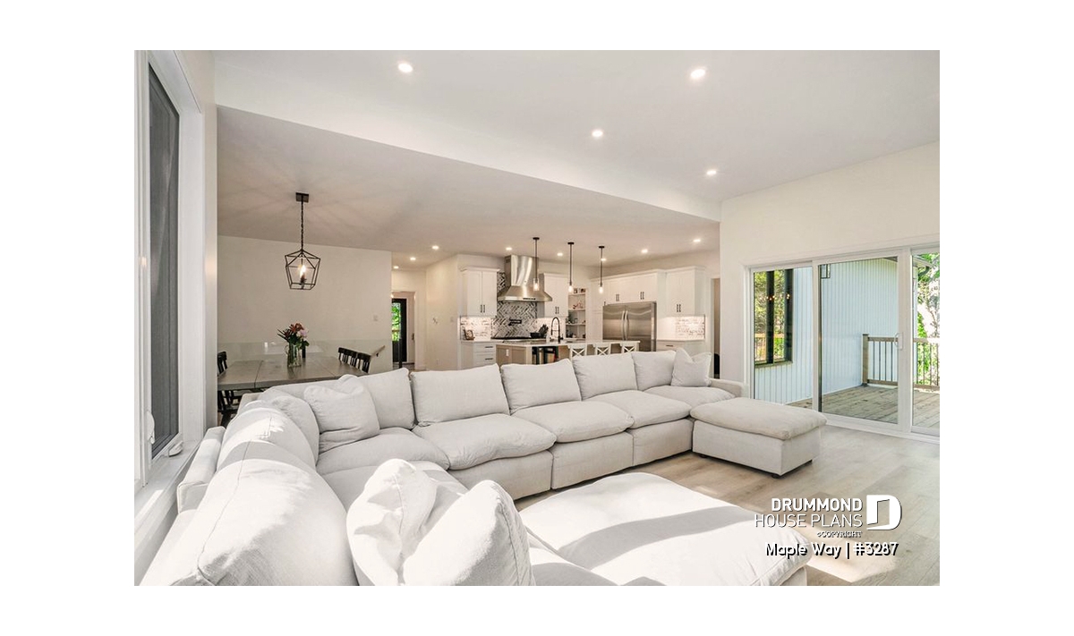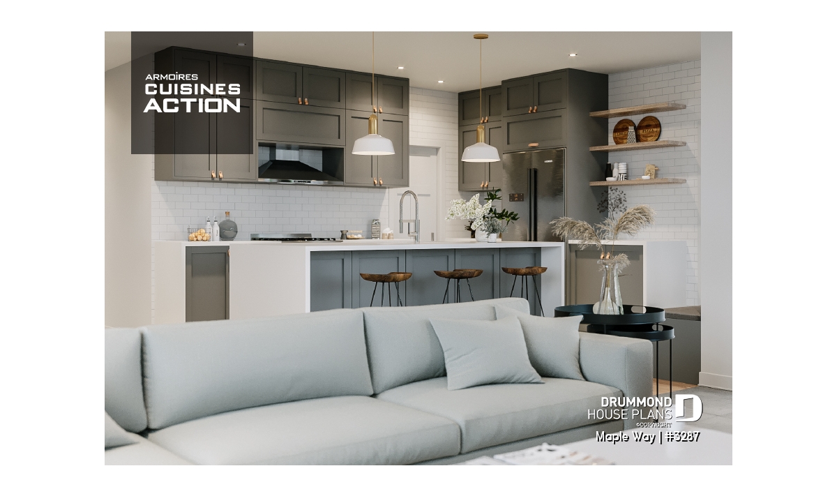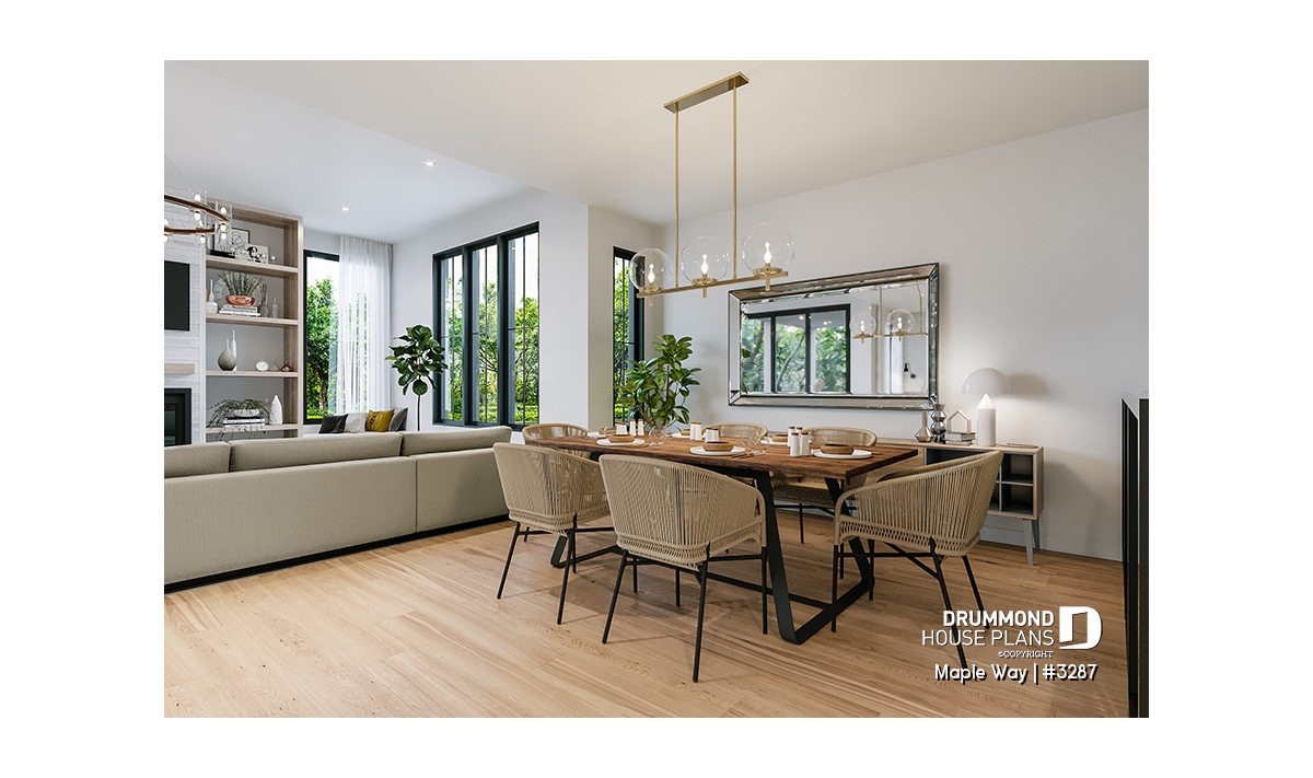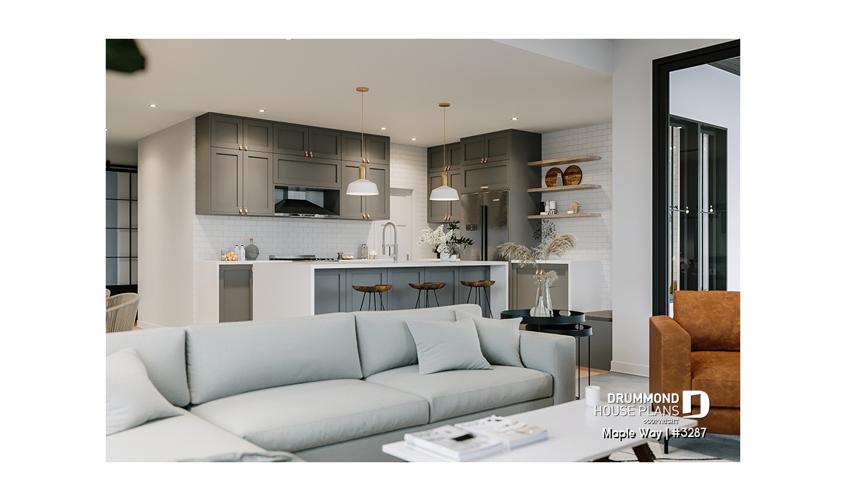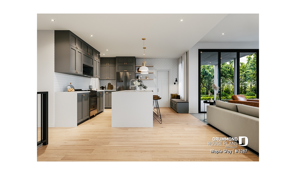 At the heart of the home, the bright, open kitchen features a large pantry and a cozy window bench, perfect for admiring the view or relaxing with a coffee. The living room, with its 10-foot ceiling and central gas fireplace, offers a warm and elegant ambiance. Built-in benches and shelving on each side of the fireplace add harmony, character, and charm.