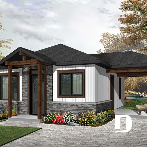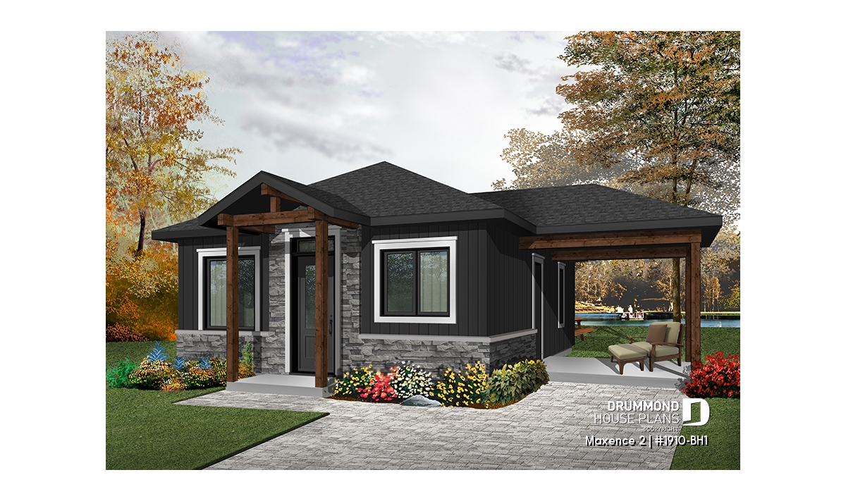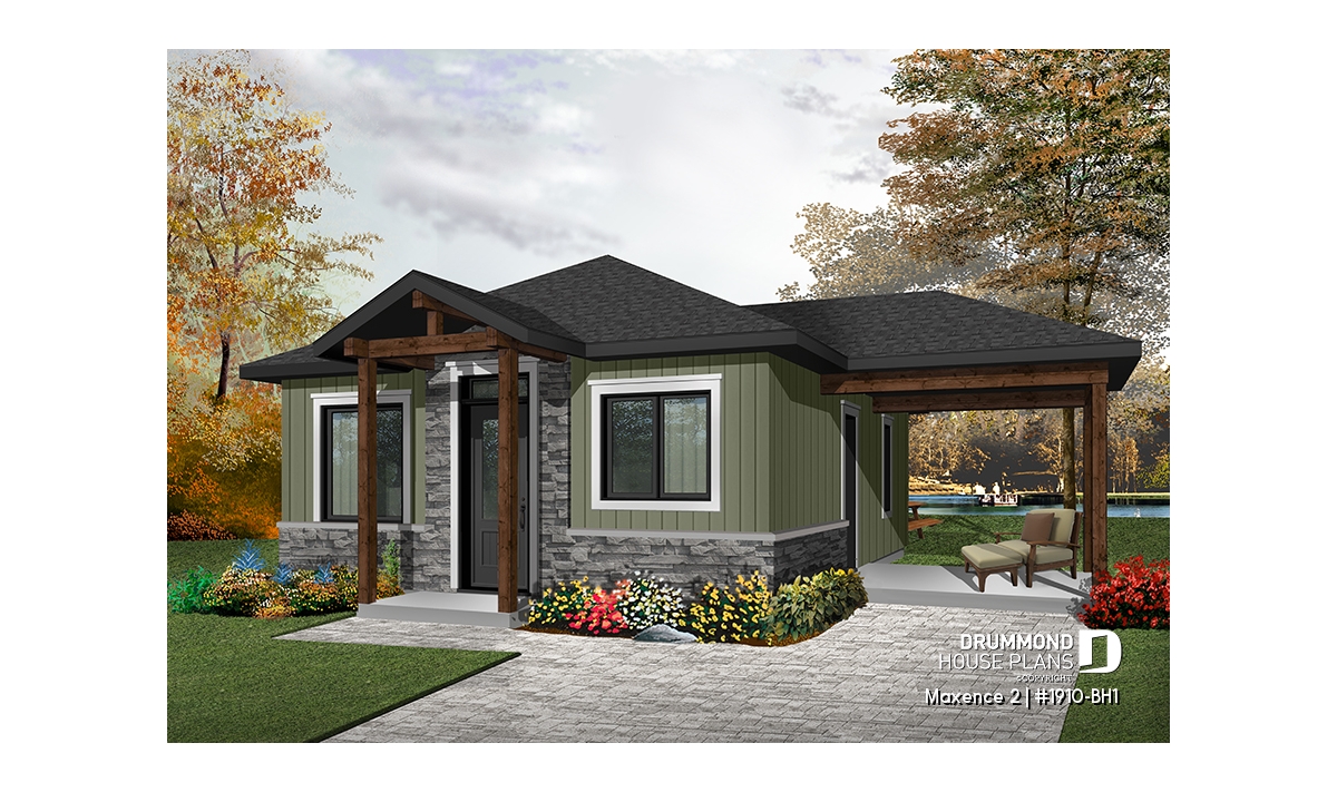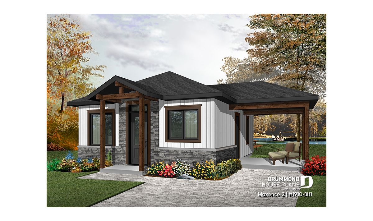 Small modern rustic 2 bedroom home plans, open kitchen and family room, large side covered deck