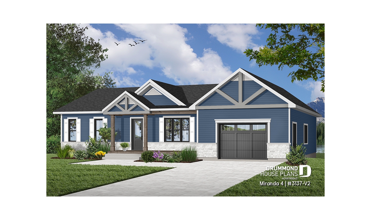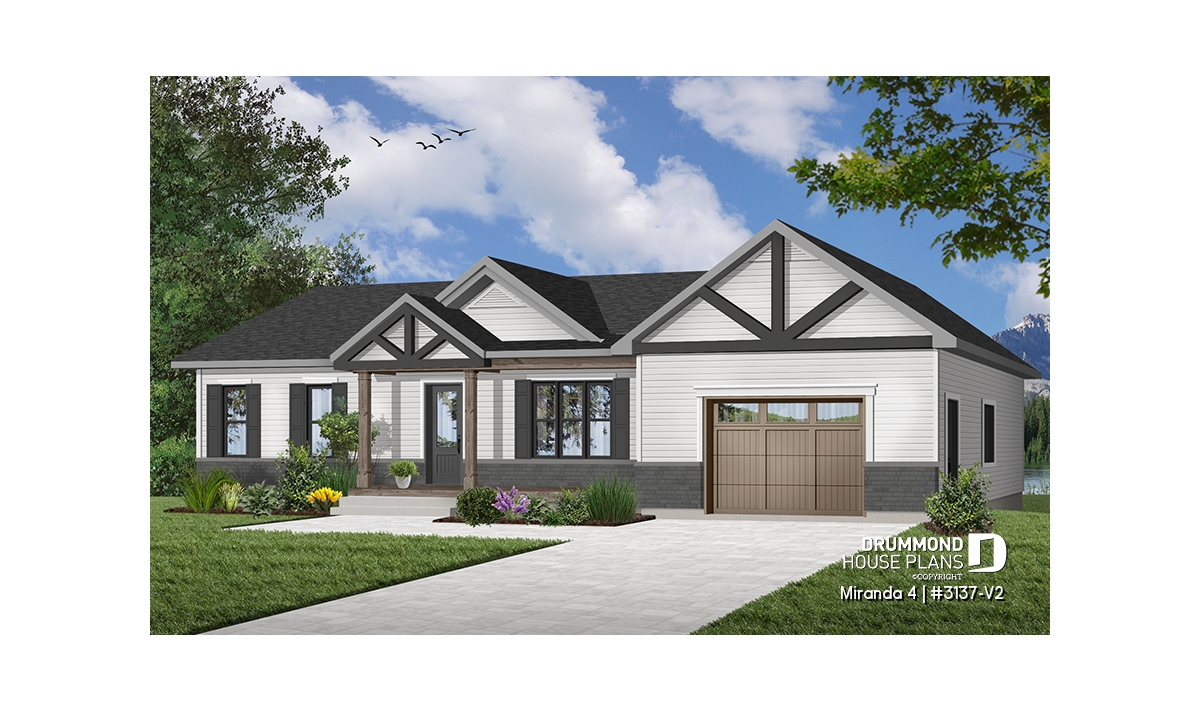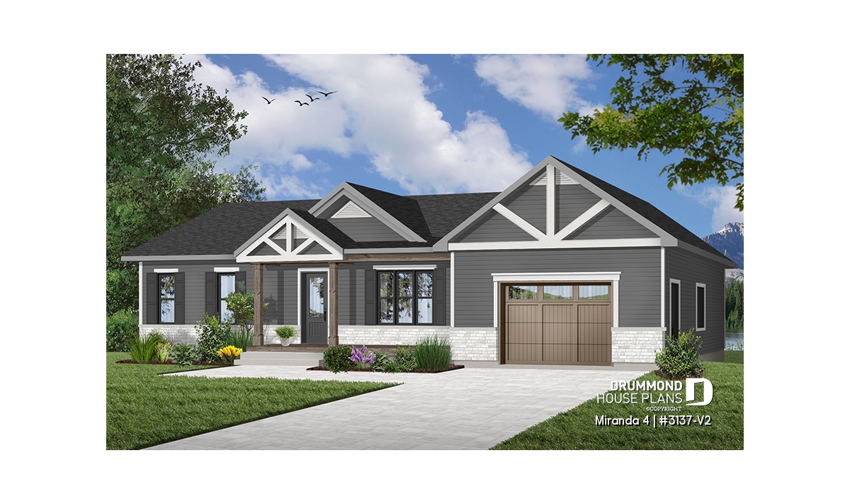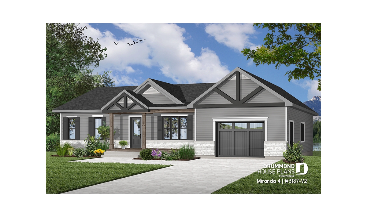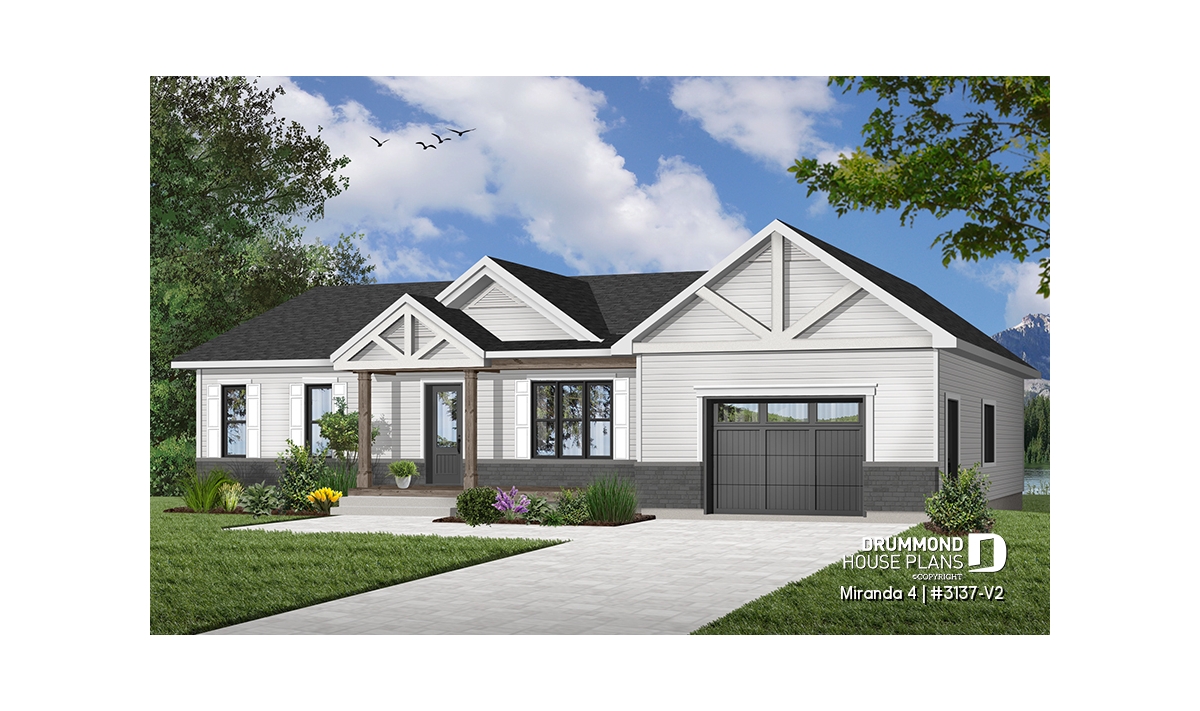 The Miranda 4 house plan (#3137-V2) is a charming single-story ranch home that blends a modern rustic farmhouse look with a highly affordable price point. Thoughtfully designed for first-time homebuyers and young families, this plan delivers comfort, functionality, and long-term flexibility—without unnecessary extras.