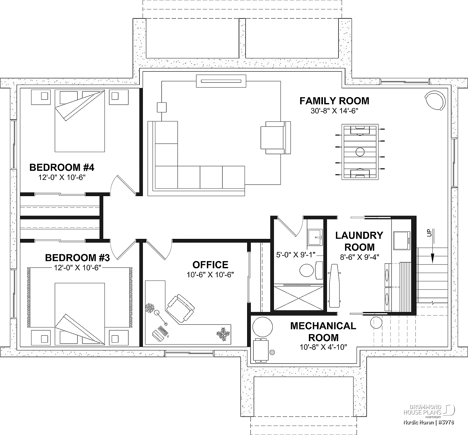 2 bedrooms, office (or Bedroom #5), shower room, laundry room, family room, mechanical room, and storage.