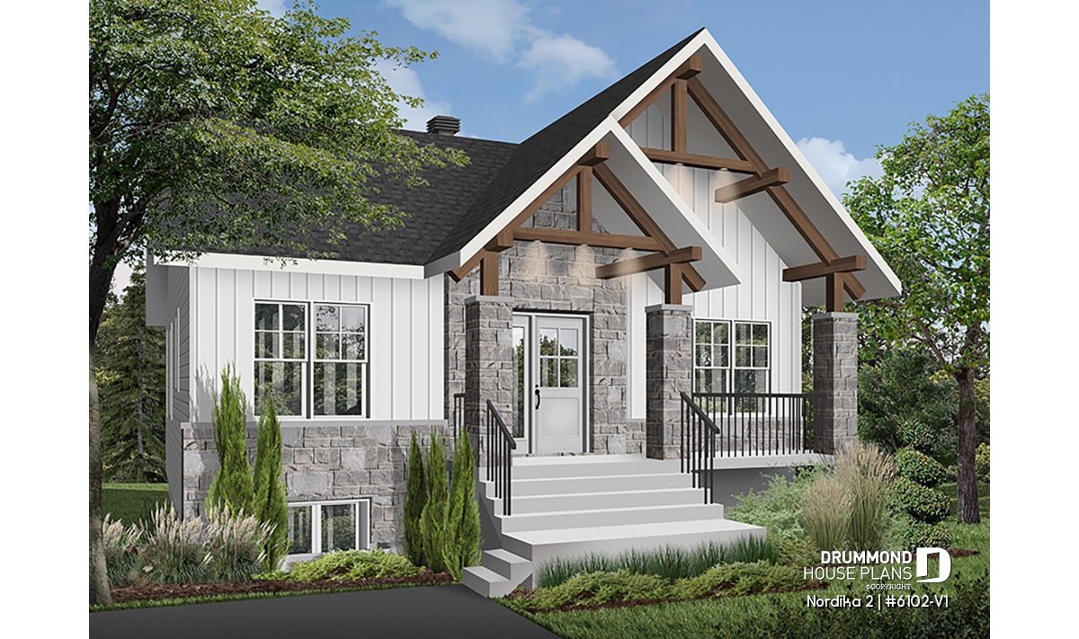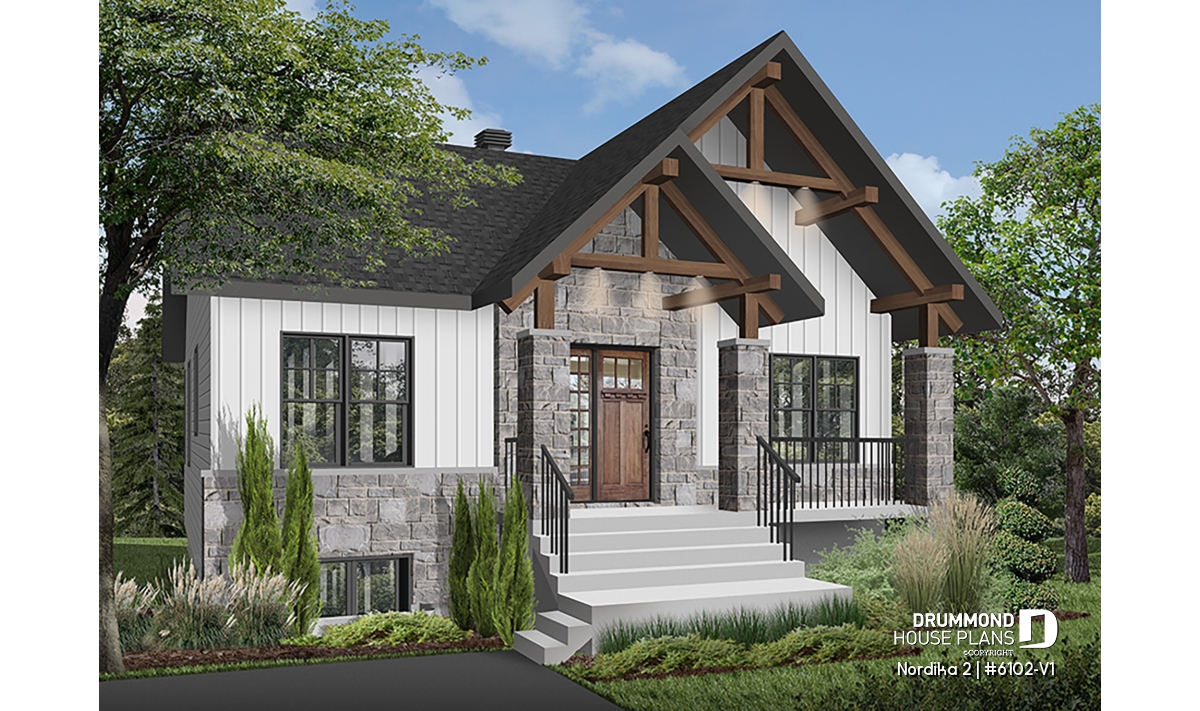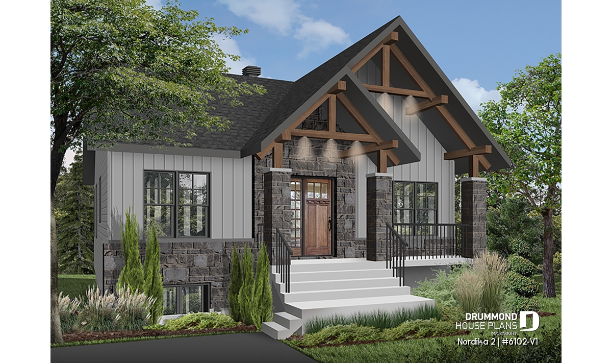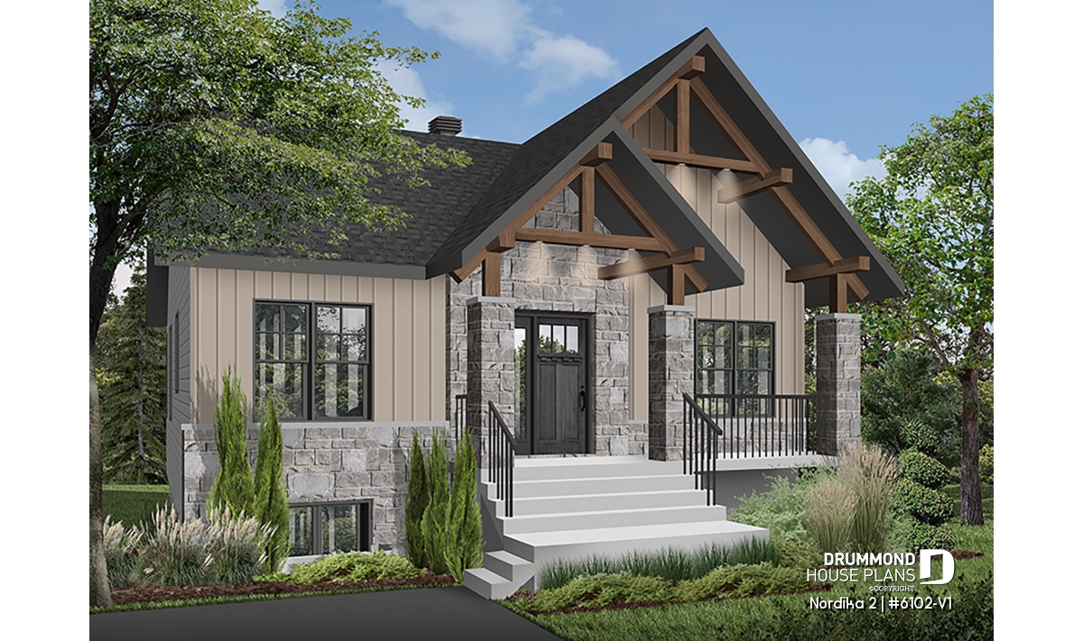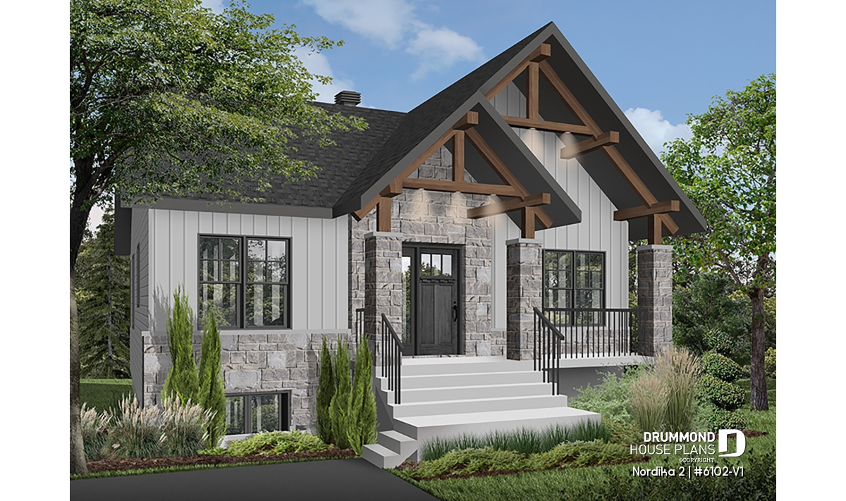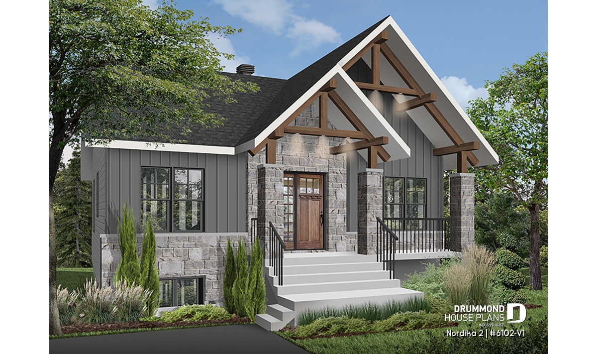 The NORDIKA 2 house plan (6102-V1) is as surprising as it is stylish, showcasing strong modern-rustic appeal both inside and out. Measuring 1,020 sq.ft. on the main level, this elegant home stands out with its impressive façade, featuring over 50% masonry and bold timber gables that instantly create character and presence. The rustic charm continues indoors, where beautiful exposed wood beams echo the architectural accents found on the exterior.
