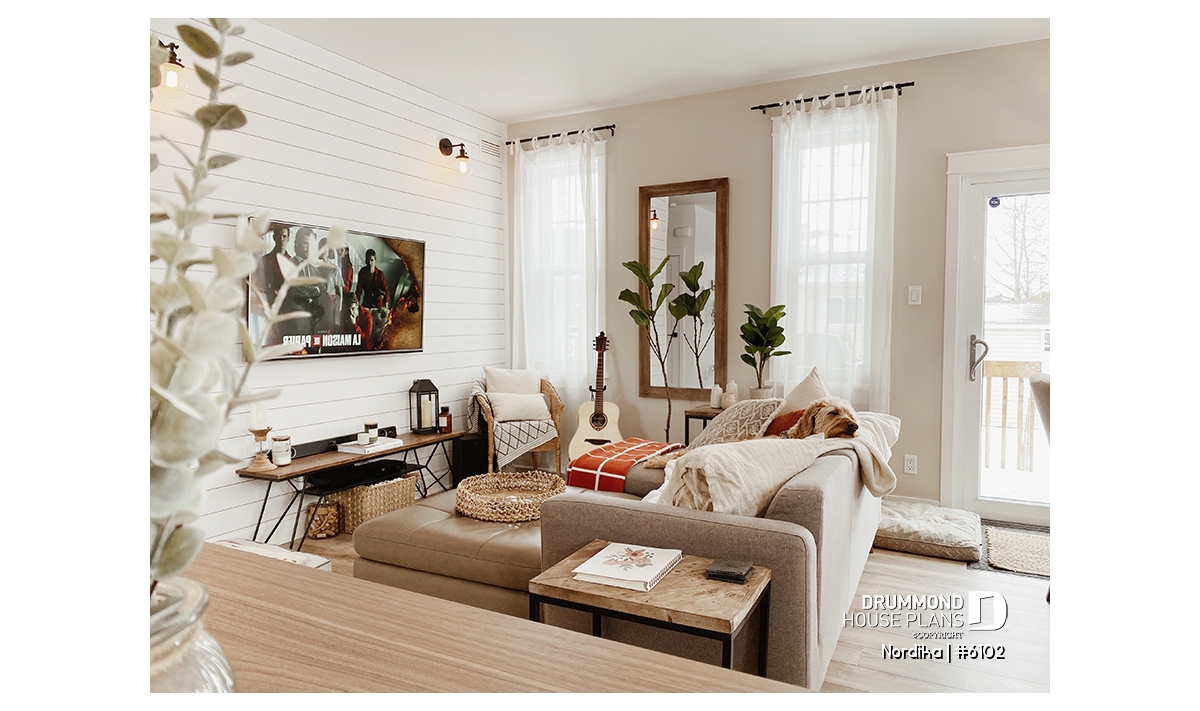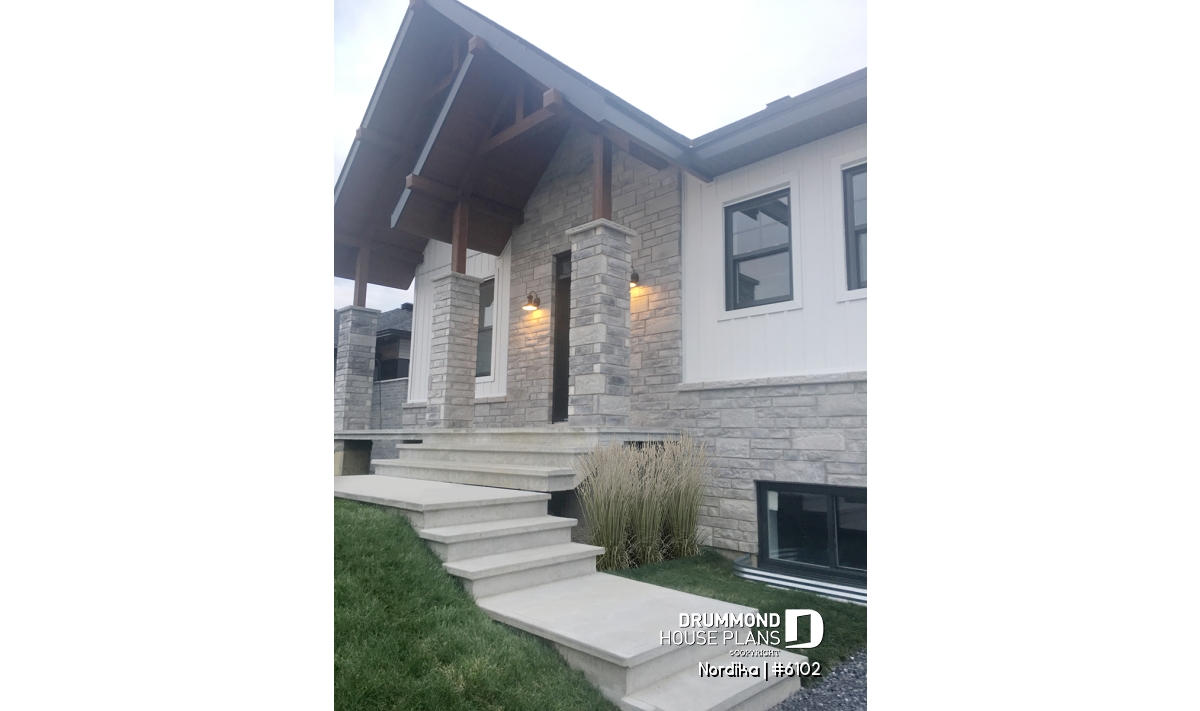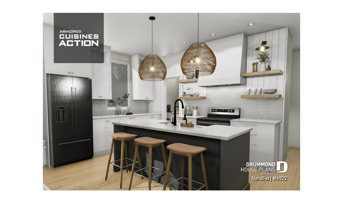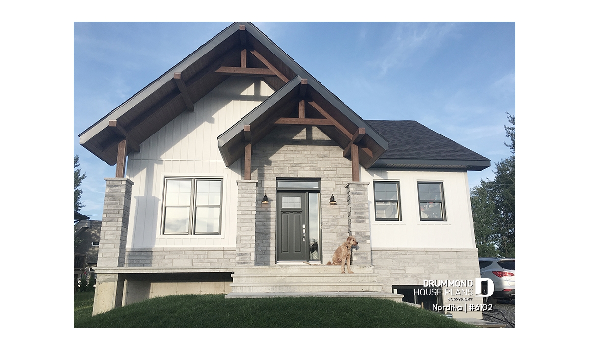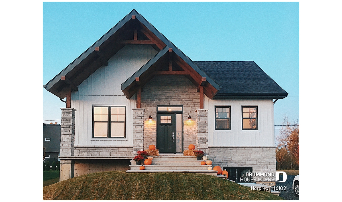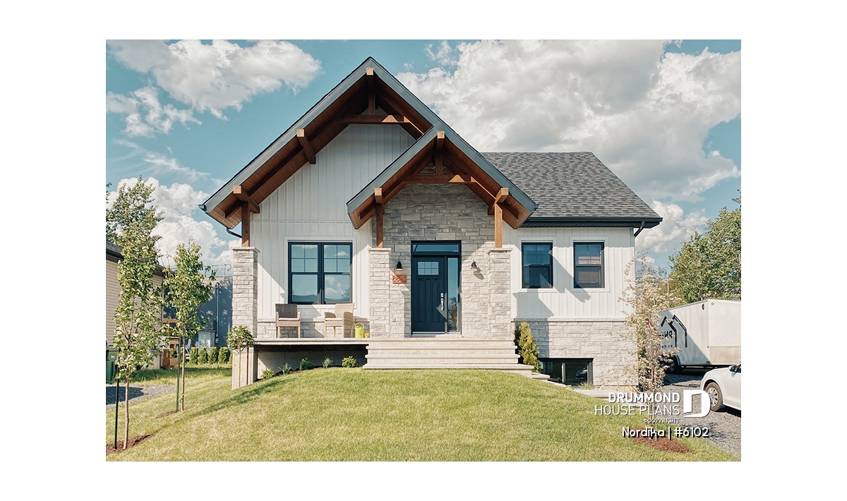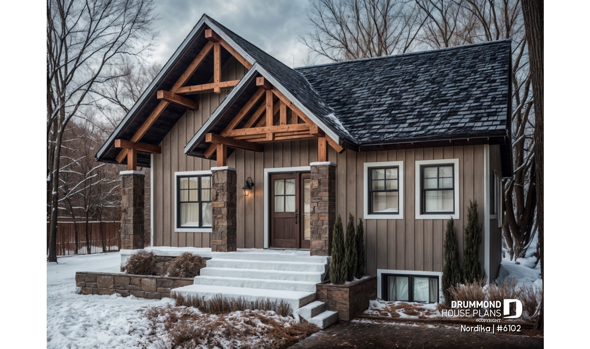 The NORDIKA (6102) is a modern rustic farmhouse bungalow designed to deliver maximum charm, comfort and functionality within a beautifully efficient footprint. Whether you’re looking for your first home, downsizing in style, or planning a cozy family nest, this thoughtful layout adapts naturally to a wide range of lifestyles. Offering 1 to 3 bedrooms and 1 or 2 bathrooms depending on the optional finished basement, this plan stands out for its warm aesthetics, smart storage solutions, and surprisingly spacious feel.