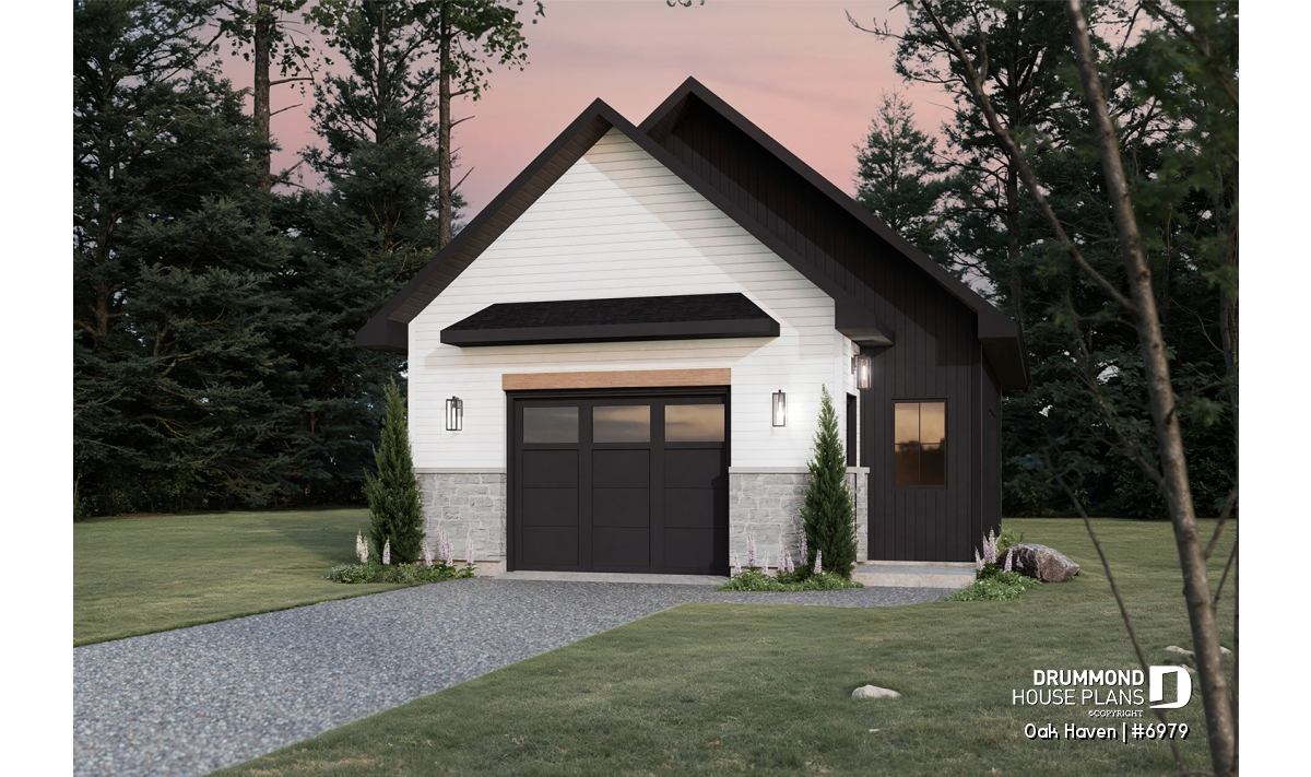 One-car garage plan with a modern farmhouse style, designed for functionality and maximum storage.