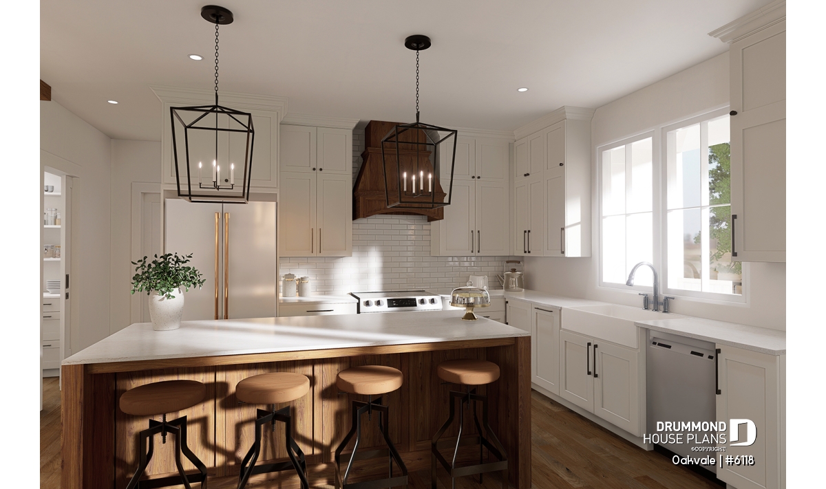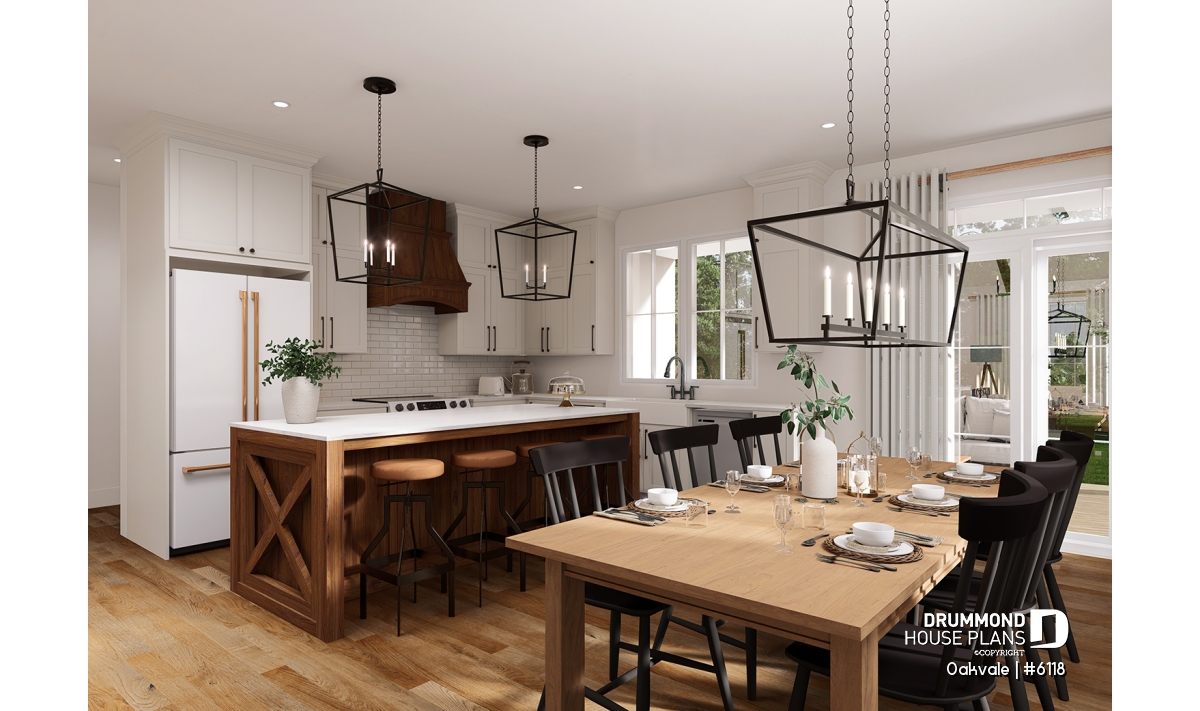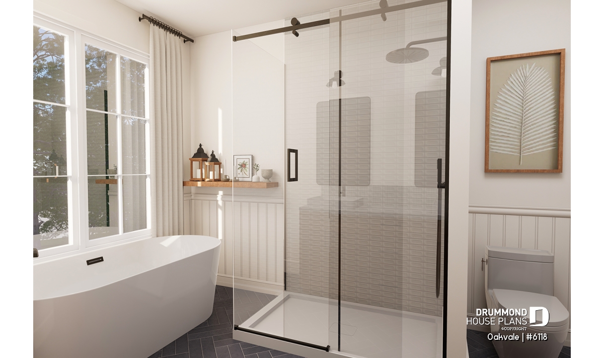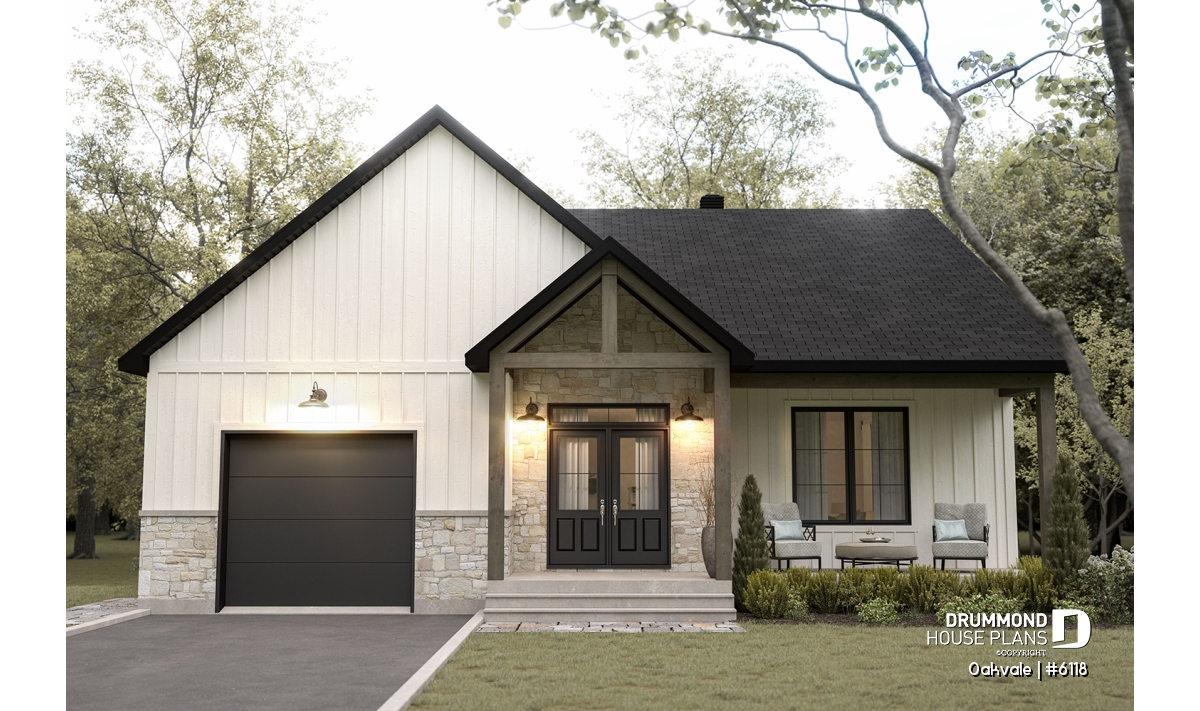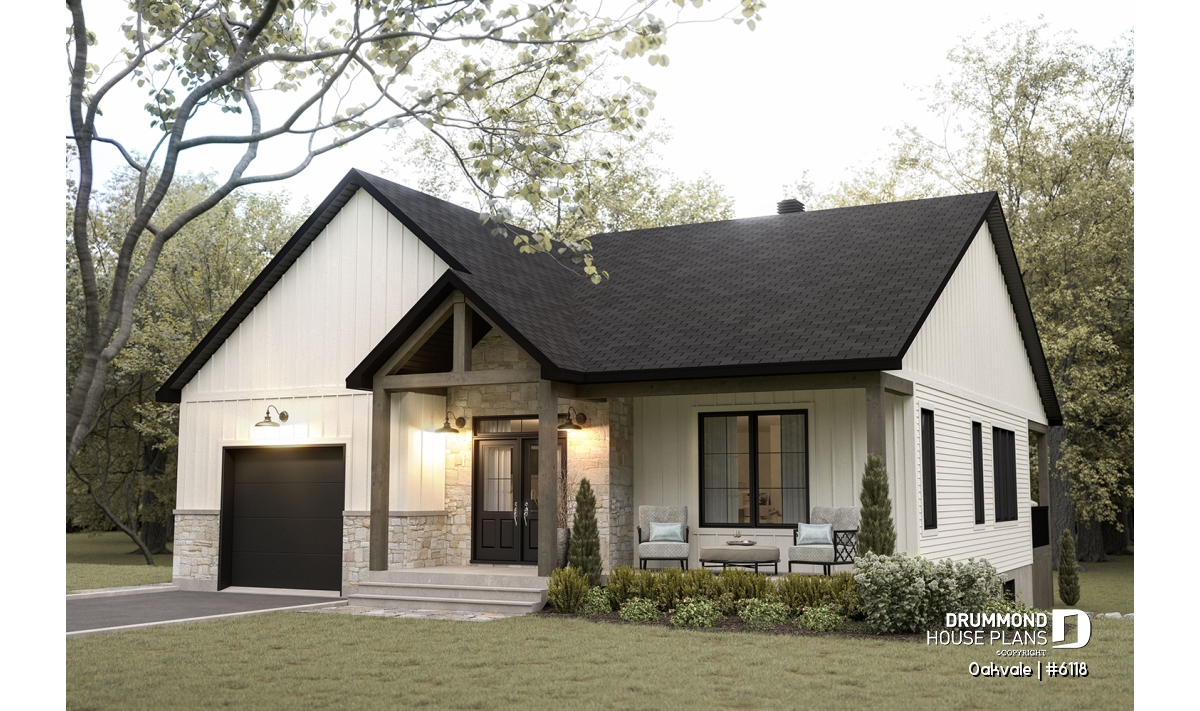 The OAKVALE house plan (#6118) offers 1398 sq. ft. on the ground floor and a 400 sq. ft. garage. A finished basement proposal is also illustrated (option on plan $) if you want to increase the space available to your family. Many foundations options are available.