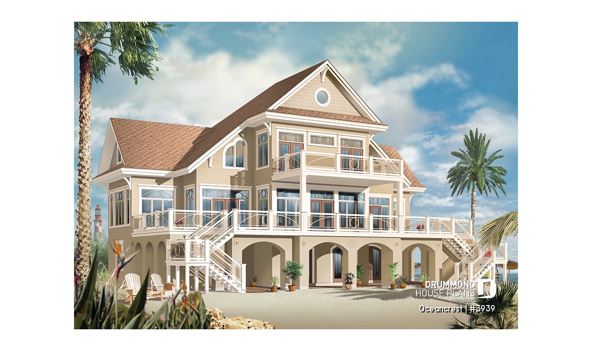 The upper floor features two bedroom suites, each with walk-in closets and private sitting area. A family room accesses a covered rear balcony or get away to a small forward balcony.