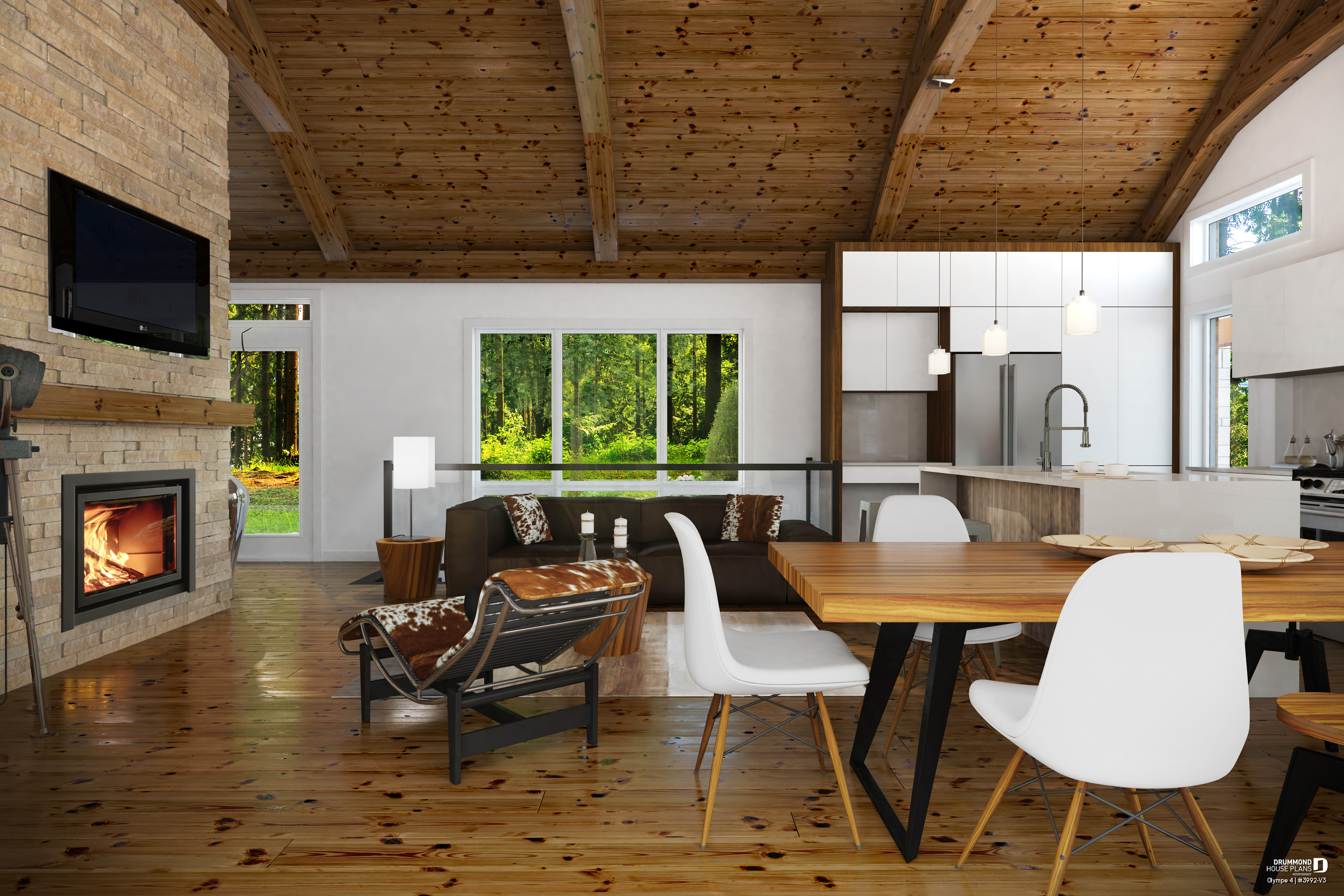 The heart of the home is the open-concept kitchen and living area, designed to encourage connection and family time. At its center stands a grand fireplace, a distinctive feature of this plan. The proposed STÛV s16-Z wood-burning fireplace combines performance with elegant design. It brings warmth and a cozy, Scandinavian-inspired ambiance to winter evenings while blending seamlessly into the chalet’s rustic-modern architecture. Visible from the entire main floor, it becomes the true focal point of the home, transforming every shared moment into a warm memory.