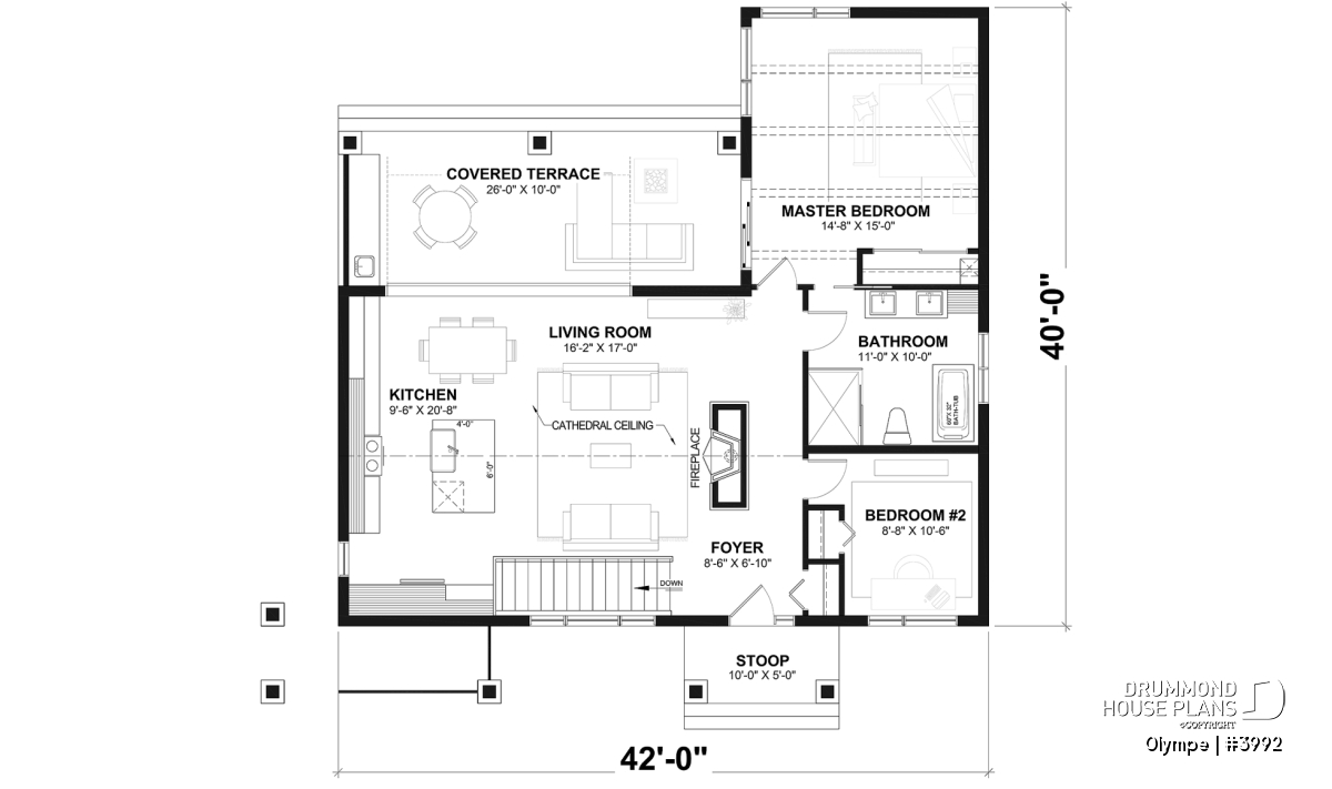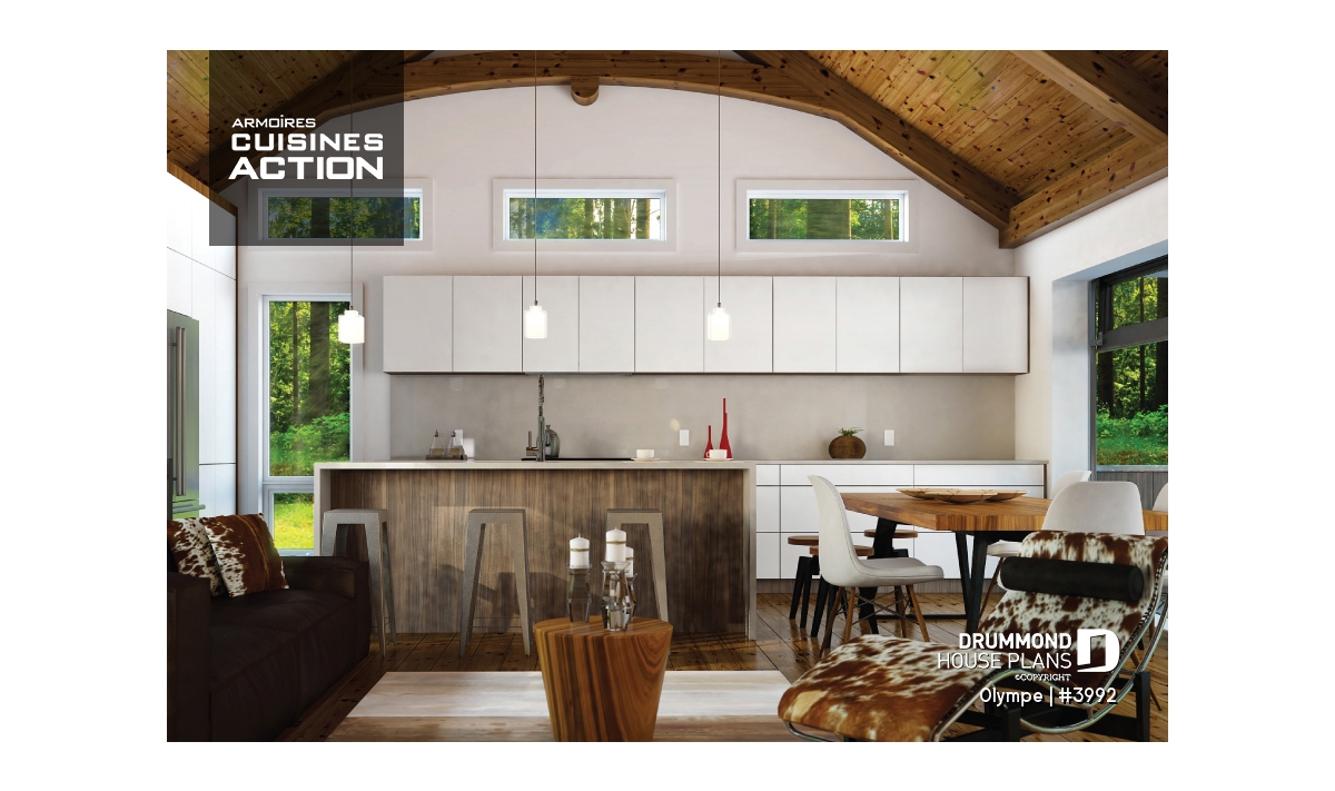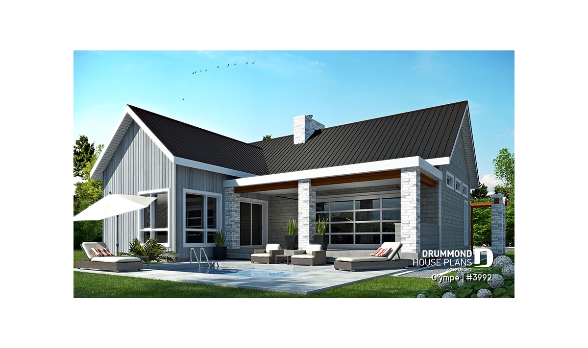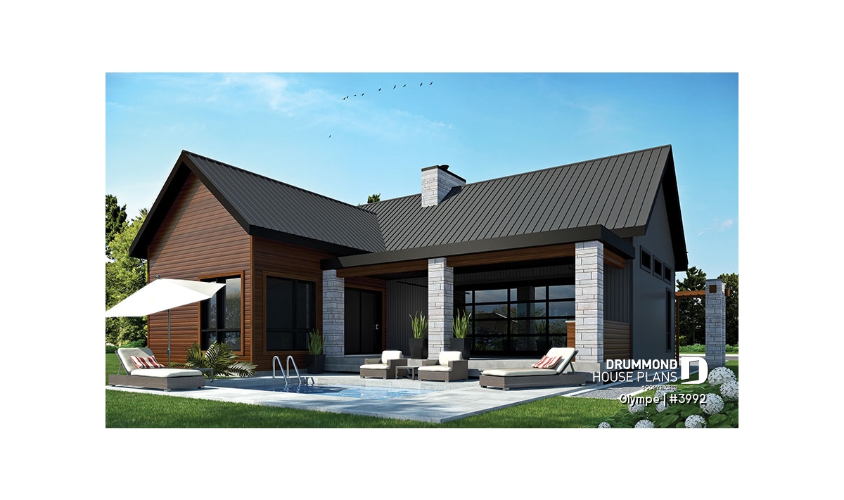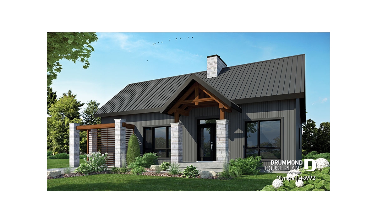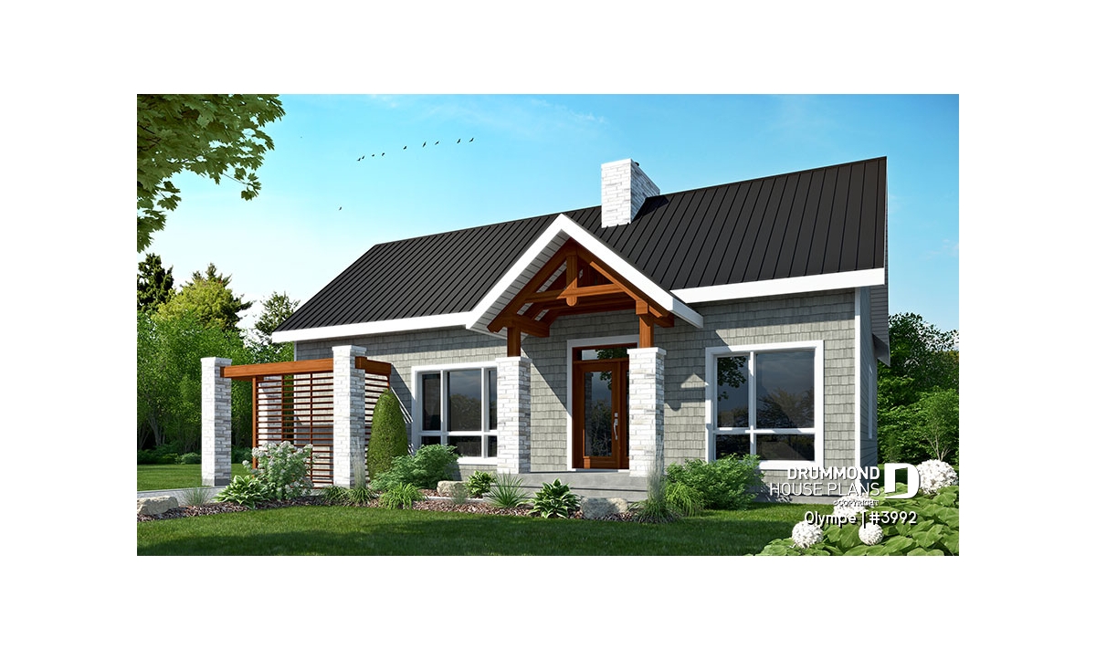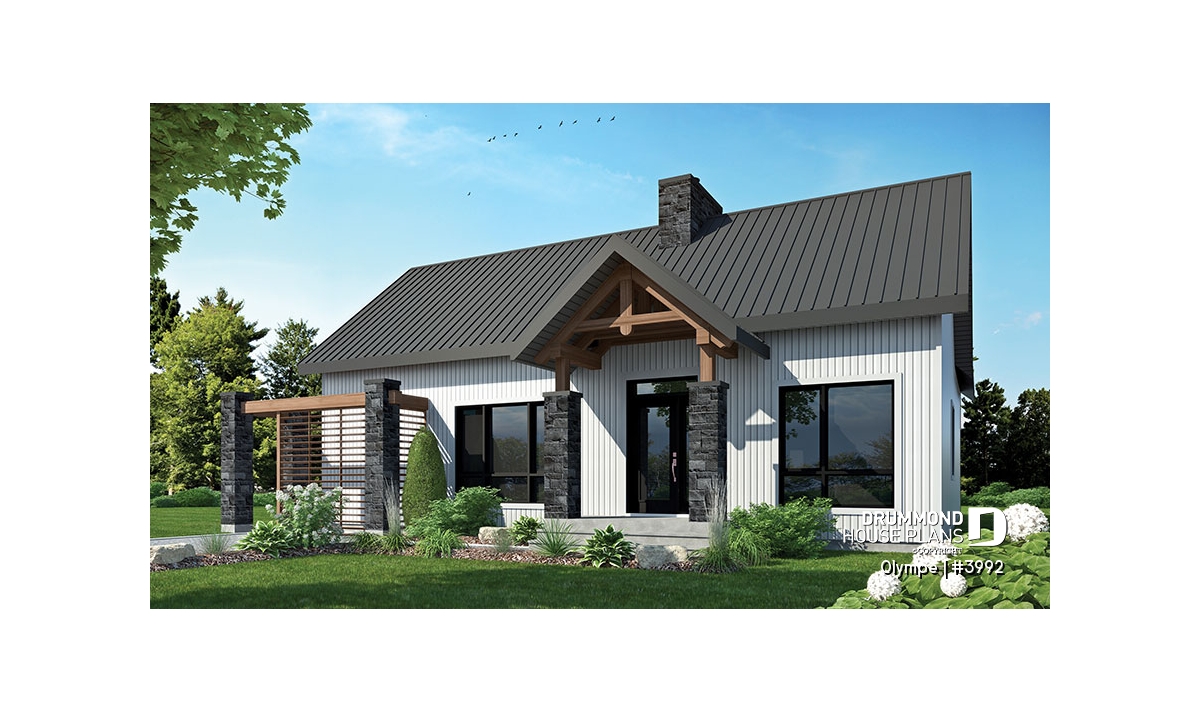 The OLYMPE floor plan (plan #3992) captivates at first glance with its elegant, timeless appeal. Whether you imagine it overlooking a lake or nestled at the foot of a ski mountain, this bungalow instantly evokes the cozy retreat you can’t wait to step into—summer or winter.