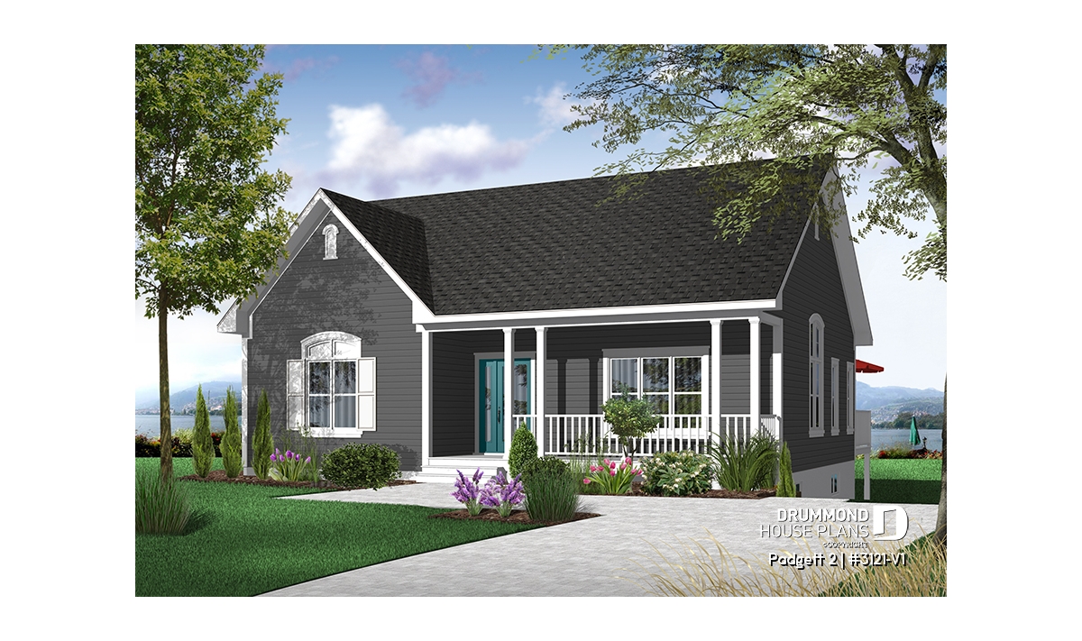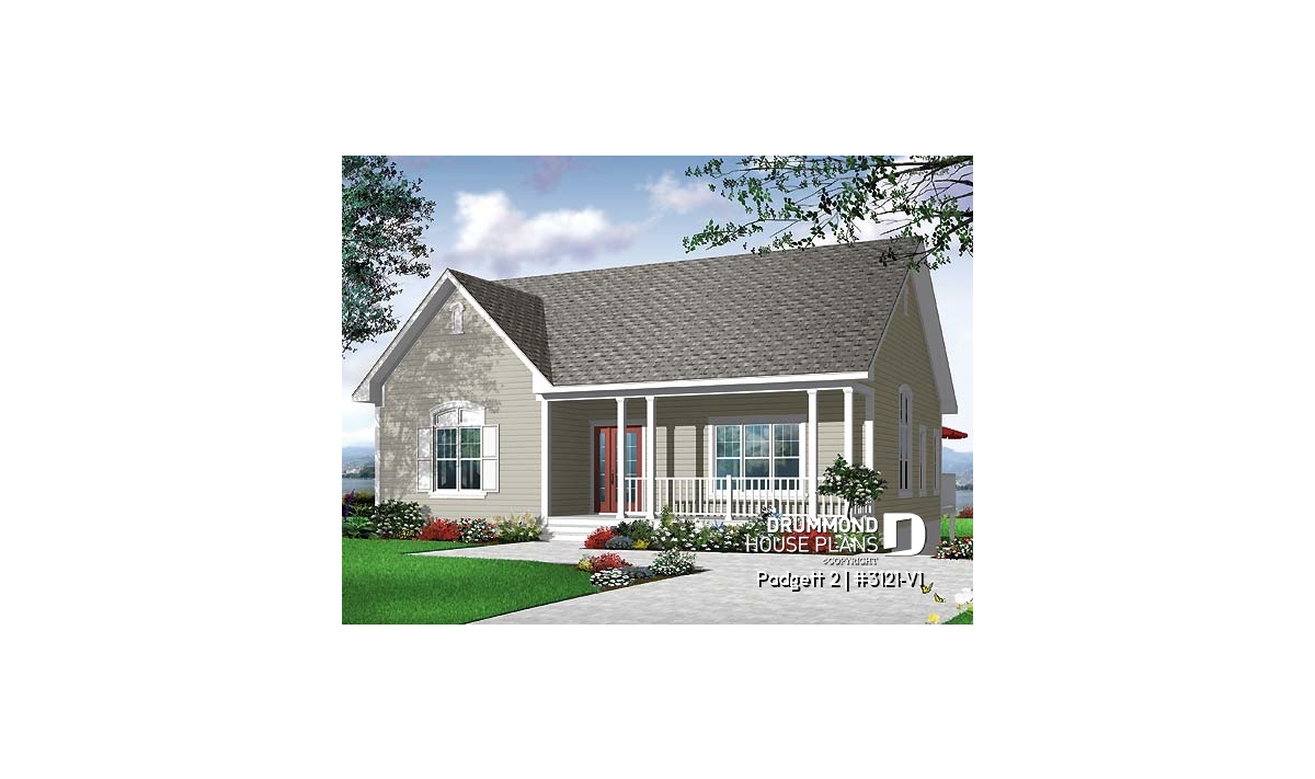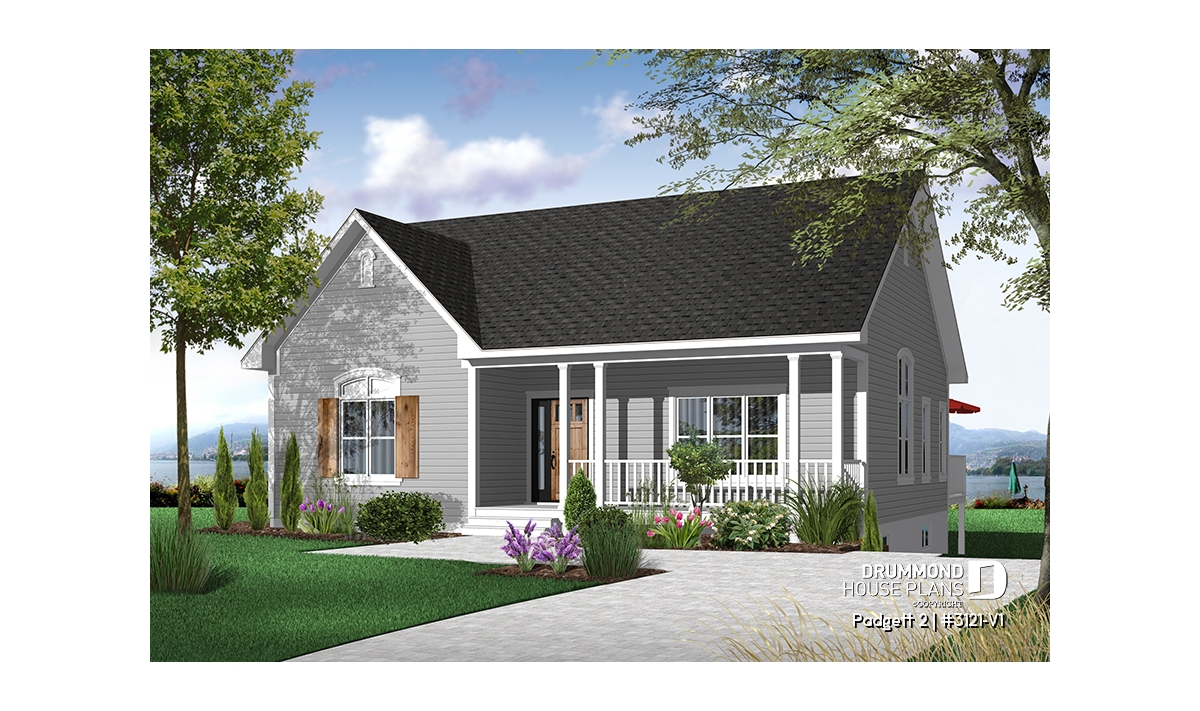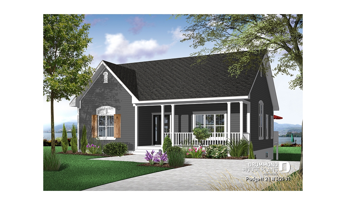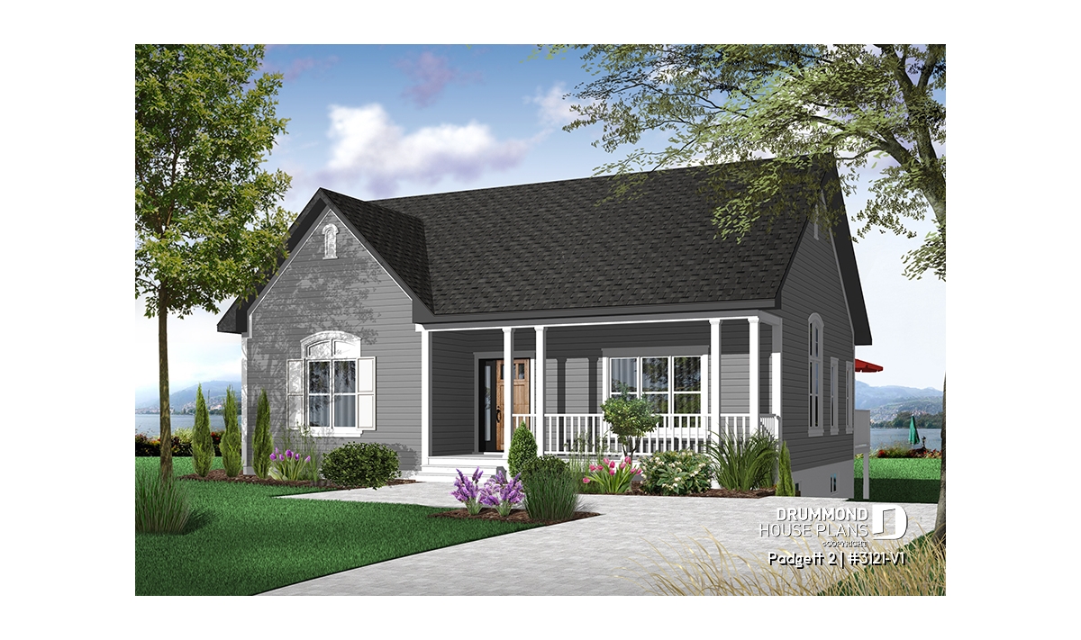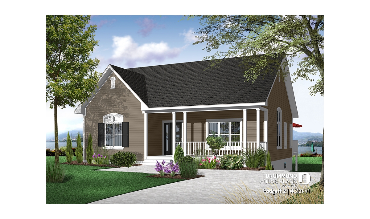 A front porch with picket railing creates a pleasing welcome to this compact cottage. An enclosed entry provides a nice weather shield and, upon entry, the eye travels upward to the 9' ceiling which adds a feeling of an enlarged space in the living room. The living room is separated from the kitchen and dining area by pocket doors allowing your choice of open space or separation.