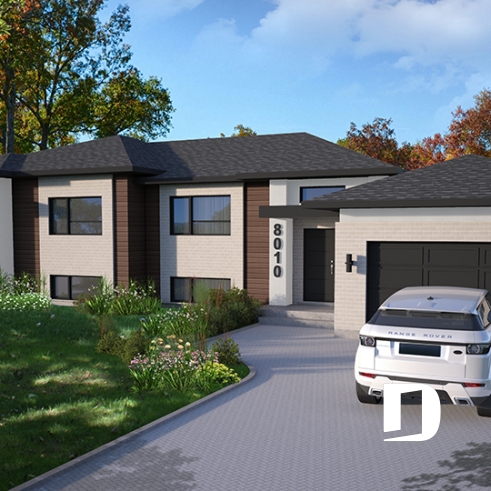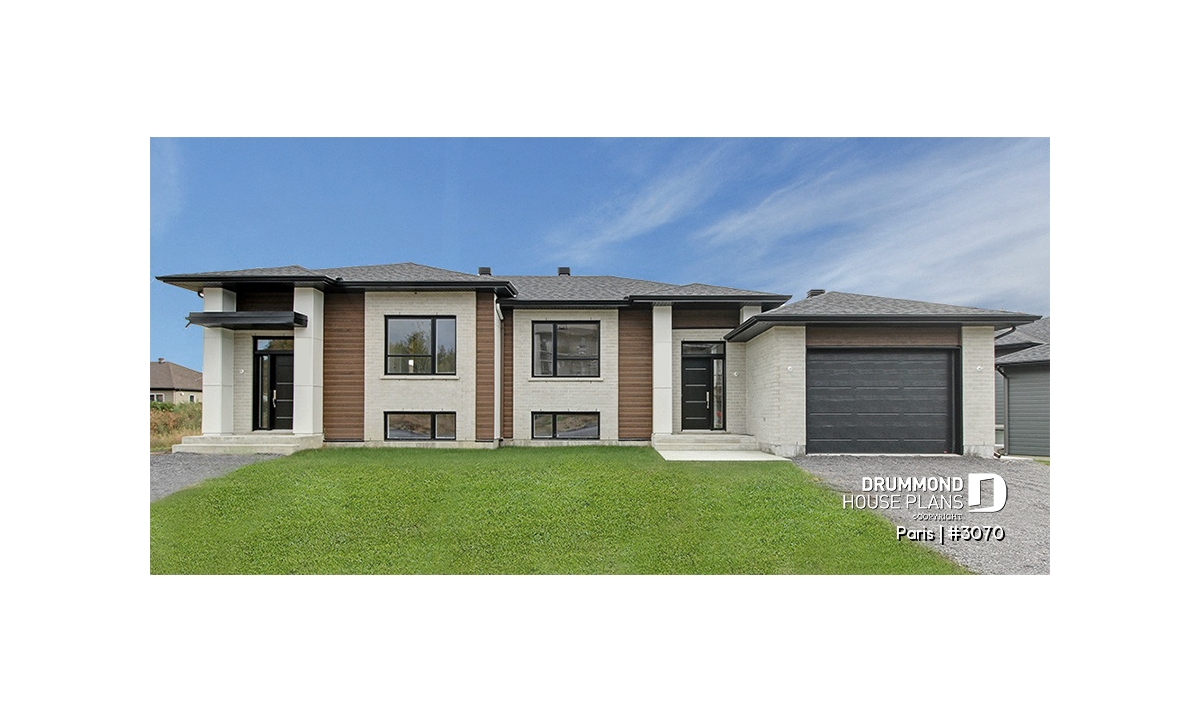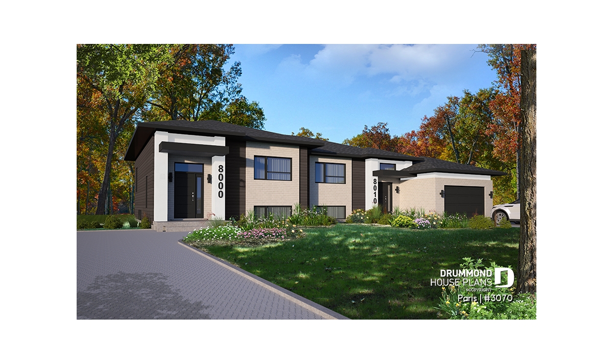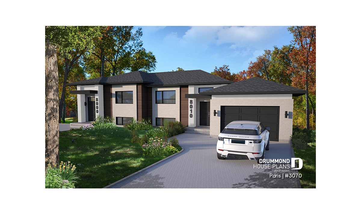 We invite you to discover our new semi-detached home plan #3070 that we also named Paris. It offers a single garage on one side and its modern cubic style in addition to the hip room contribute in giving it very unique and original look.