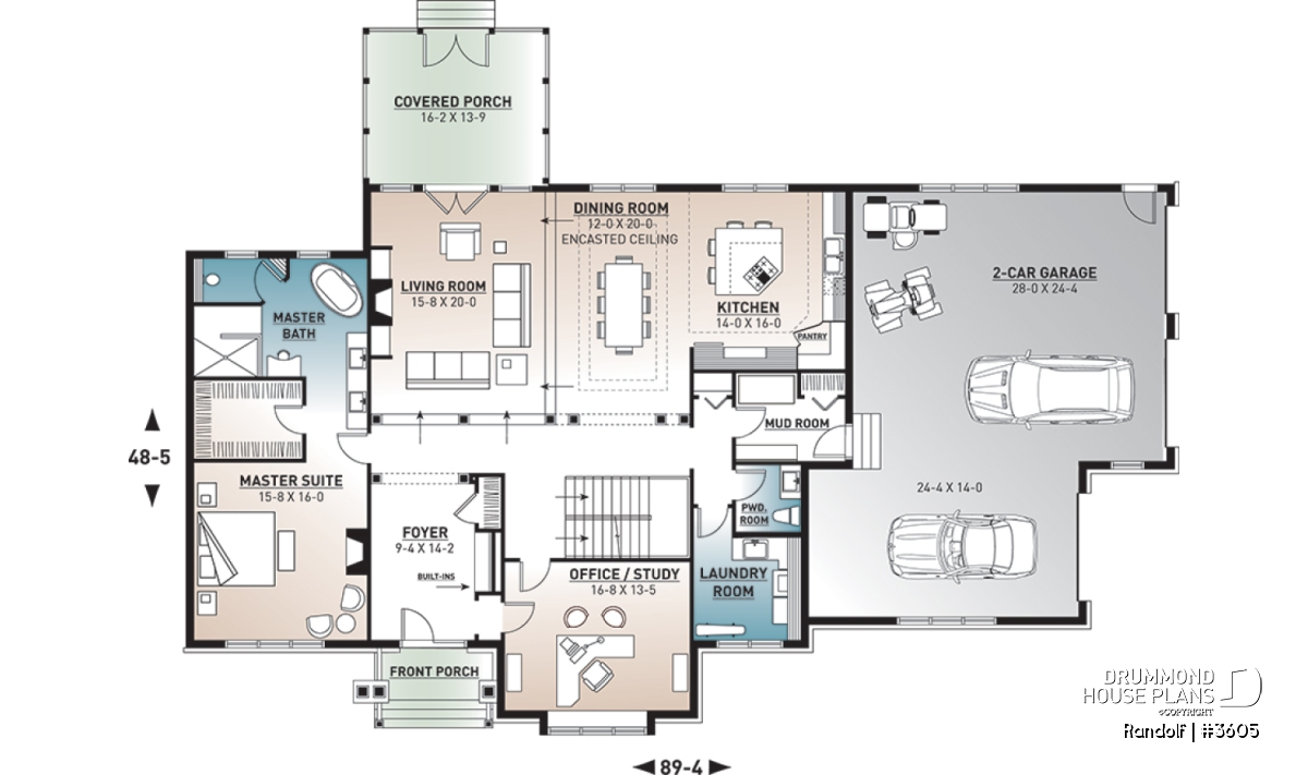 Screened porch, Fireplace, Mezzanine, Side entry garage, Guest suite, Island, Ceiling over 8', Walk-in master bed., Pantry, Master suite on main, Open floor layout, Office / Study / Den, Gound floor laundry room, Living bonus space, Loft, Built-ins, Oversized garage, Double sinks, Separate bath and shower, Mud room