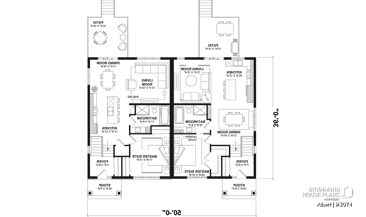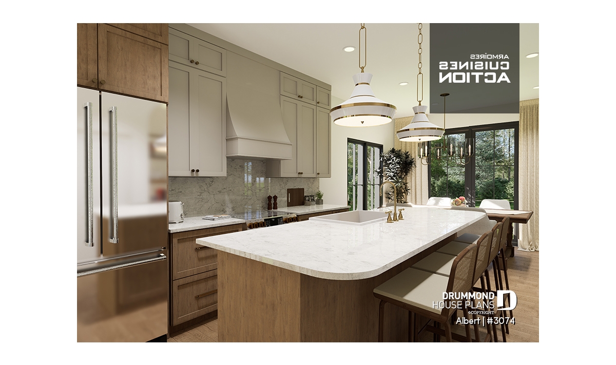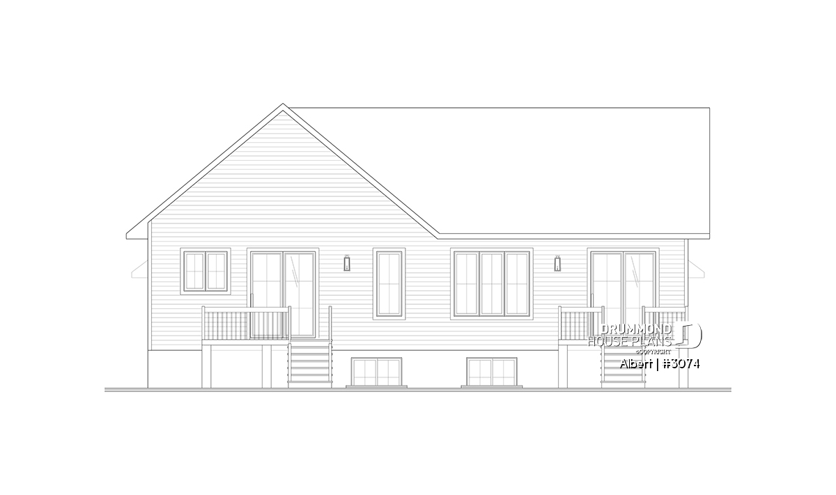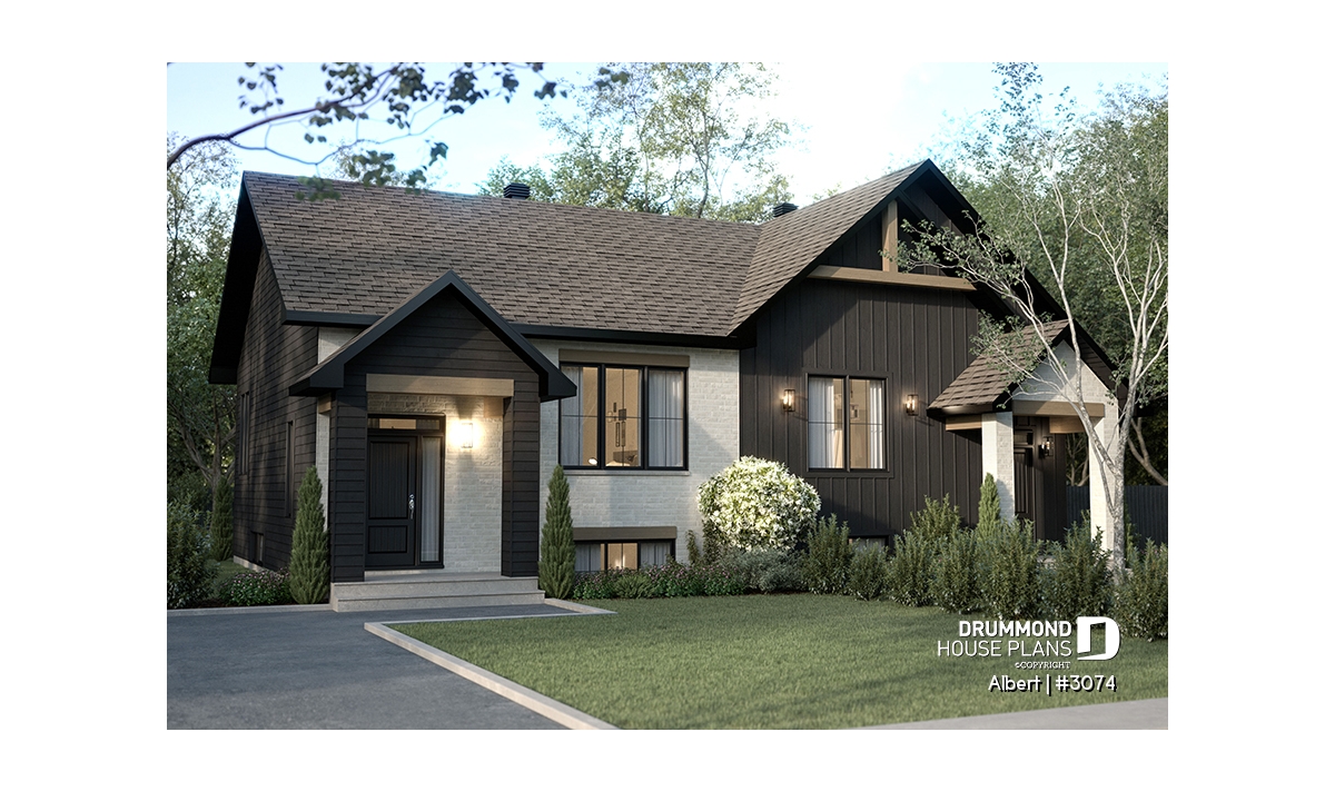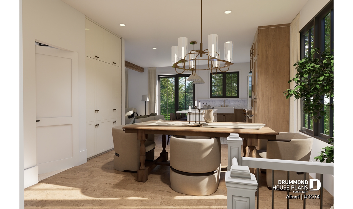 The ALBERT house plan (semi-detached plan #3074) offers a total of 3,600 sq. ft. on the ground floor and fully finished basement. Each of the dwellings therefore has a total of 1,800 sq. ft. on the ground floor and finished basement. The modern yet rustic style will attract the eye as much in the countryside as in new residential areas! Also note that both dwellings offer 9' high ceilings on the main floor.