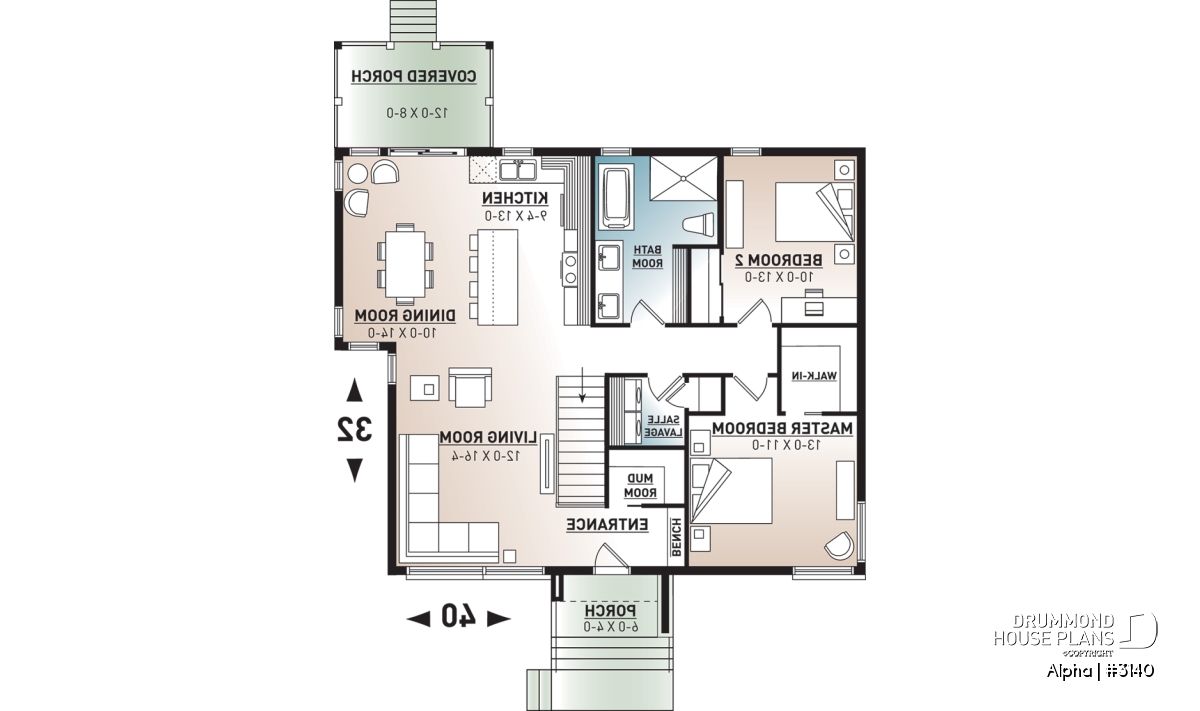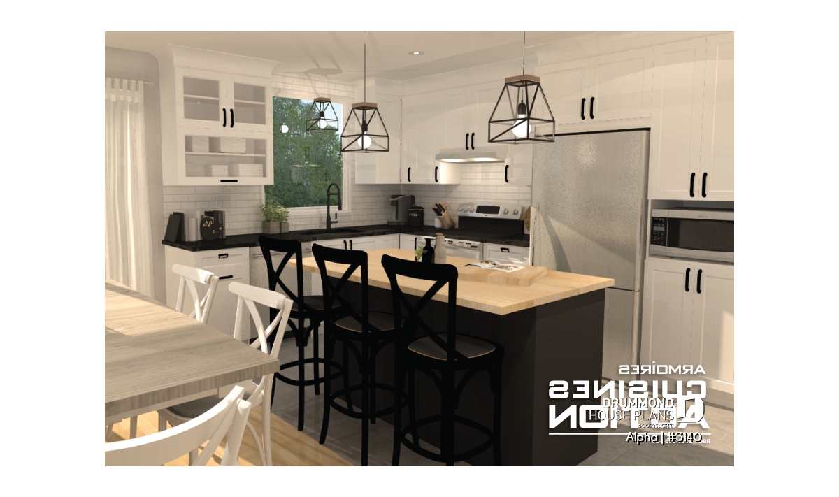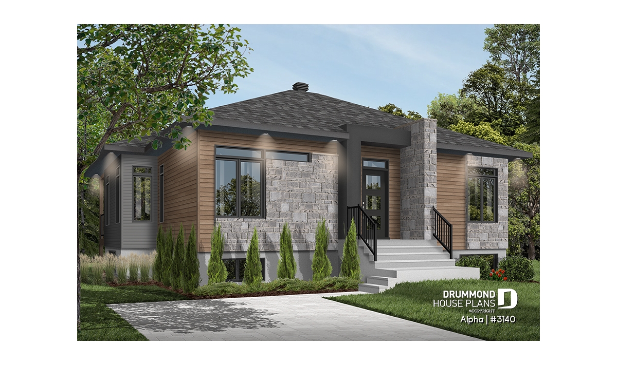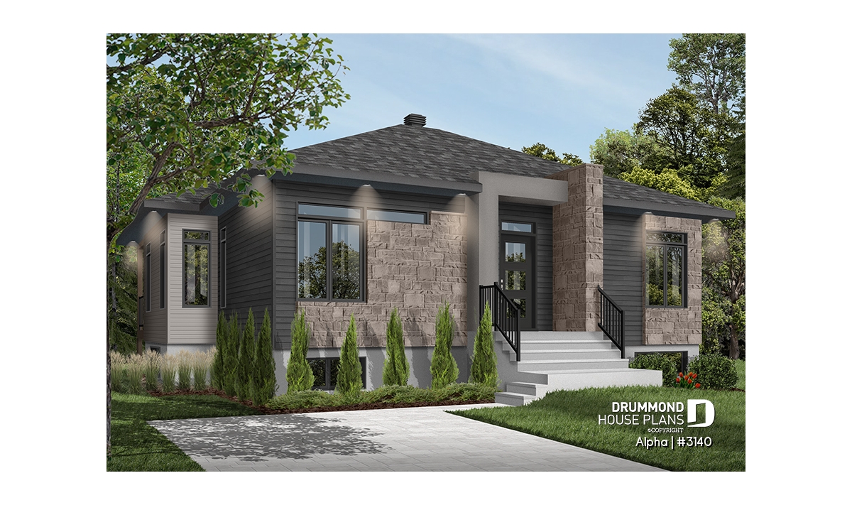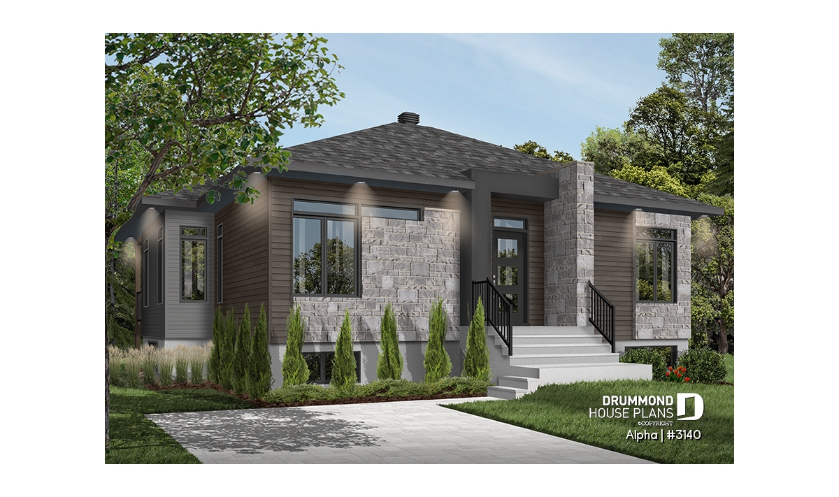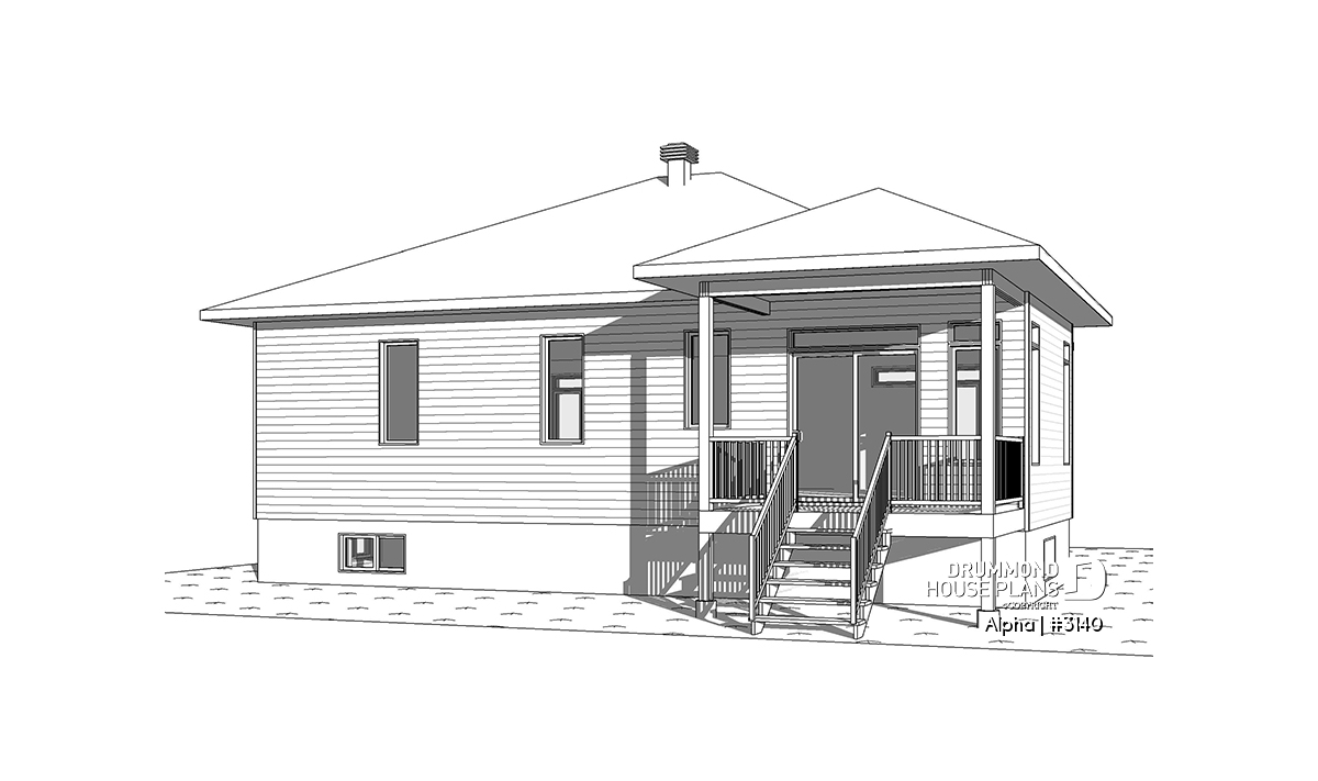 Plan no. 3140 offers 2 bedrooms on the same floor and 1207 heated sq. ft. The parents' bedroom, 13 'x 11', has a large walk-in closet. The large family bathroom with separate bath and shower, has double sinks. A laundry room near the bedrooms, will be convenient and highly appreciated. The kitchen is open to the dining room, and includes a large island that can easily accommodate 4 guests. A small reading area is set back in the dining room. The living room is open on the kitchen / dining area. The entrance is spacious and has a large walk-in closet and a sitting area. The 1207 sq.ft. unfinished daylight basement can be finished later. Many other foundation options are available.