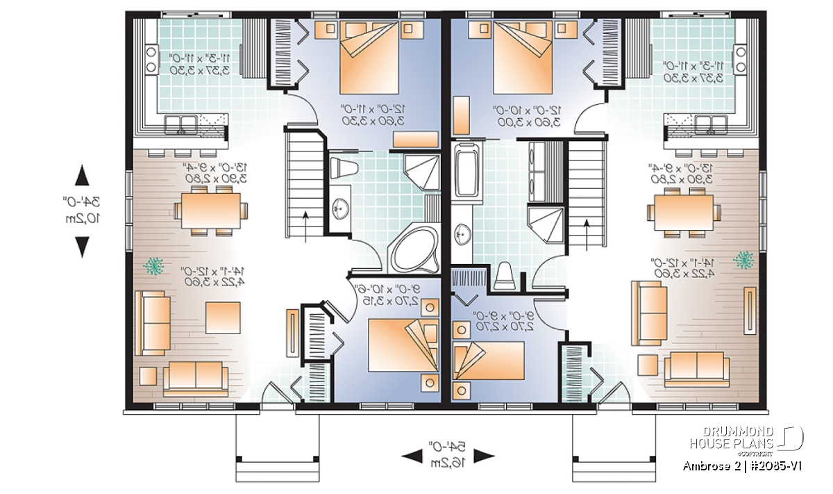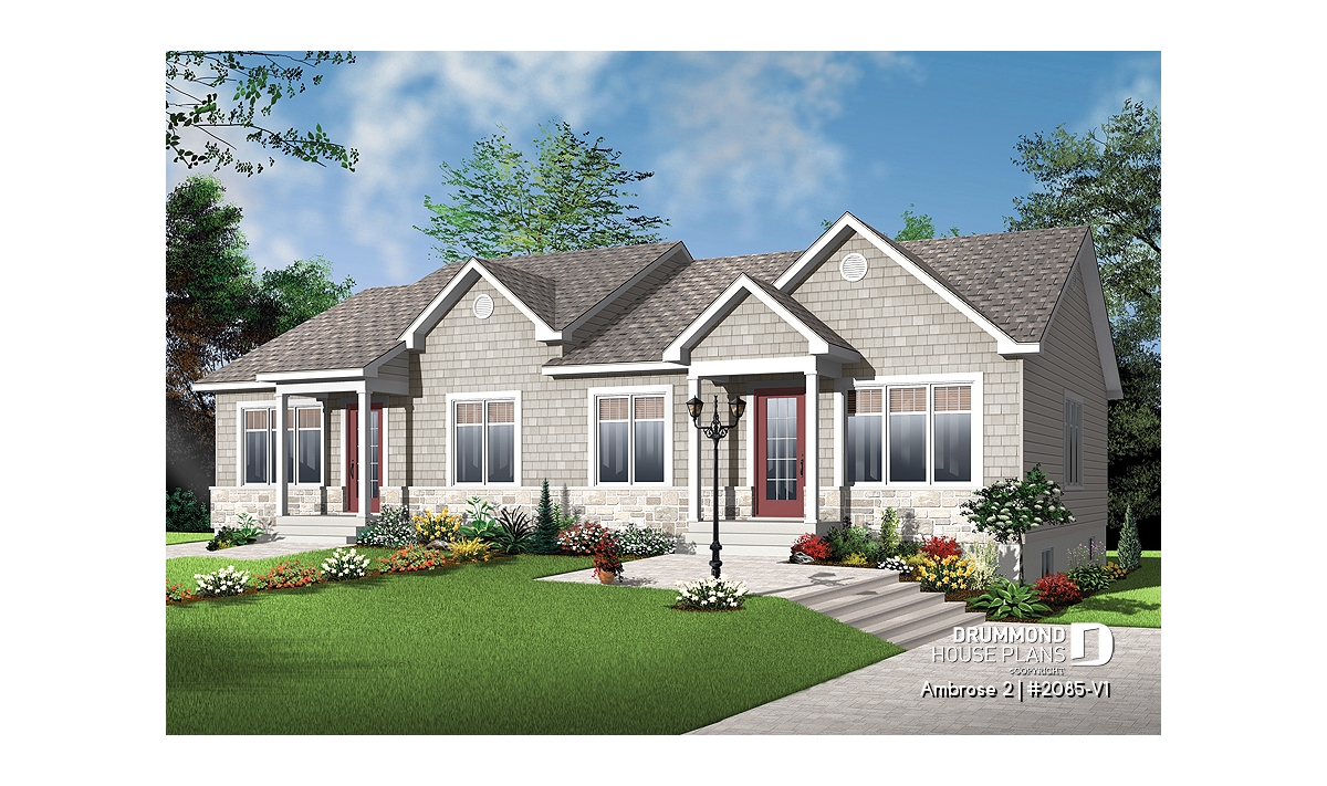 Designed from the very popular plan [url =http://www.drummondhouseplans.com/house-plan-detail/info/1001717.html] 2085 [/ url], this version includes a modified “craftsman” style exterior. Shingle siding and stone provide a more organic presence and distinctive entries provide a welcome to each unit.