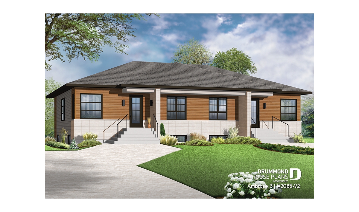Well-separated patio placement allows a more intimate outdoor space for each unit. Additional recreation or living space can be added by developing the basement.