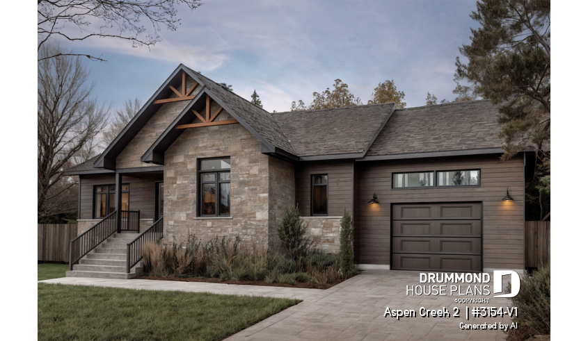 The following country-style 2-bedroom bungalow with garage plan, Aspen Creek 2 (3154-V1), offers us 1,344 square feet of living space, in which multiple stages of life can accommodate.