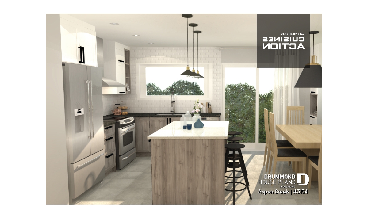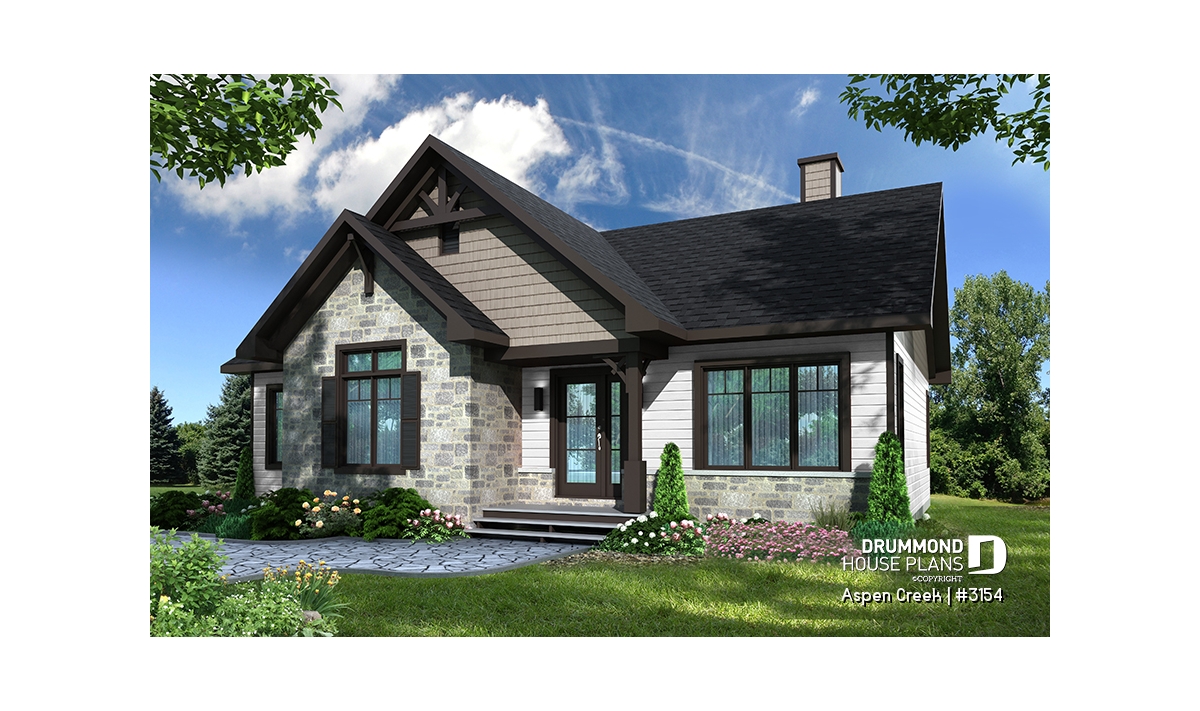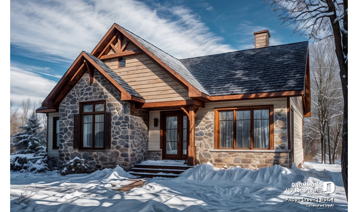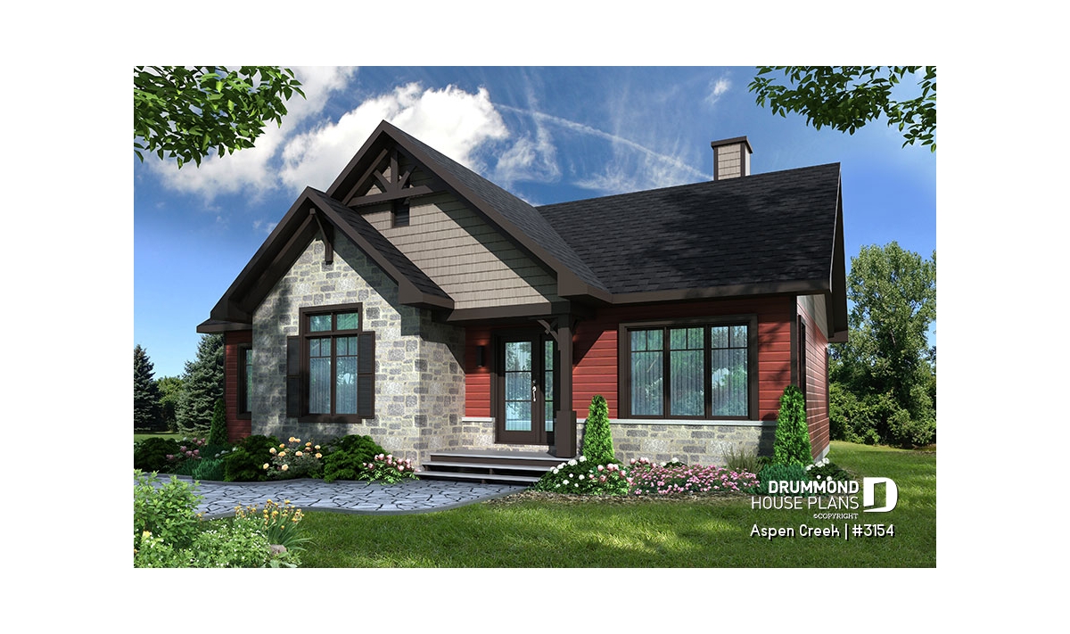 New transitional style house plan, with a rustic look and warm colors, also incorporates elements borrowed from the Modern house style such as windows with dark moldings for example. This new Drummond House Plans, rustic modern home design, named Aspen Creek, or plan # 3154, will charm you and here’s why…