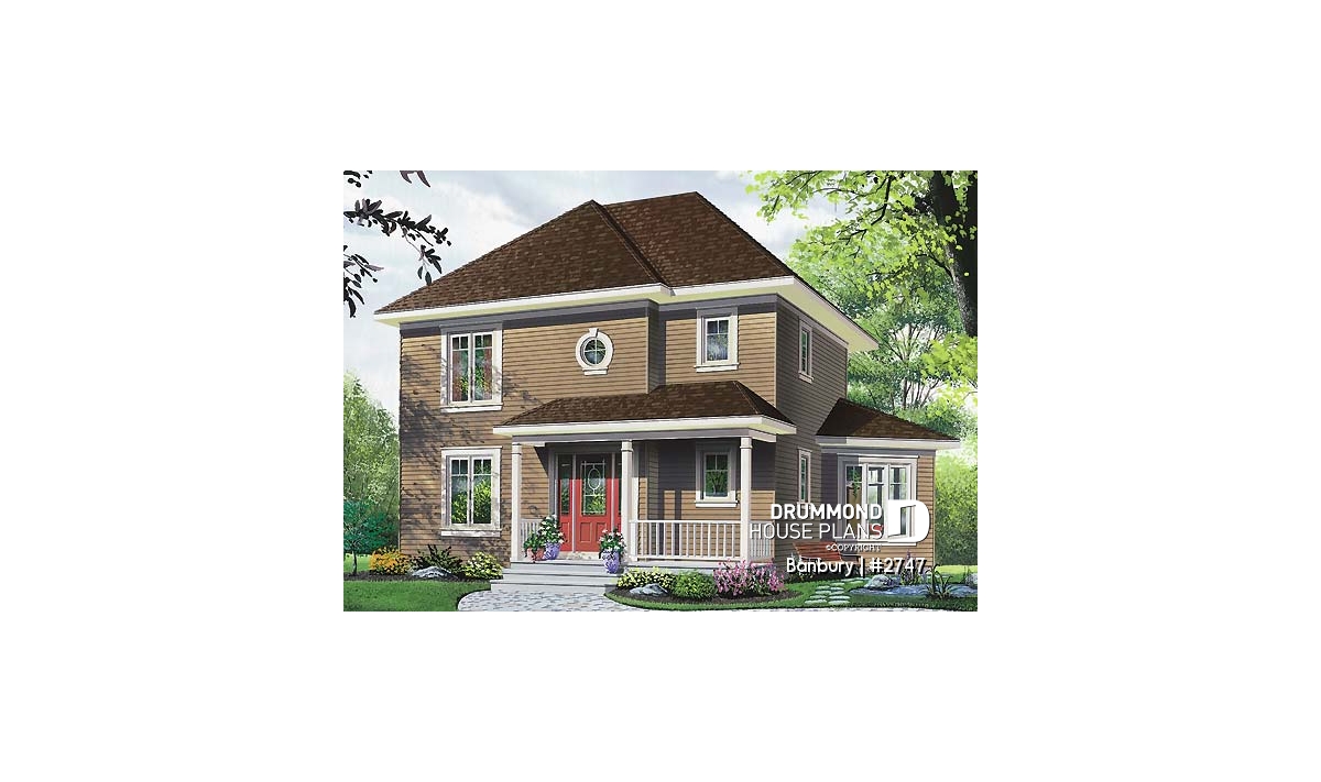 Country-style front porch and siding are unexpectedly blended with the contemporary touch of an angled mass which results in a unique exterior and floor plan.