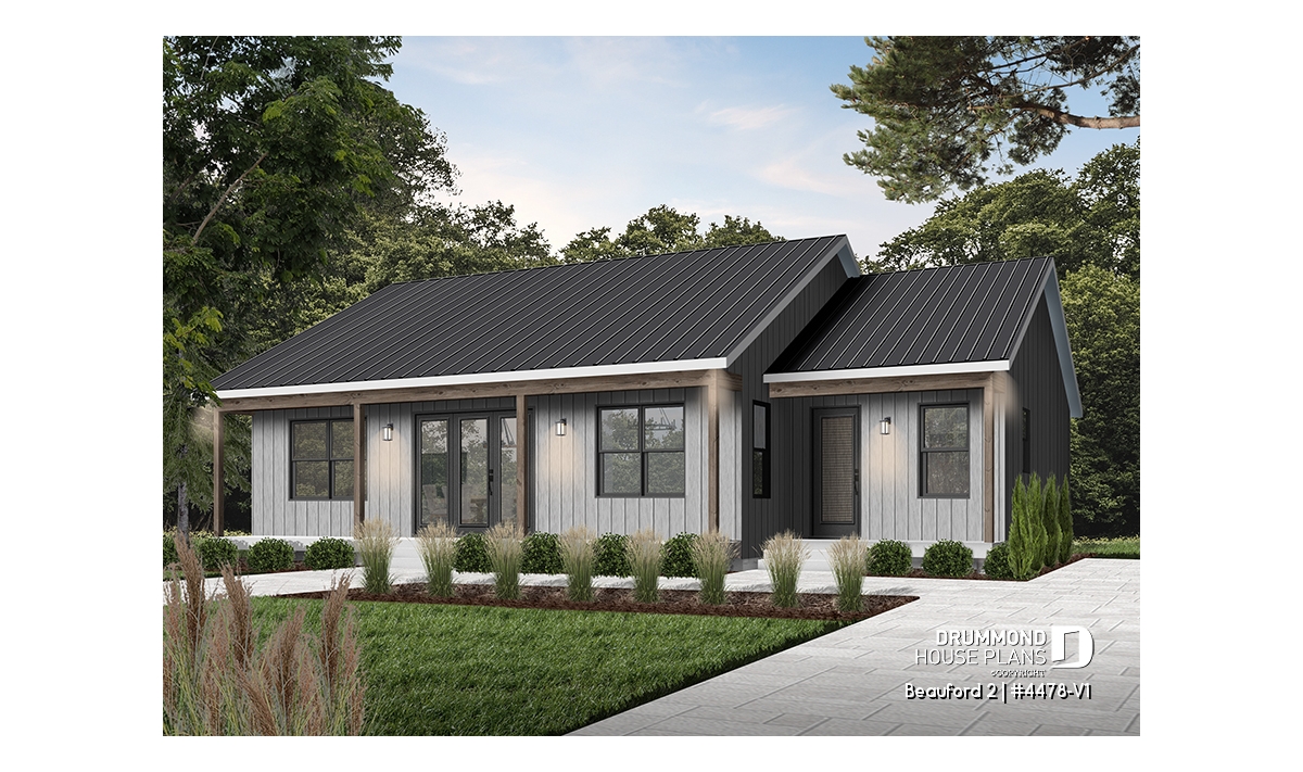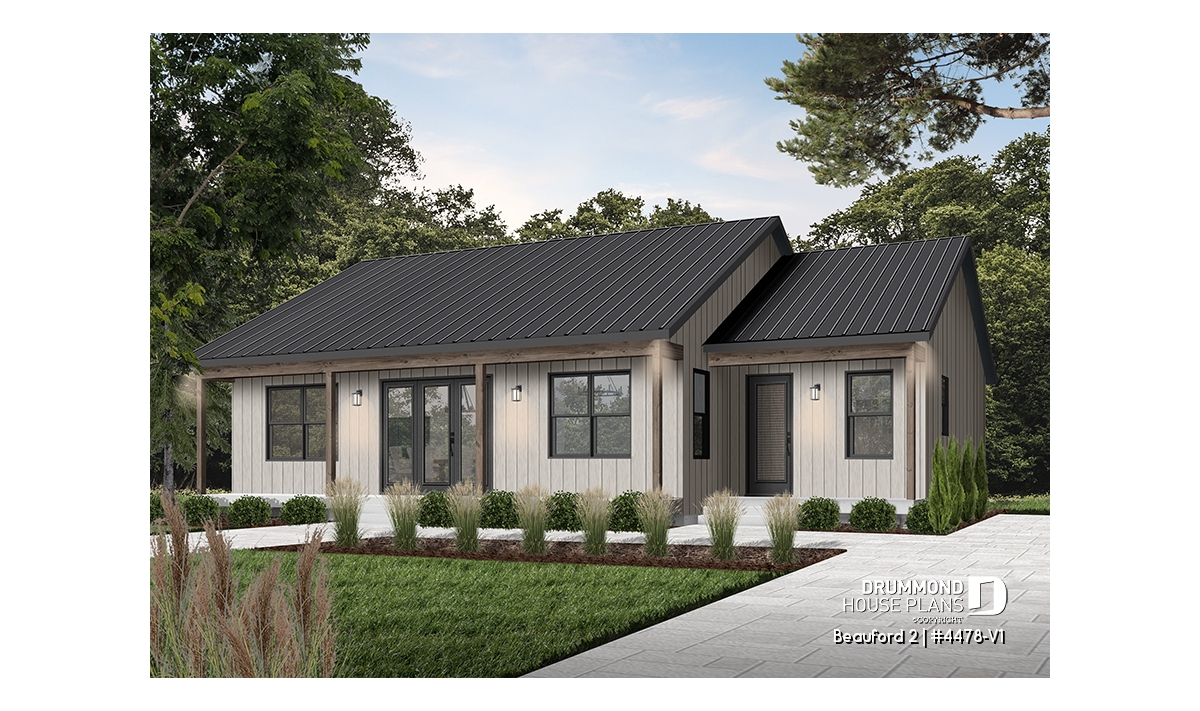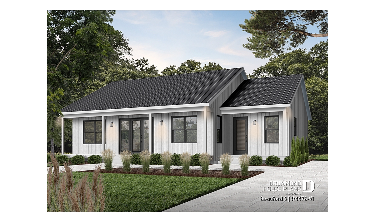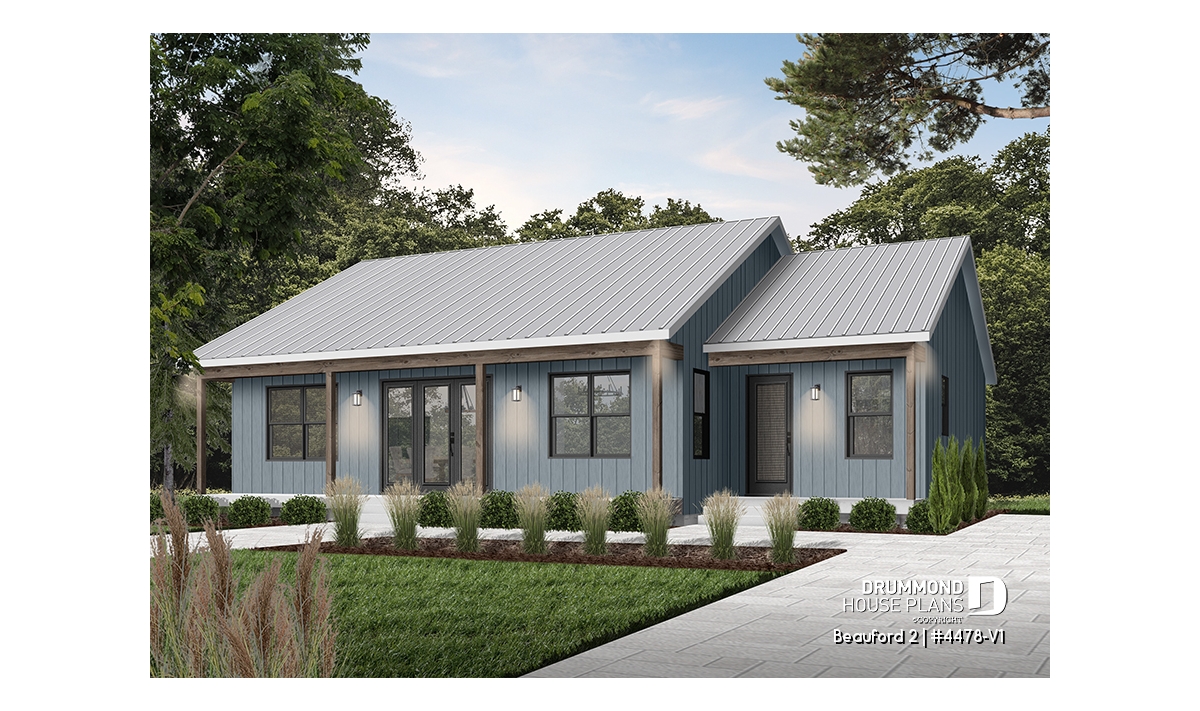 Modern 2 beds, 2 baths Country Ranch style house plan.