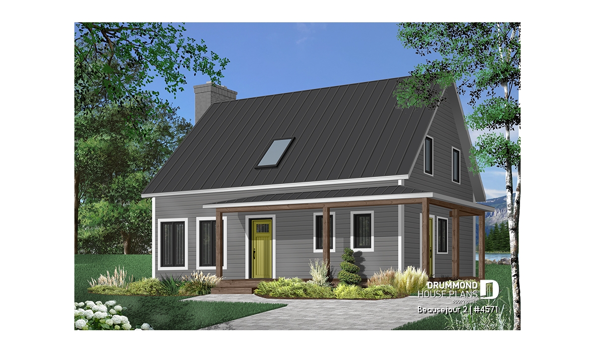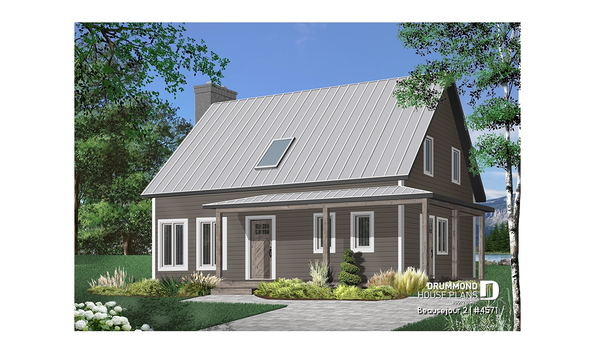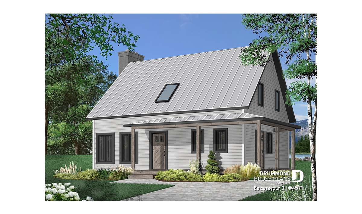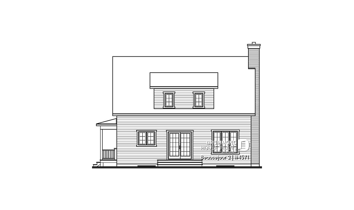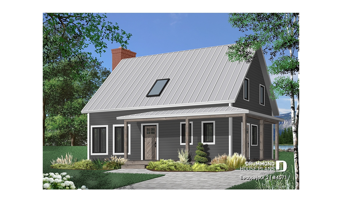 Covered wraparound porch on front and left elevations, built-ins, special ceiling treatments, skylight. Fireplace and double masonry chimney. The chimney is standard with a prefab conduit inside.