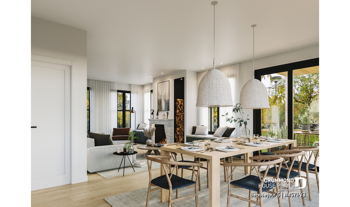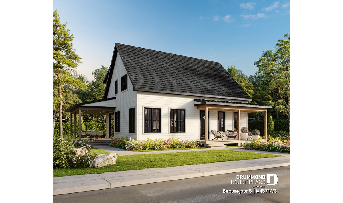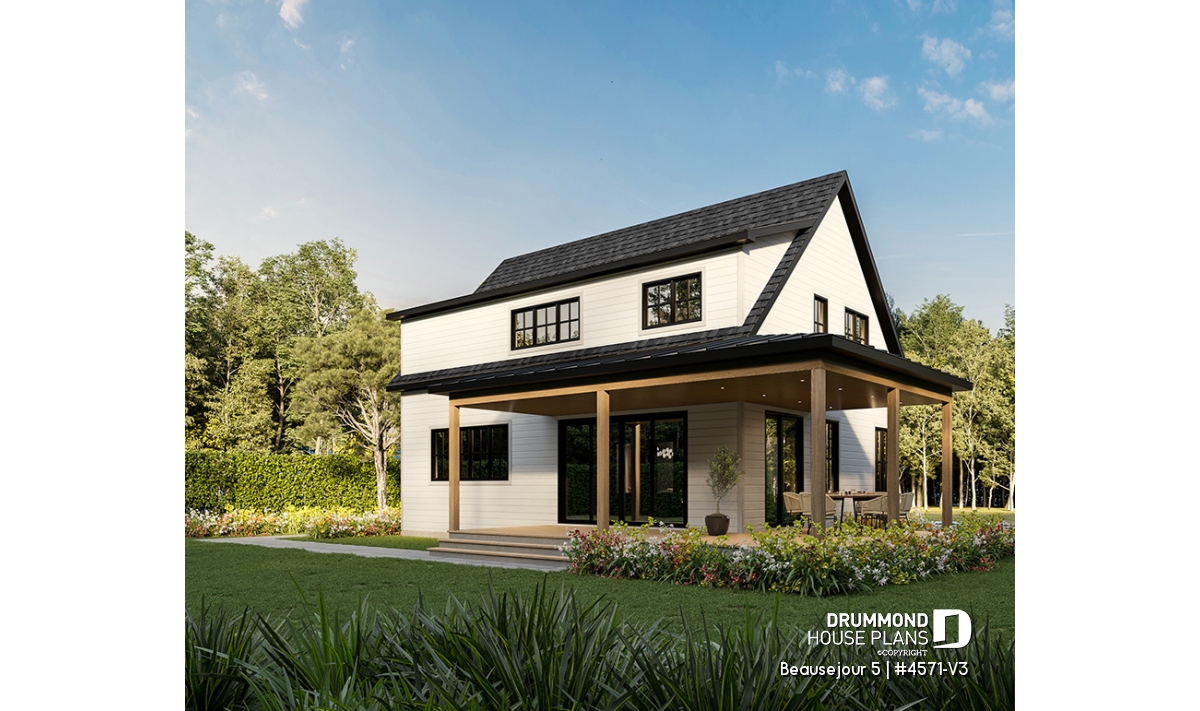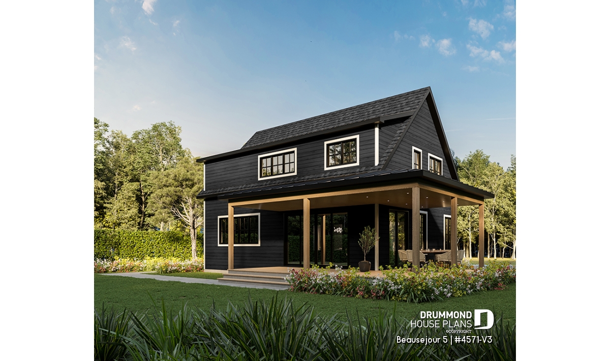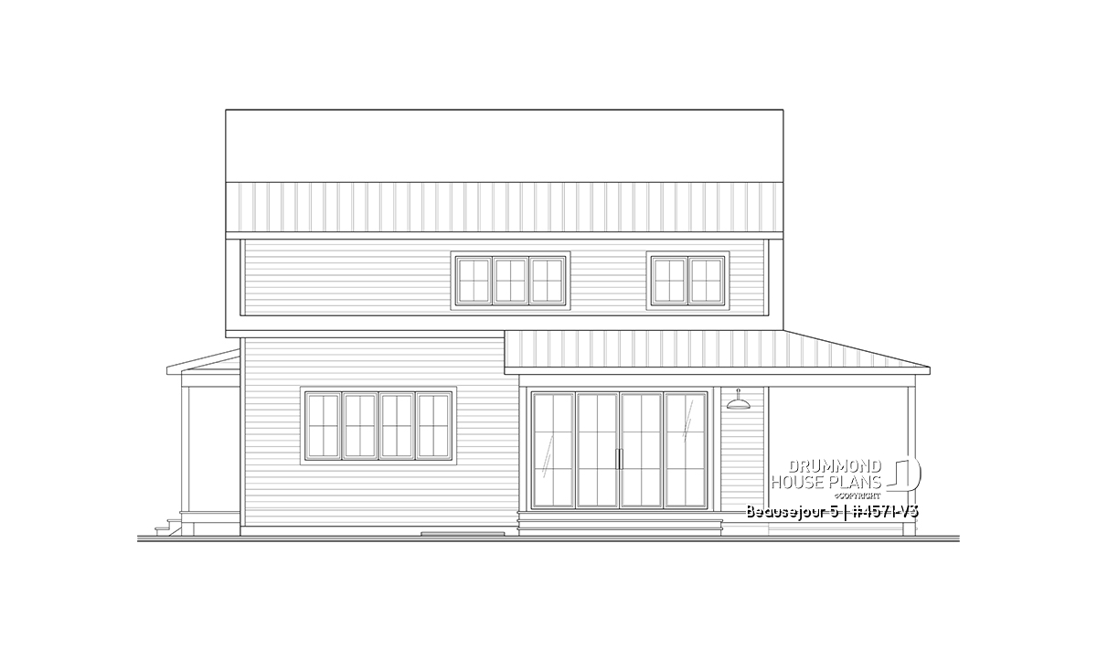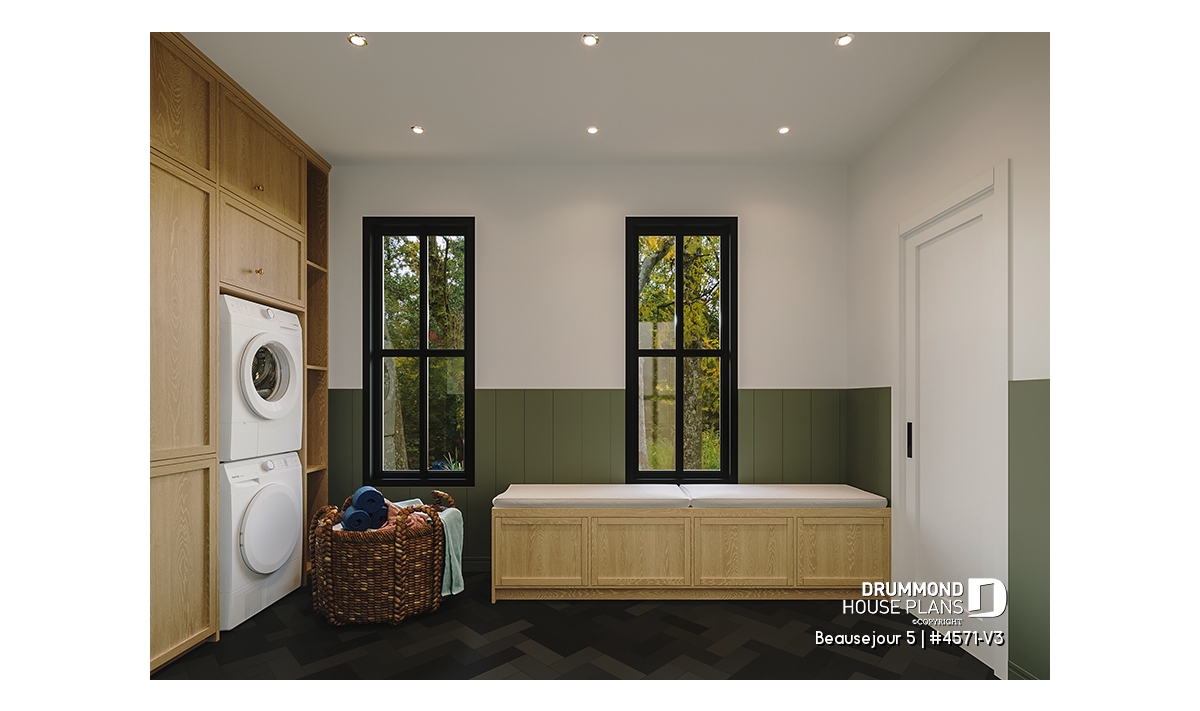 The BEAUSEJOUR 5 house plan (# 4571-V3) offers 2826 square feet on 3 floors. It should be noted that all the ceilings on the ground floor are 9 'high and that there are sloping ceilings in the master bedroom and also in bedroom # 2.