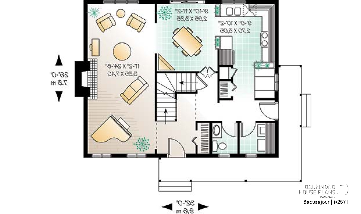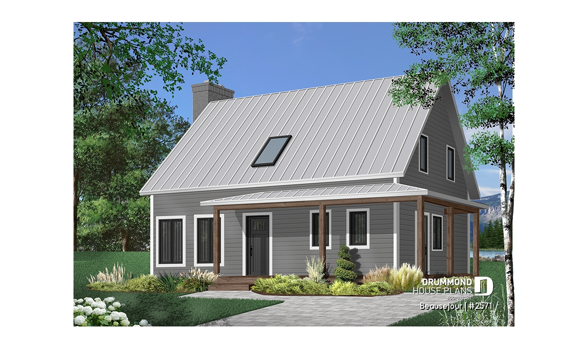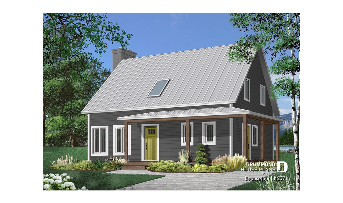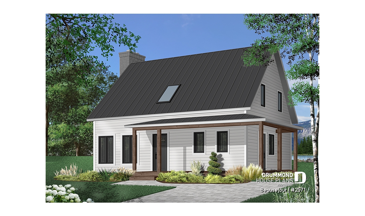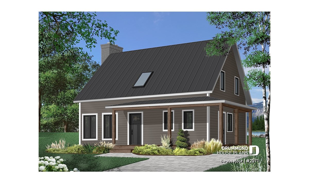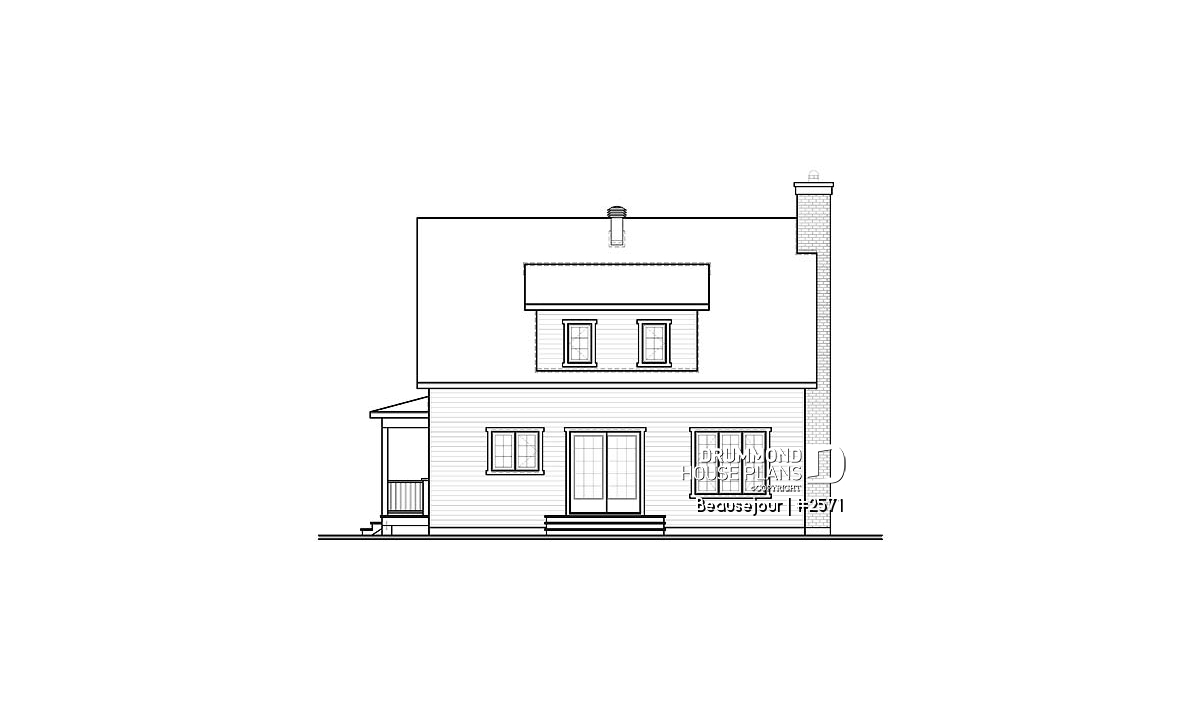 Covered wraparound porch on front and left elevations, built-ins, special ceiling treatments, skylight. Fireplace and double masonry chimney. The chimney is standard with a prefab conduit inside.