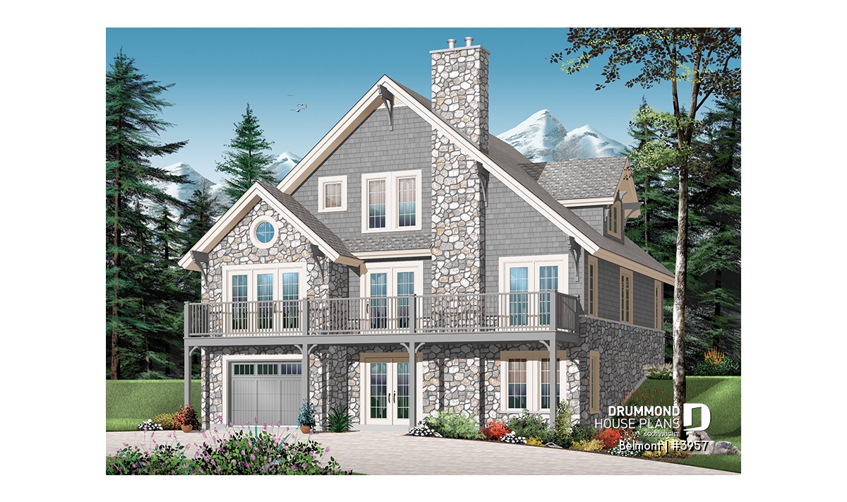 Designed for scenic living near a ski hill, a lake, or any panoramic natural setting, this exceptional mountain-style chalet offers three levels of comfort, flexibility, and architectural beauty. Inspired by the highly popular model 2957 (The Touchstone), this enhanced version 3957 adds valuable square footage, a spacious tandem double garage, and the possibility of integrating a three-stop elevator for optimal accessibility.