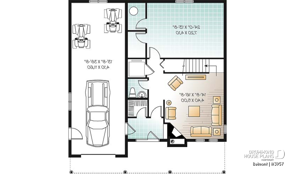 Extra-deep garage allowing for optimal equipment storage.
