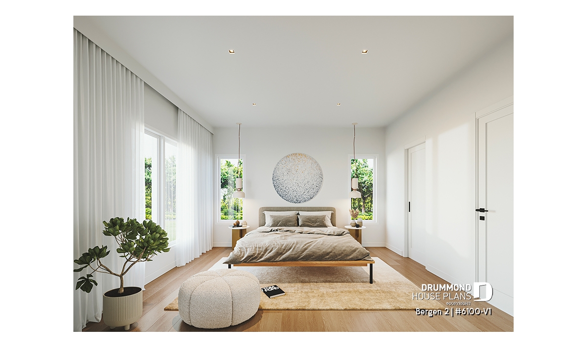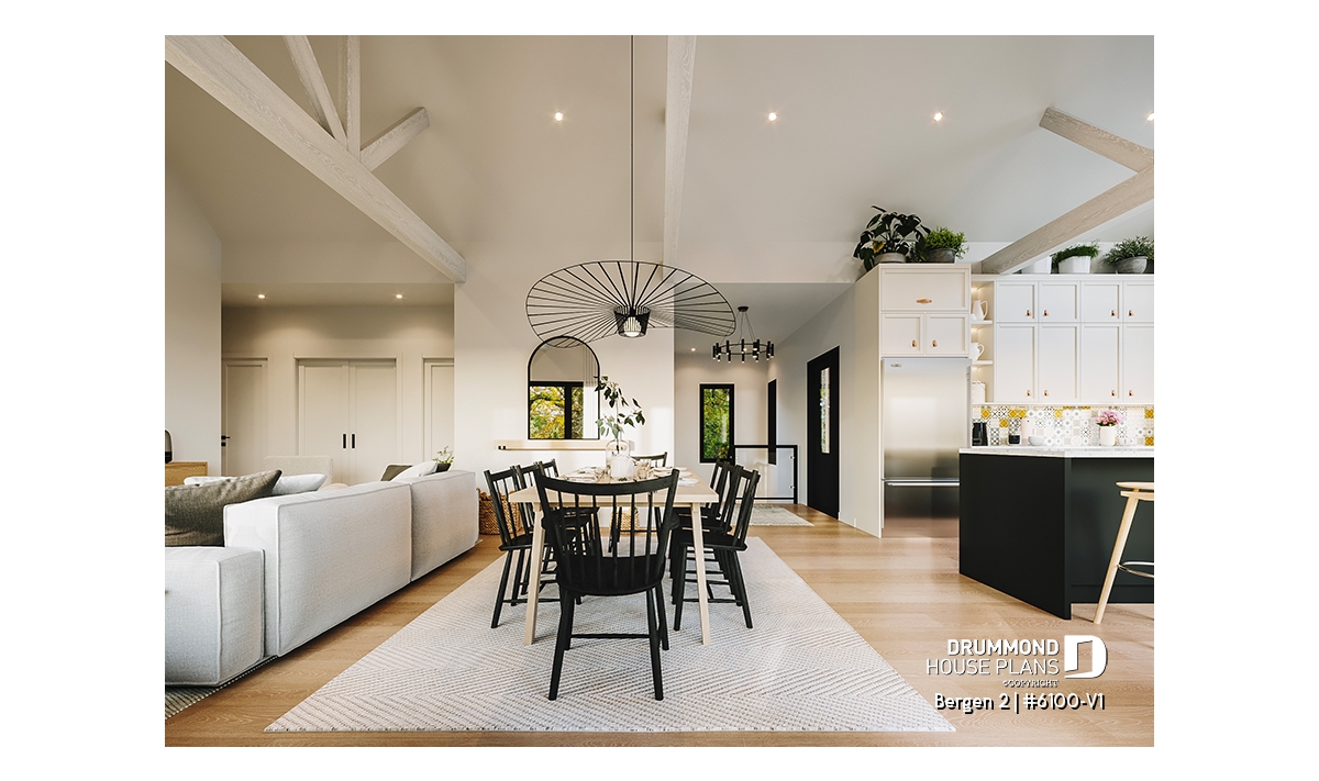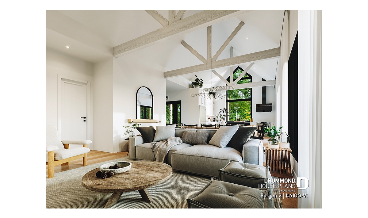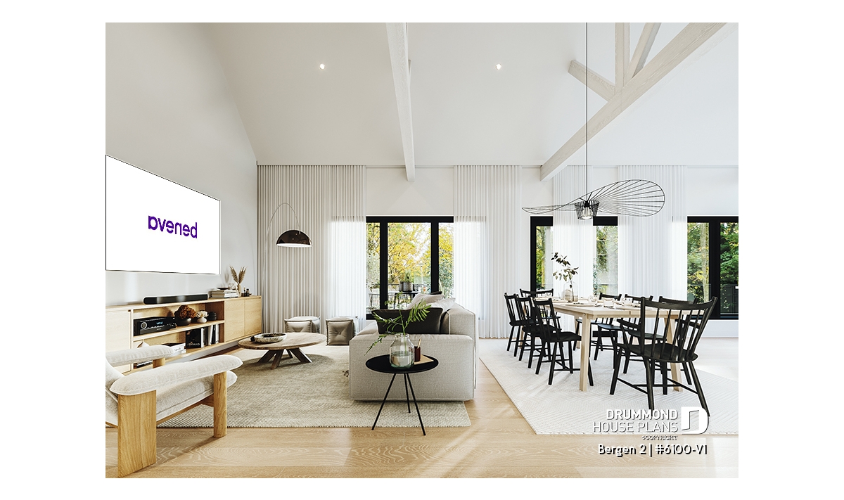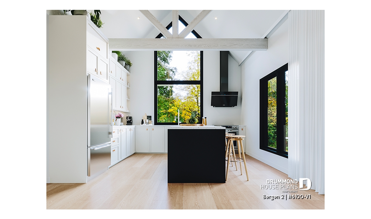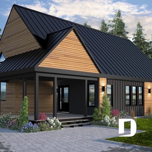 House plan Bergen 2 (# 6100-V1) offers 1260 sq.ft. on a single floor, excluding the basement which is unfinished. This Scandinavian-style house is a slightly reworked version of its base model, Bergen (# 6100).
