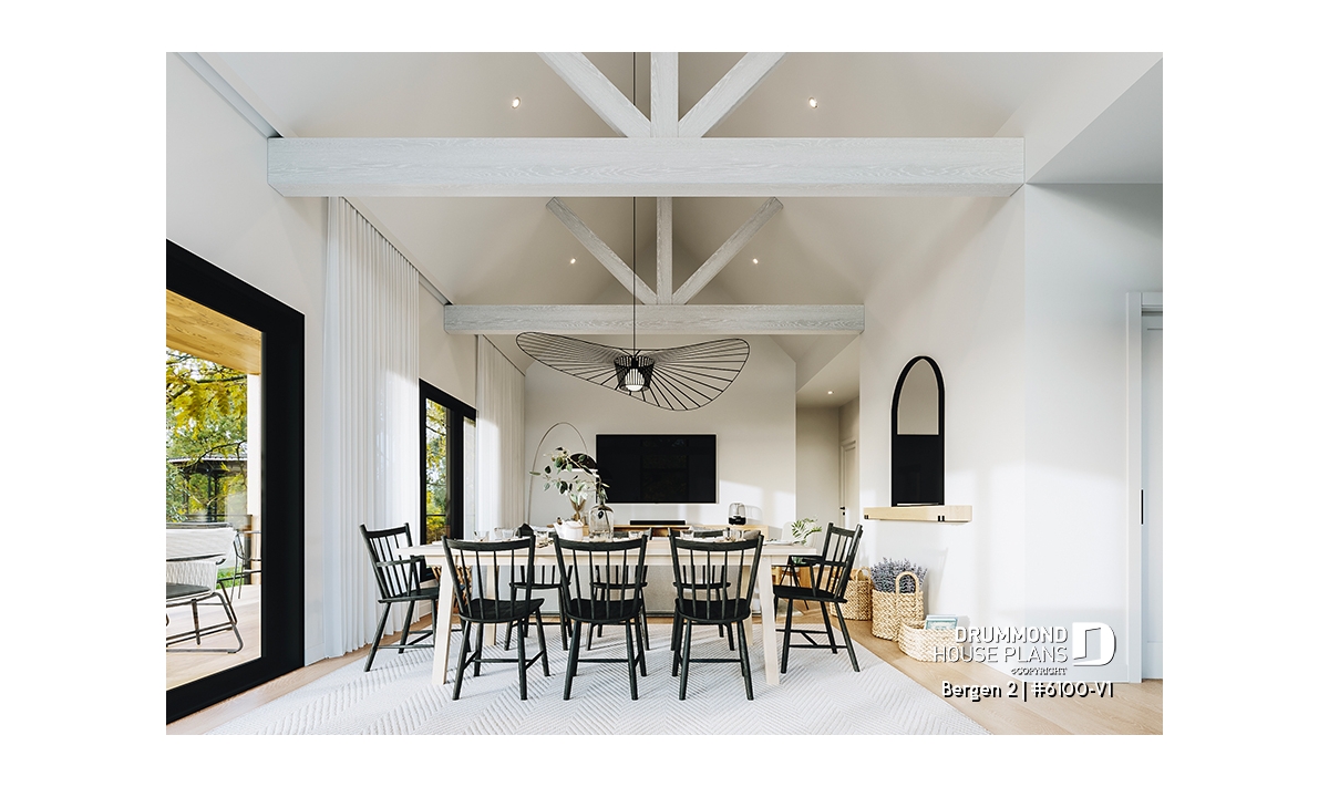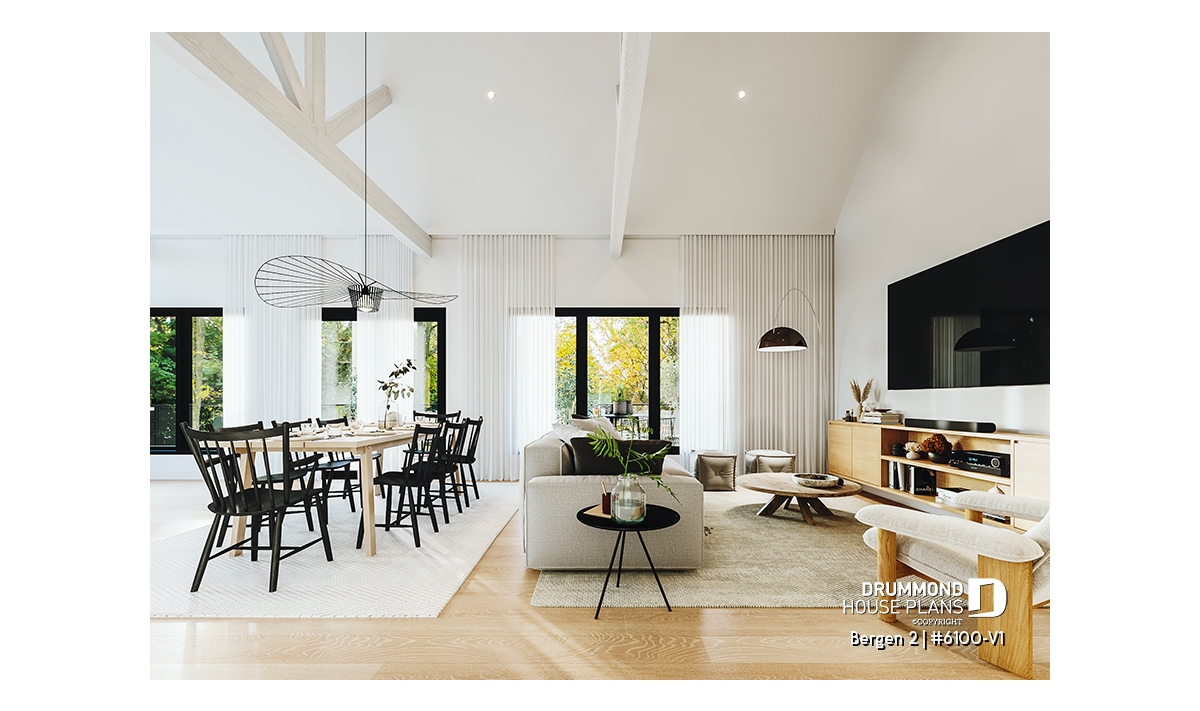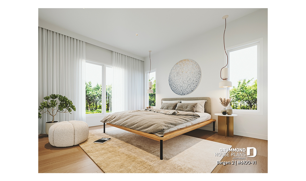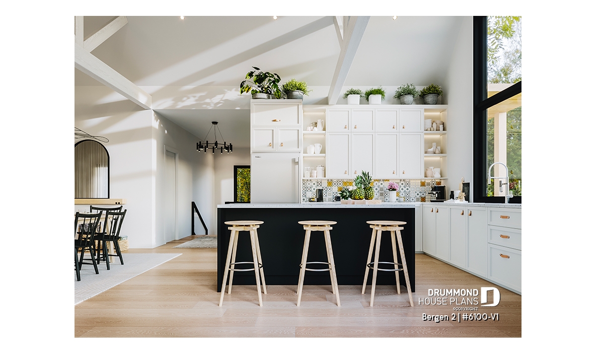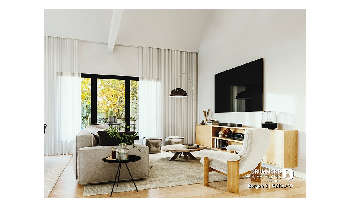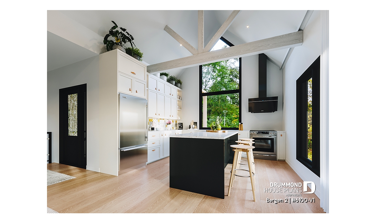 House plan Bergen 2 (# 6100-V1) offers 1260 sq.ft. on a single floor, excluding the basement which is unfinished. This Scandinavian-style house is a slightly reworked version of its base model, Bergen (# 6100).