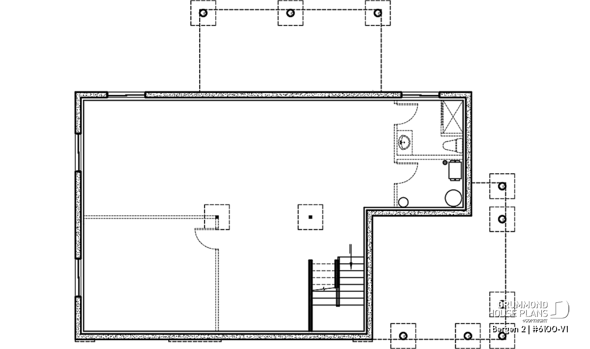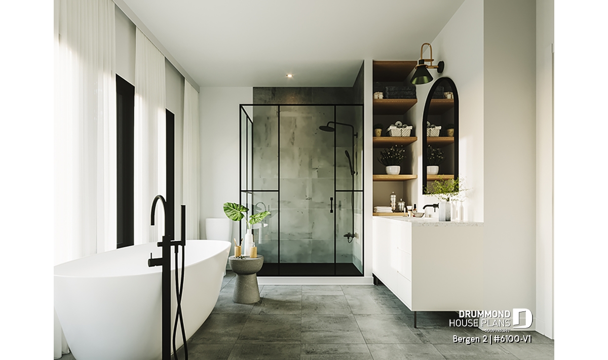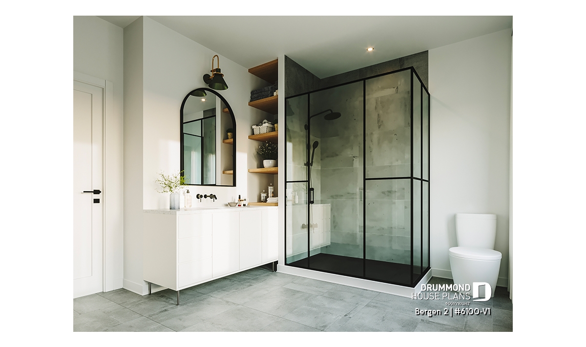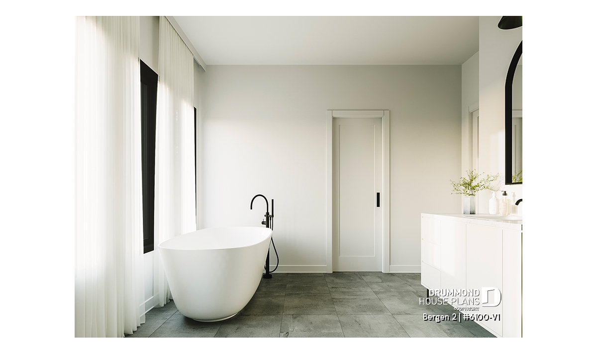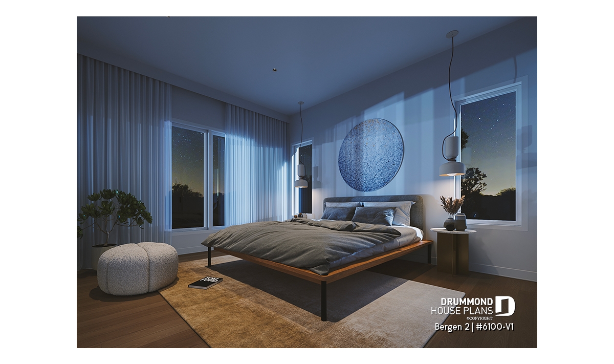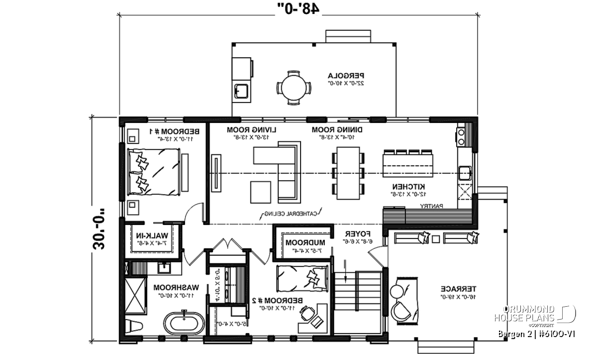House plan Bergen 2 (# 6100-V1) offers 1260 sq.ft. on a single floor, excluding the basement which is unfinished. This Scandinavian-style house is a slightly reworked version of its base model, Bergen (# 6100).