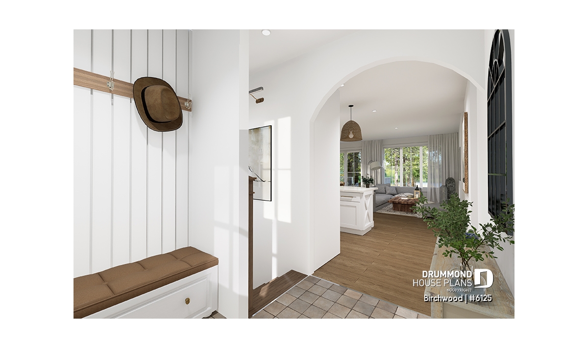 Architectural arch between the entrance and the kitchen, as well as between the shower room and the laundry room in the basement.