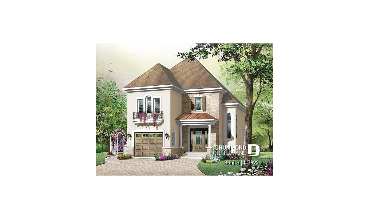 Reminiscent of European charm, this stately home includes fine details like a window box, shutters and pillar supported covered entry.