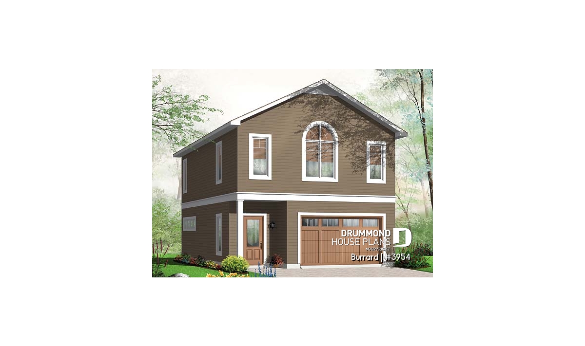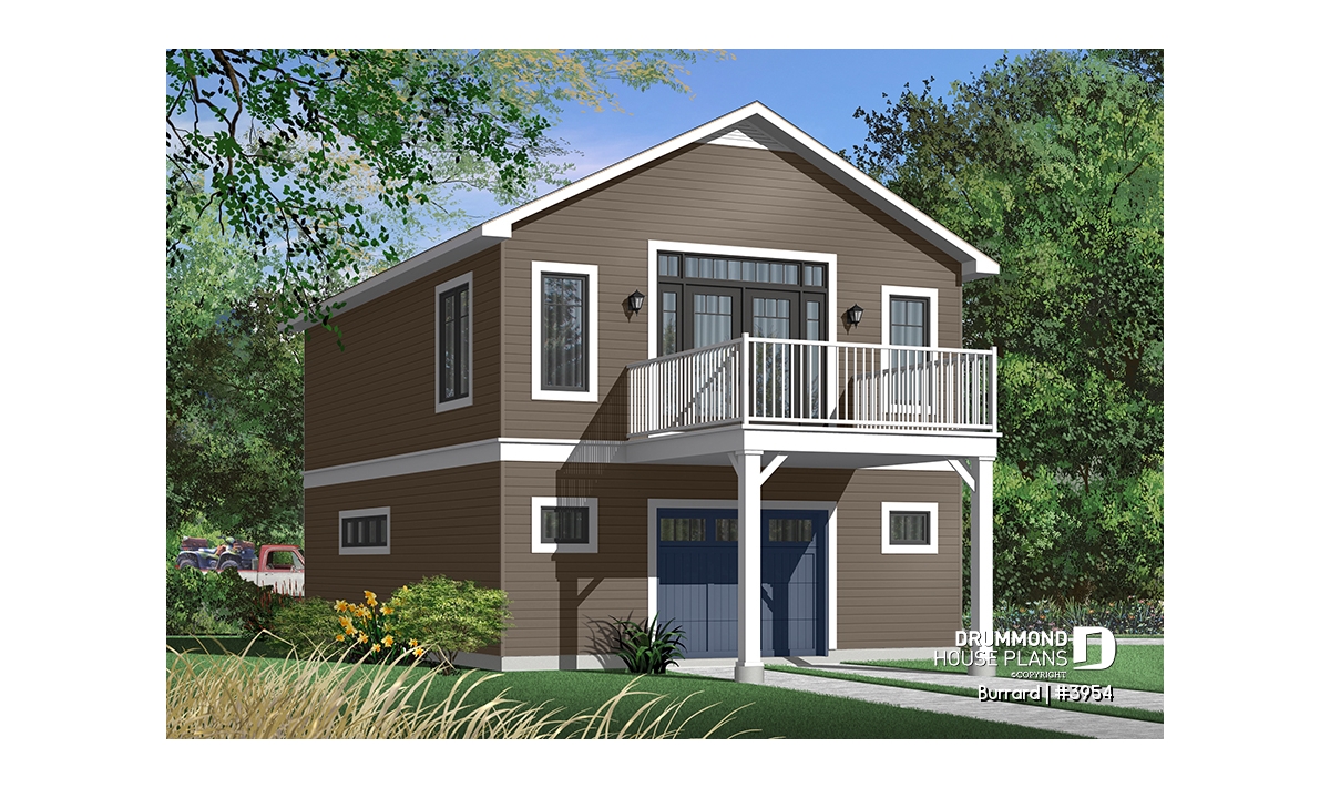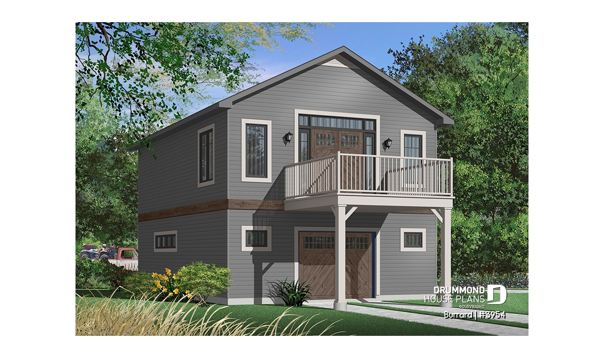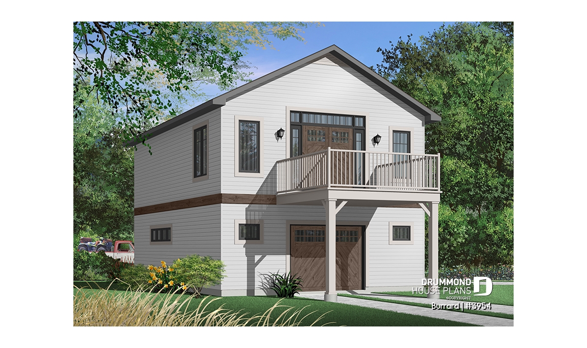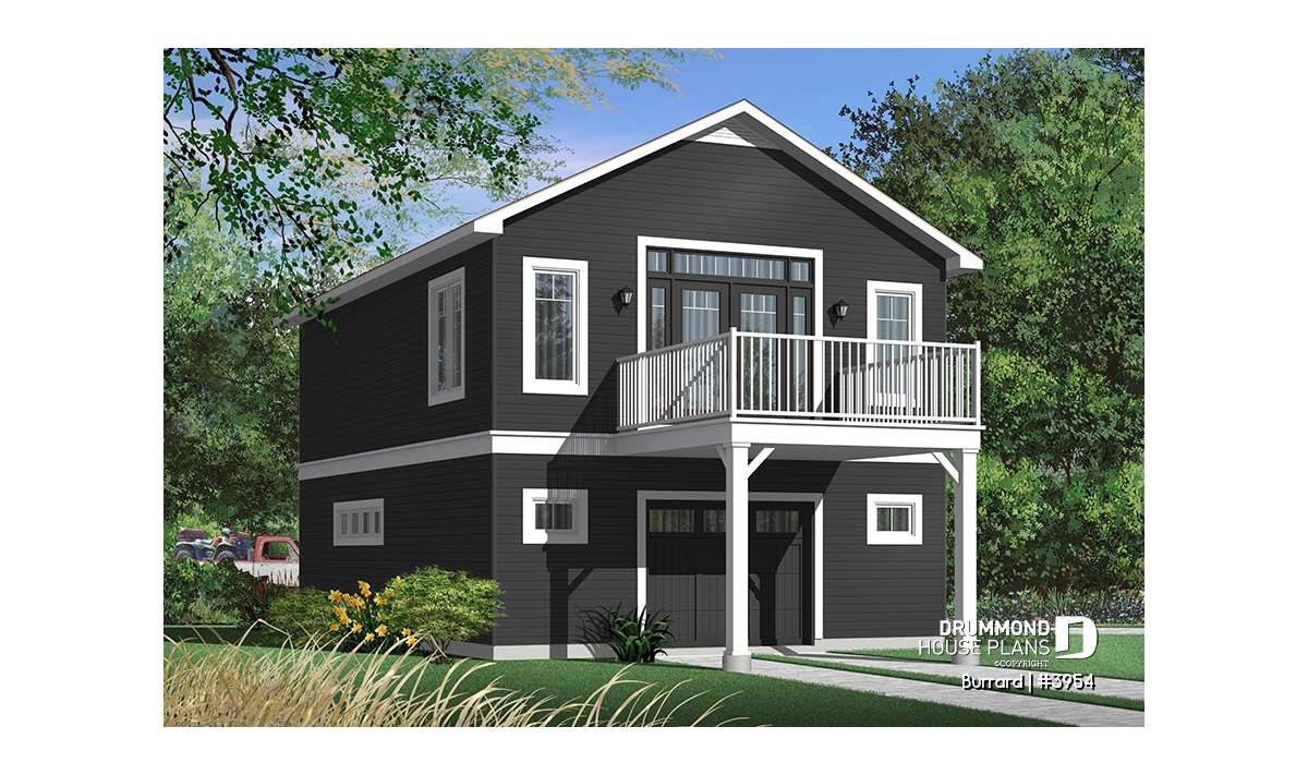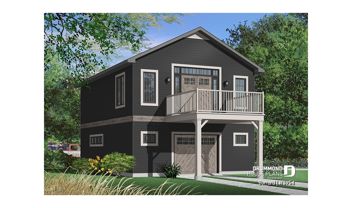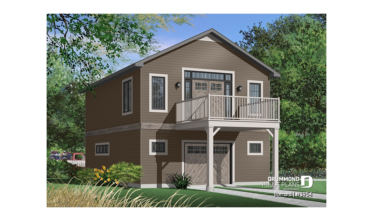 Garage plan with apartment on second floor, tandem style garage + workshop, cathedral ceiling in apartment