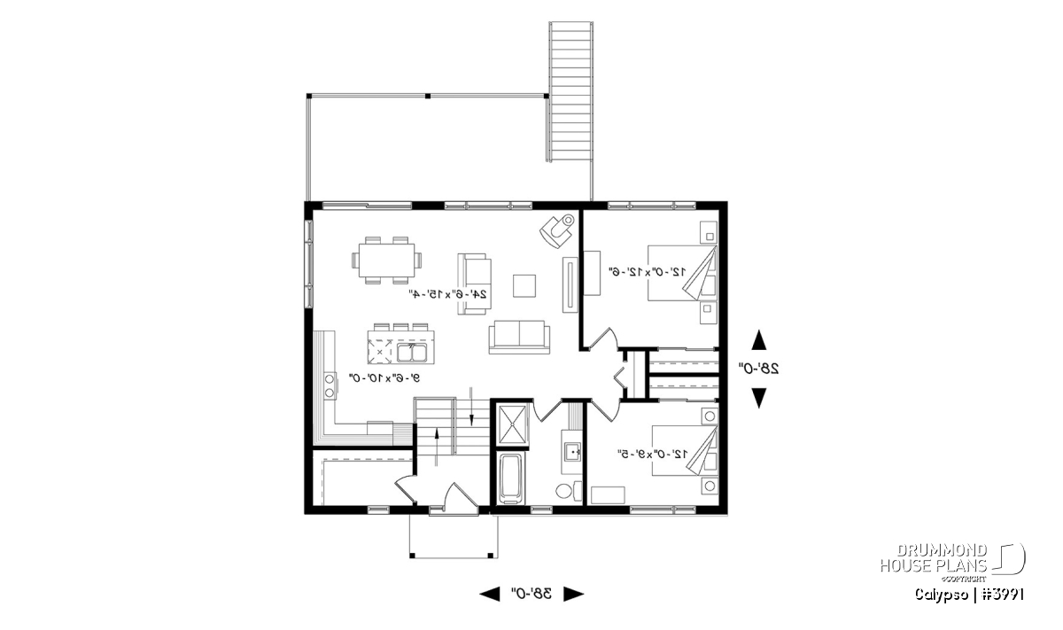 Open kitchen, dining and living floor plan layout.