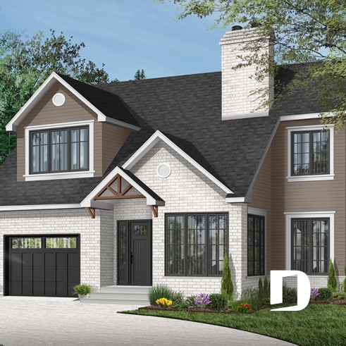 Two-level residence specifically designed for narrow-width lots.