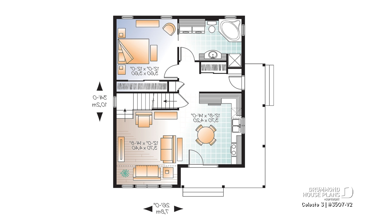 Following the example of plan 3507, this plan offers the open living area complete with generous fenestration in front and a comfortable bedroom with a 10' x 2' closet. Private access to the bathroom, with its laundry area, and a 5' x 2' closet at the service entrance along with a second access to the bathroom permit the owners to enjoy all of the conveniences on the same floor.