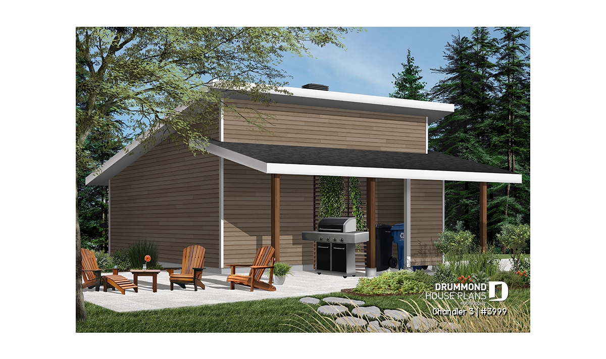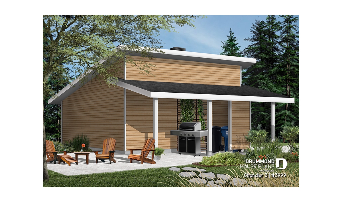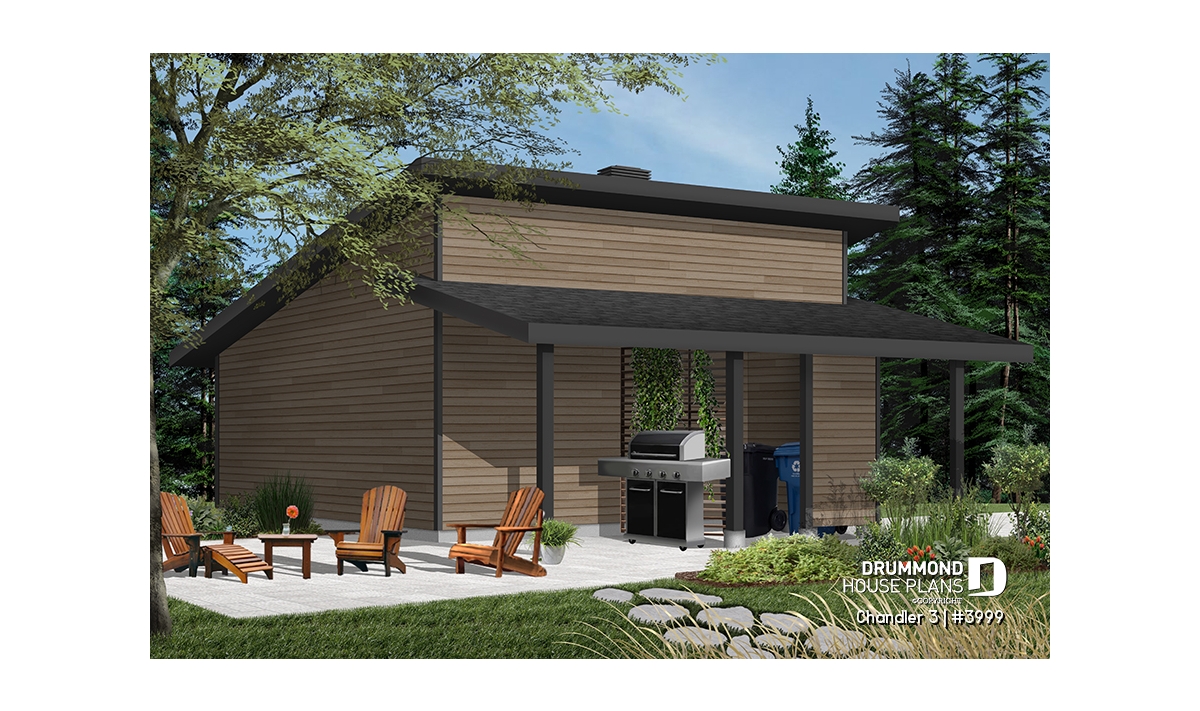 Two-car garage plan with covered side deck, modern style 2-car garage plan