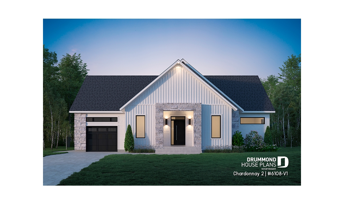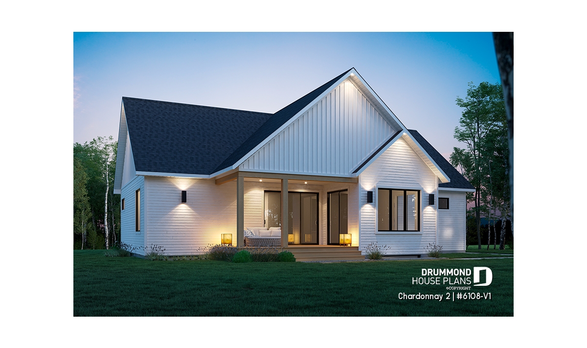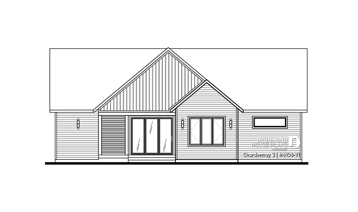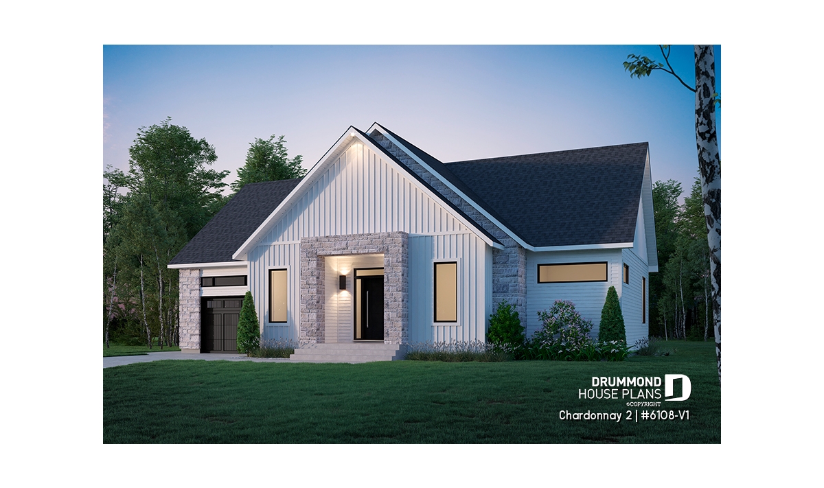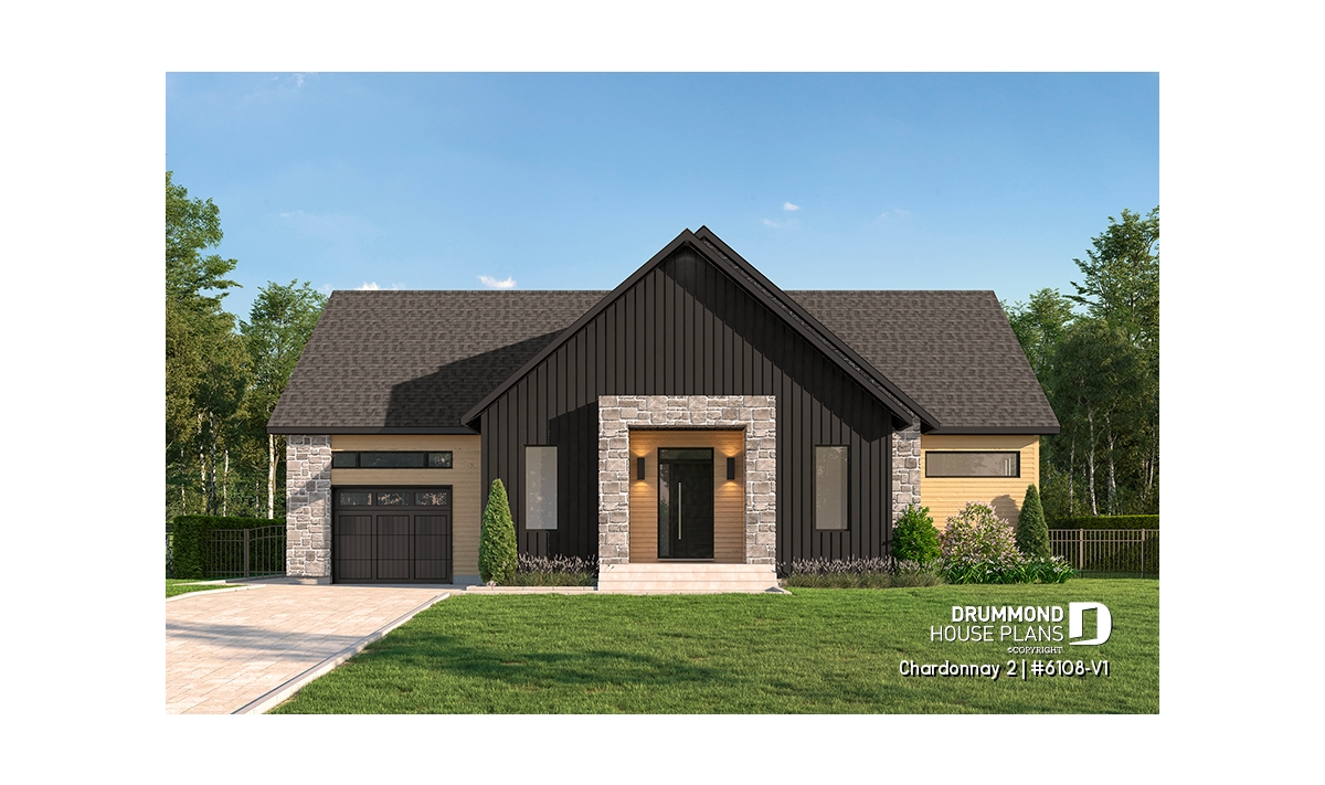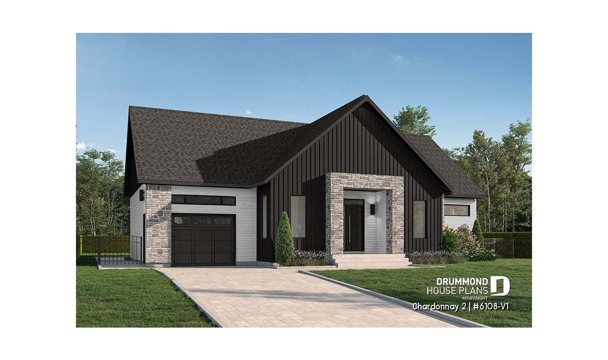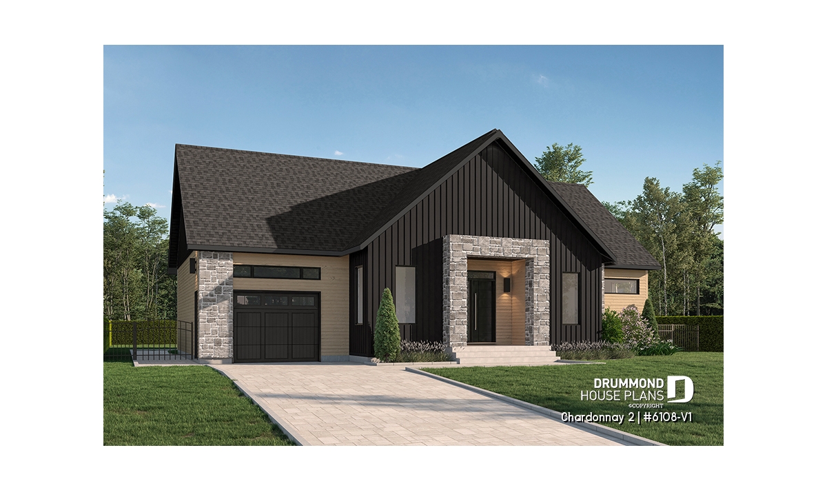 House plan Chardonnay 2 (# 6108-V1) offers 1,487 sq.ft. on a single floor. This modern Scandinavian-style single-storey plan with garage offers a sleek look while maximizing interior and exterior spaces, such as the front balcony and the rear terrace, both of which are covered.